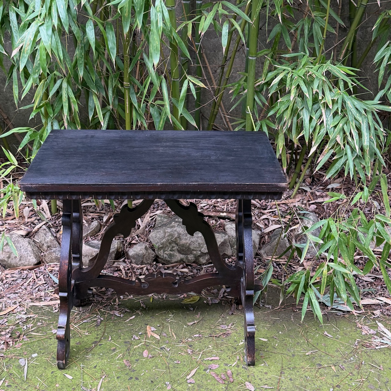Tavolo basso San Filippo in noce a patina bruna, gambe a lira unite da traverse, modanatura a dentelli sulla fascia. Italia, sec. XIX
