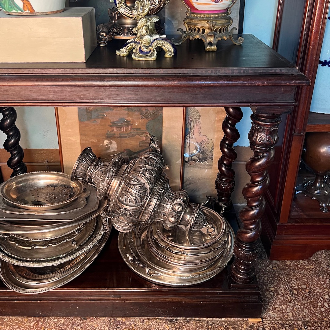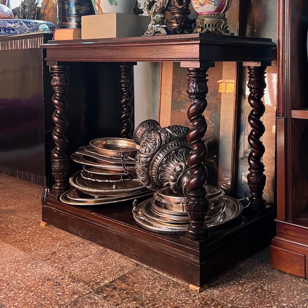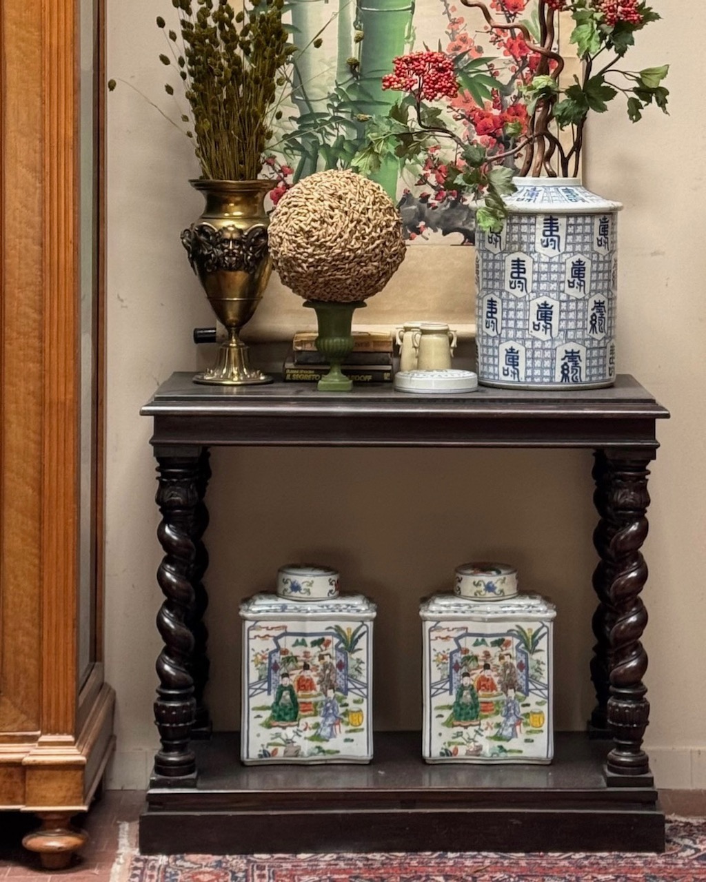 Consolle Romana a Baldacchino in noce a patina bruna poggiante su quattro colonne Torchon con capitelli a foglie d'acanto. Toscana, fine sec. XIX