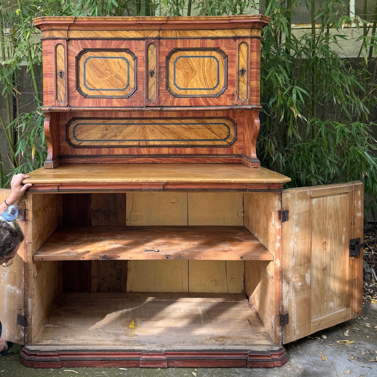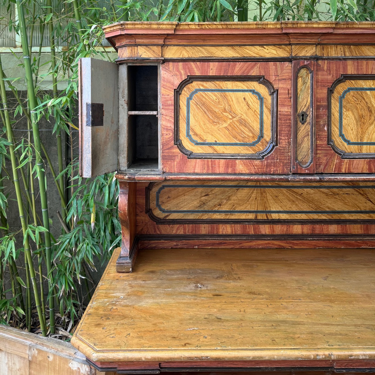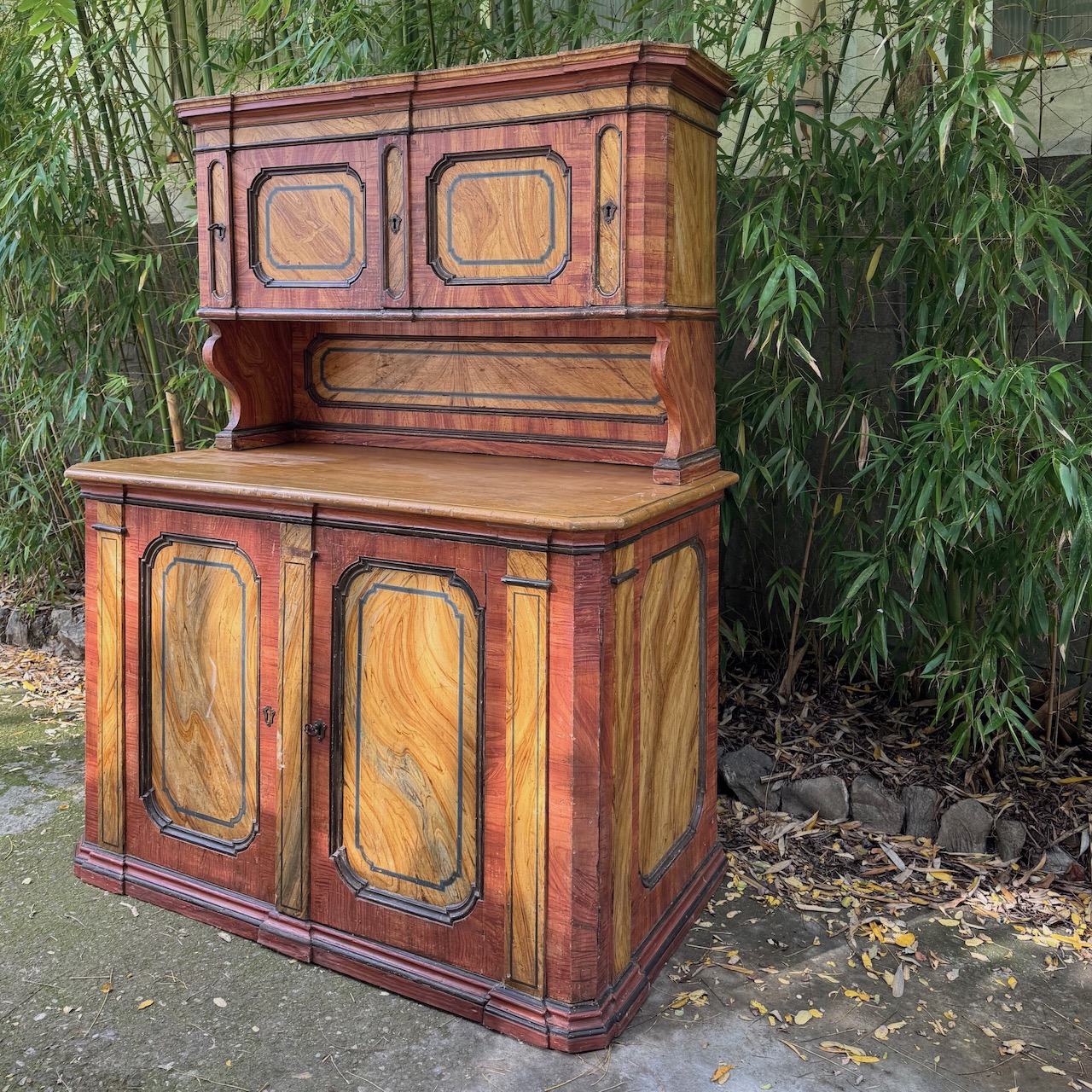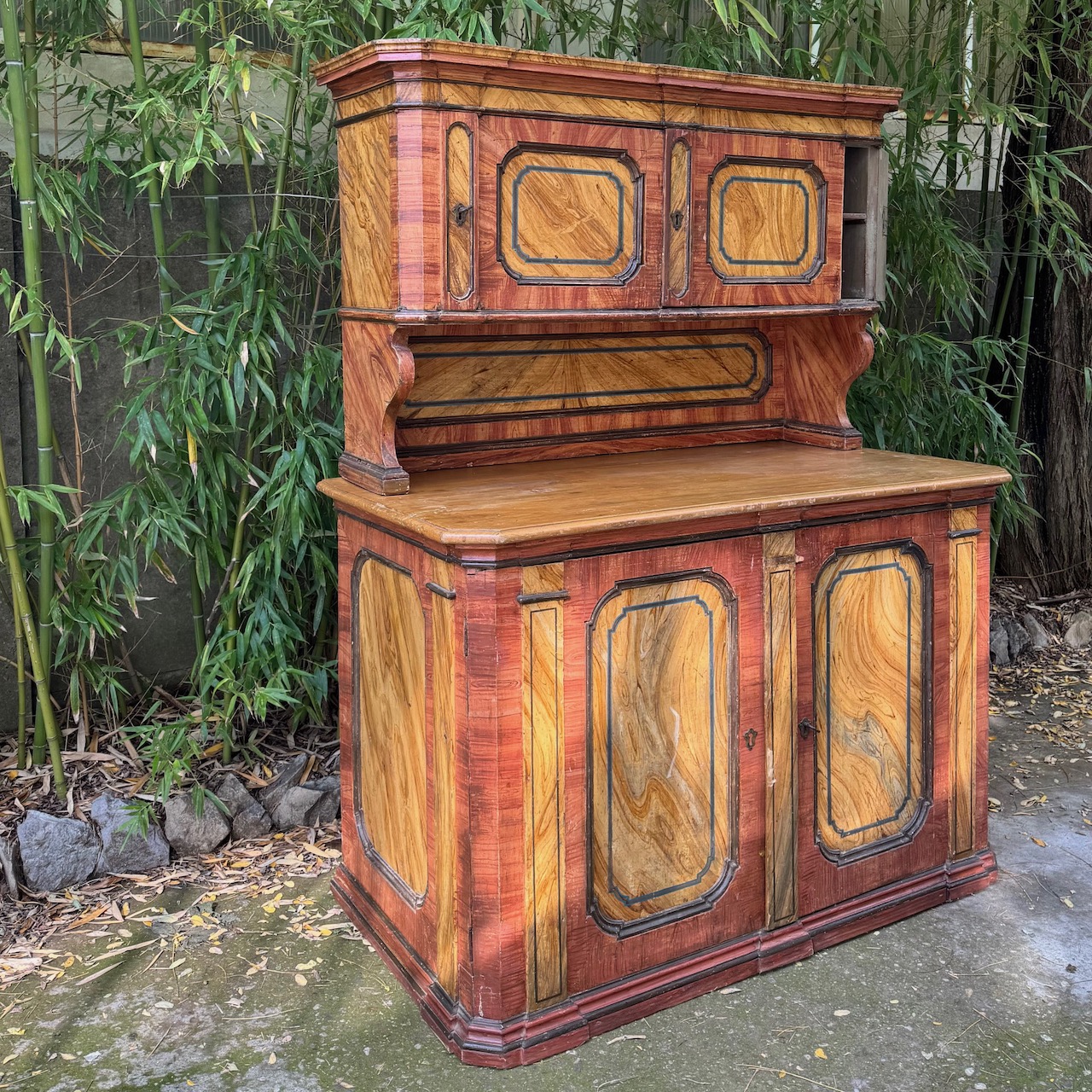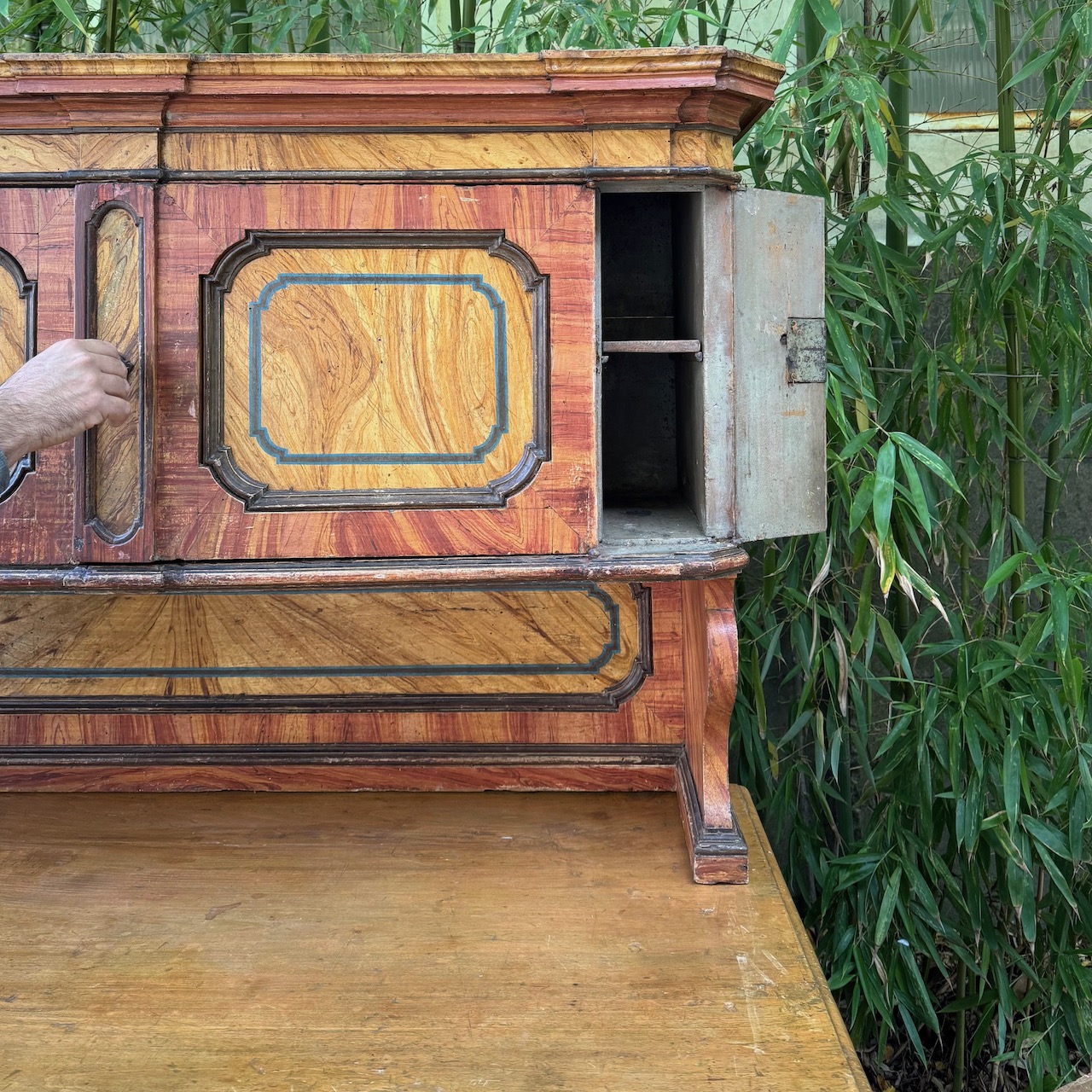 Credenza a due corpi in legno intagliato marmorizzato nei toni dell'ocra e del ruggine con lumeggiature a mecca, nella parte superiore due sportelli con cornici modanate a formare specchiature sagomate e due sottili sportelli laterali, su due sostegni a mensola poggianti sul piano leggermente aggettante; nella parte inferiore due sportelli con la stessa decorazione, tra lesene a colonna piatta, su base a cornice. Italia, seconda metà del sec. XVIII
