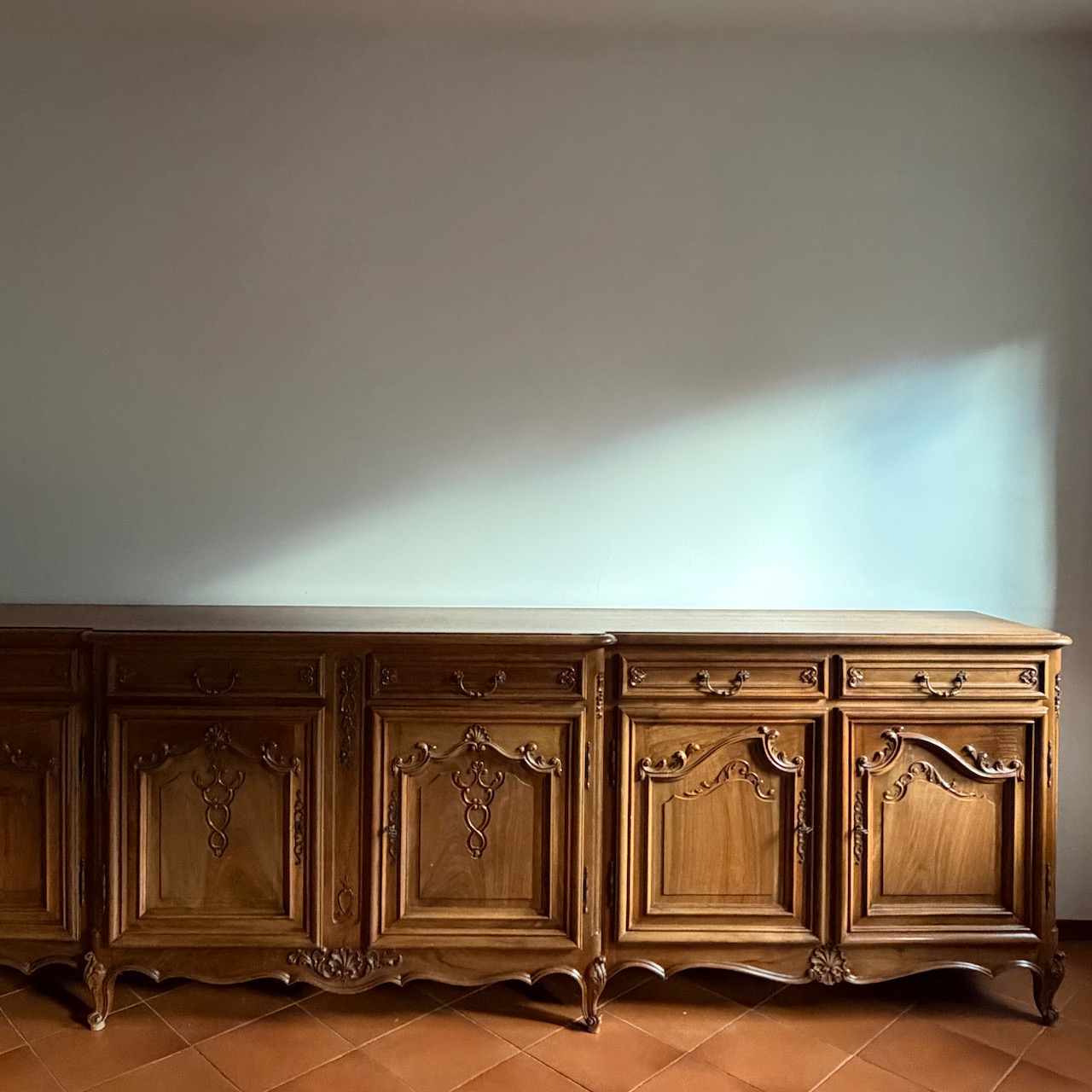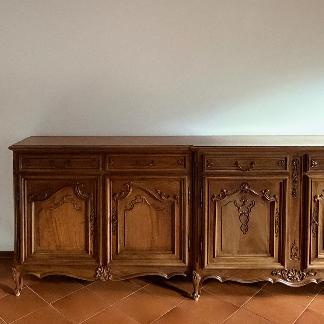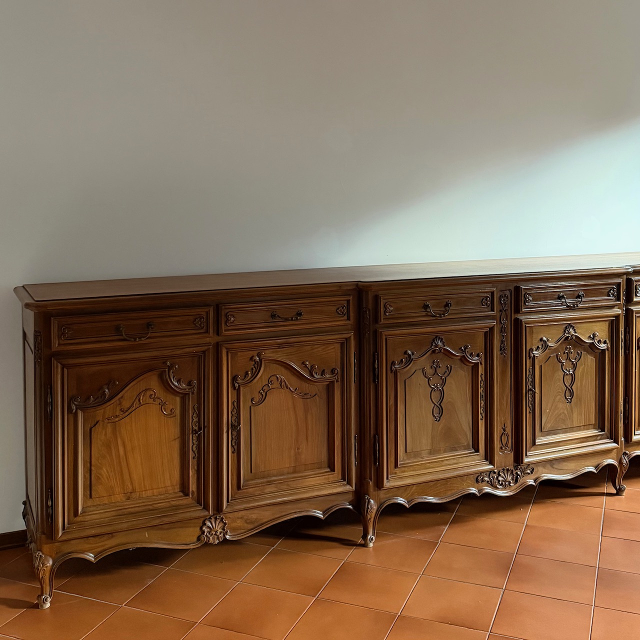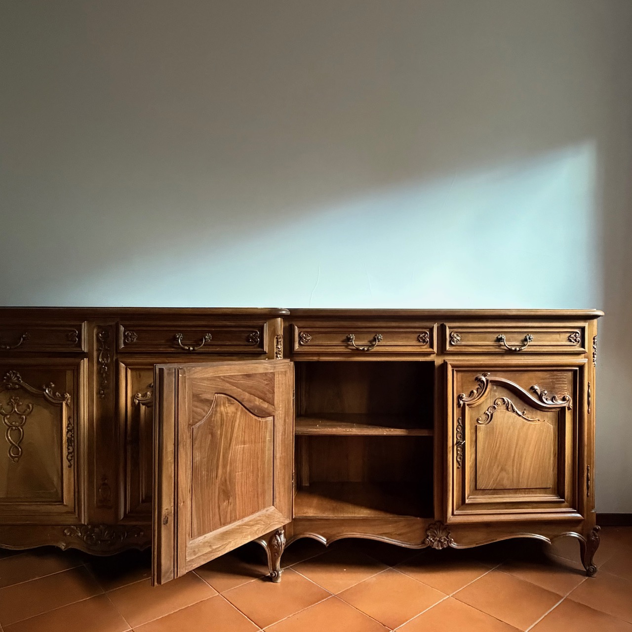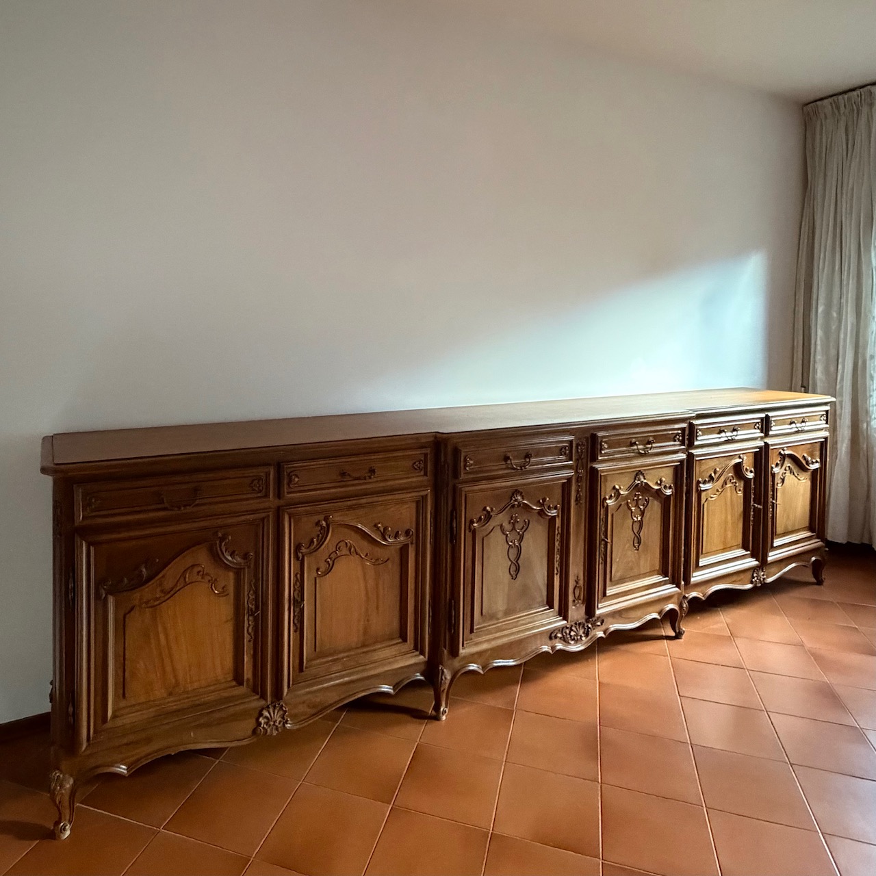 Credenza buffet Luigi XV Regency, in noce intagliato, sei sportelli e sei cassetti. Italia, sec. XX