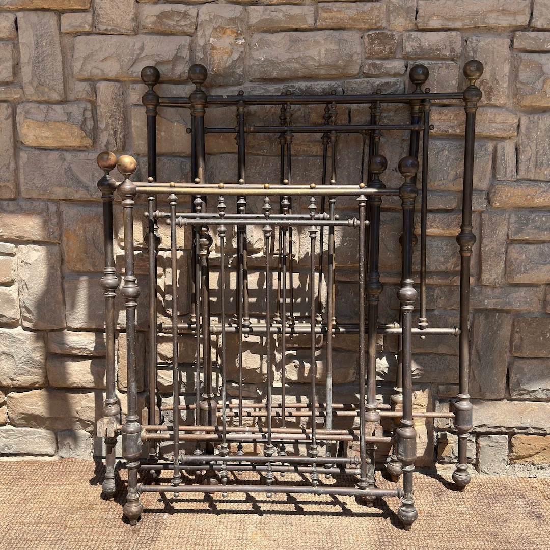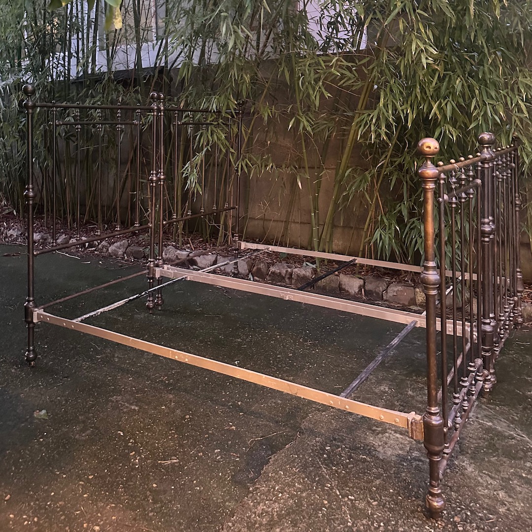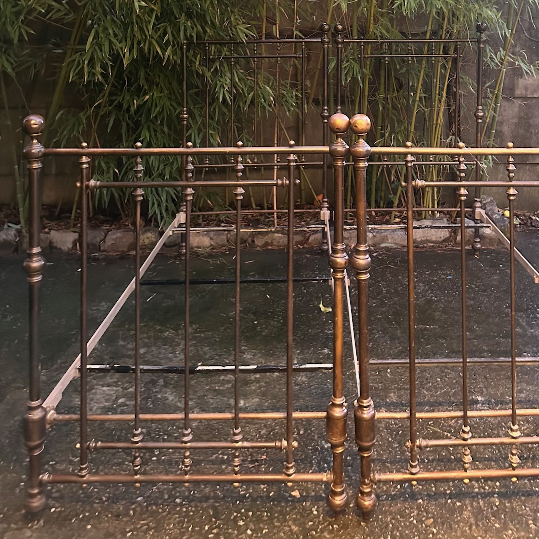 Coppia letti in bronzo a patina bruna completi di fascia e pediera, finali a sfera. Italia, 1880 circa