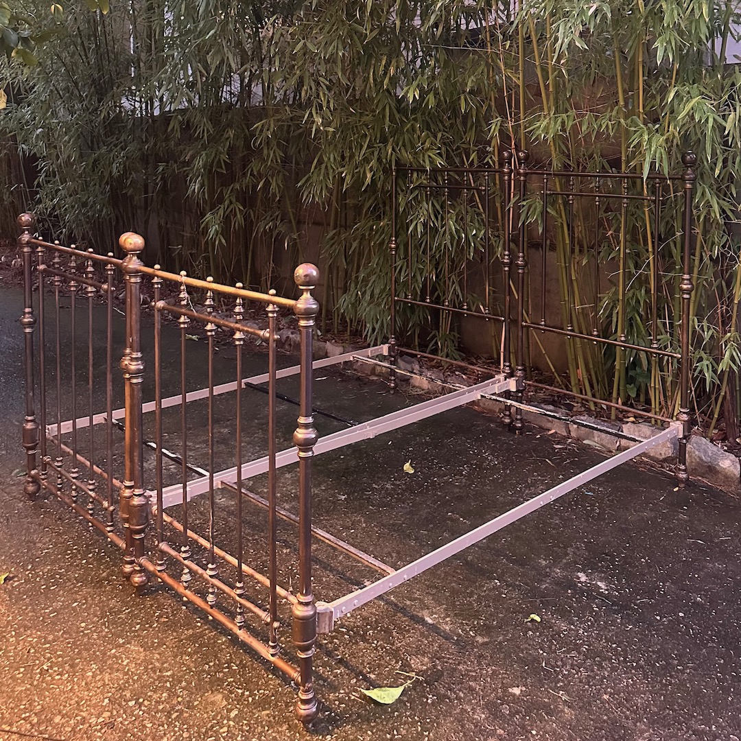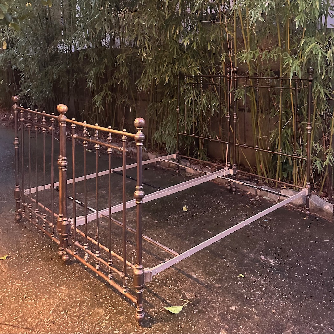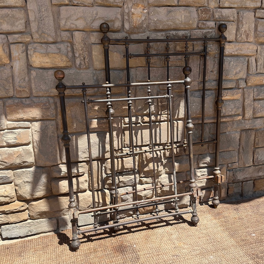 Coppia letti in bronzo a patina bruna completi di fascia e pediera, finali a sfera. Italia, 1880 circa