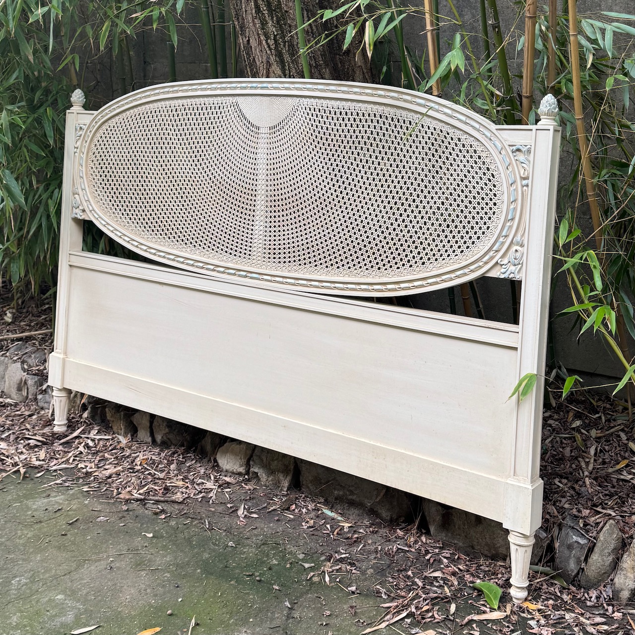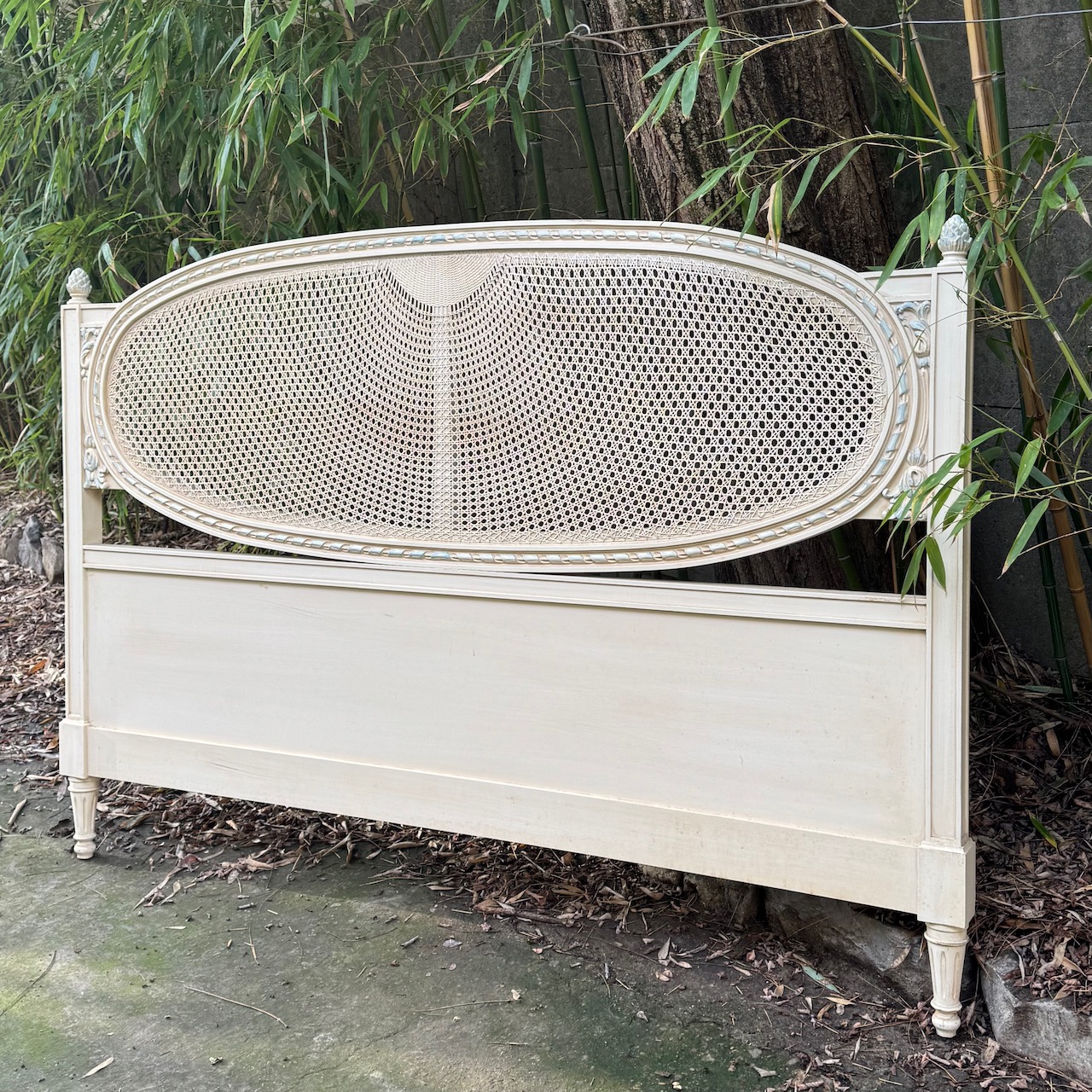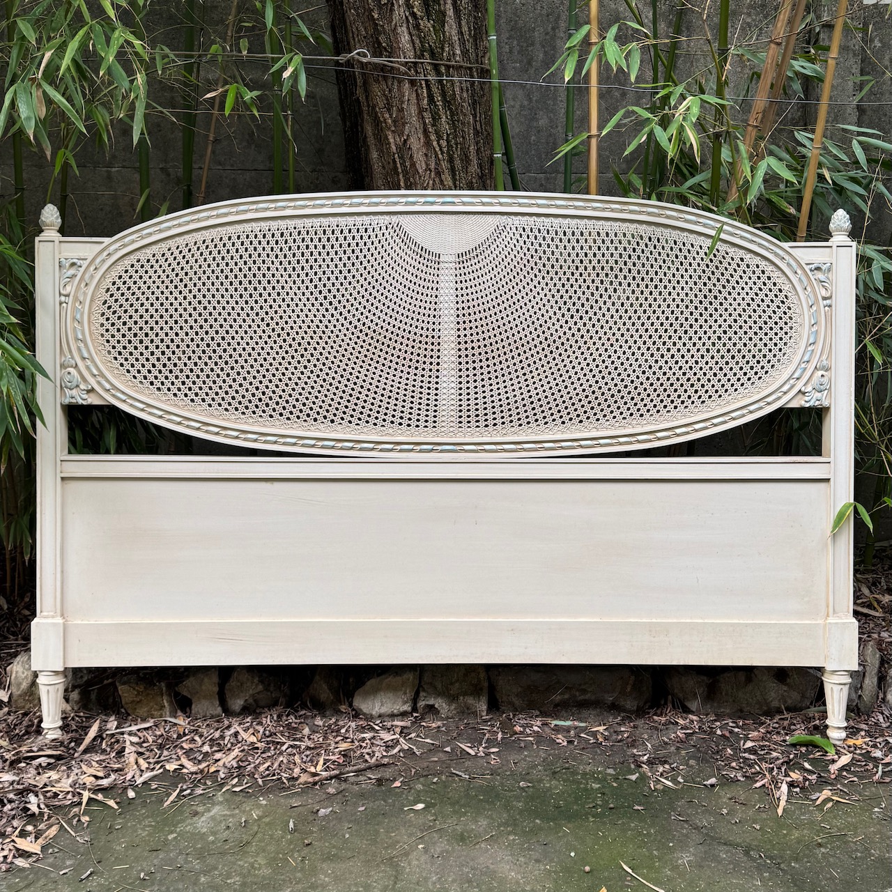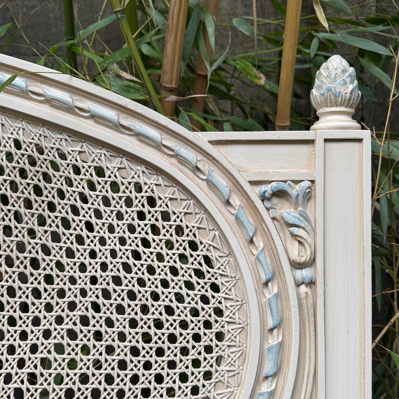 Testiera letto Luigi XVI, in legno laccato ghiaccio, cornice ovale intagliata con dettagli azzurri e paglia di Vienna. Francia sec. XIX