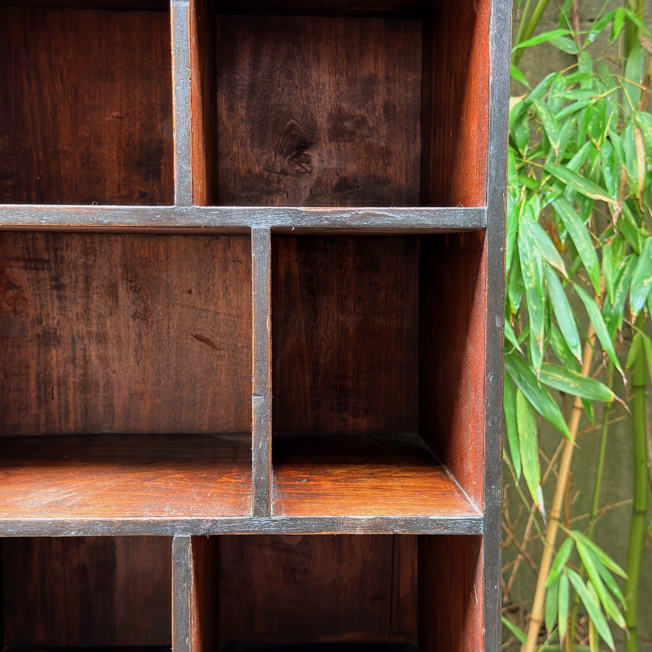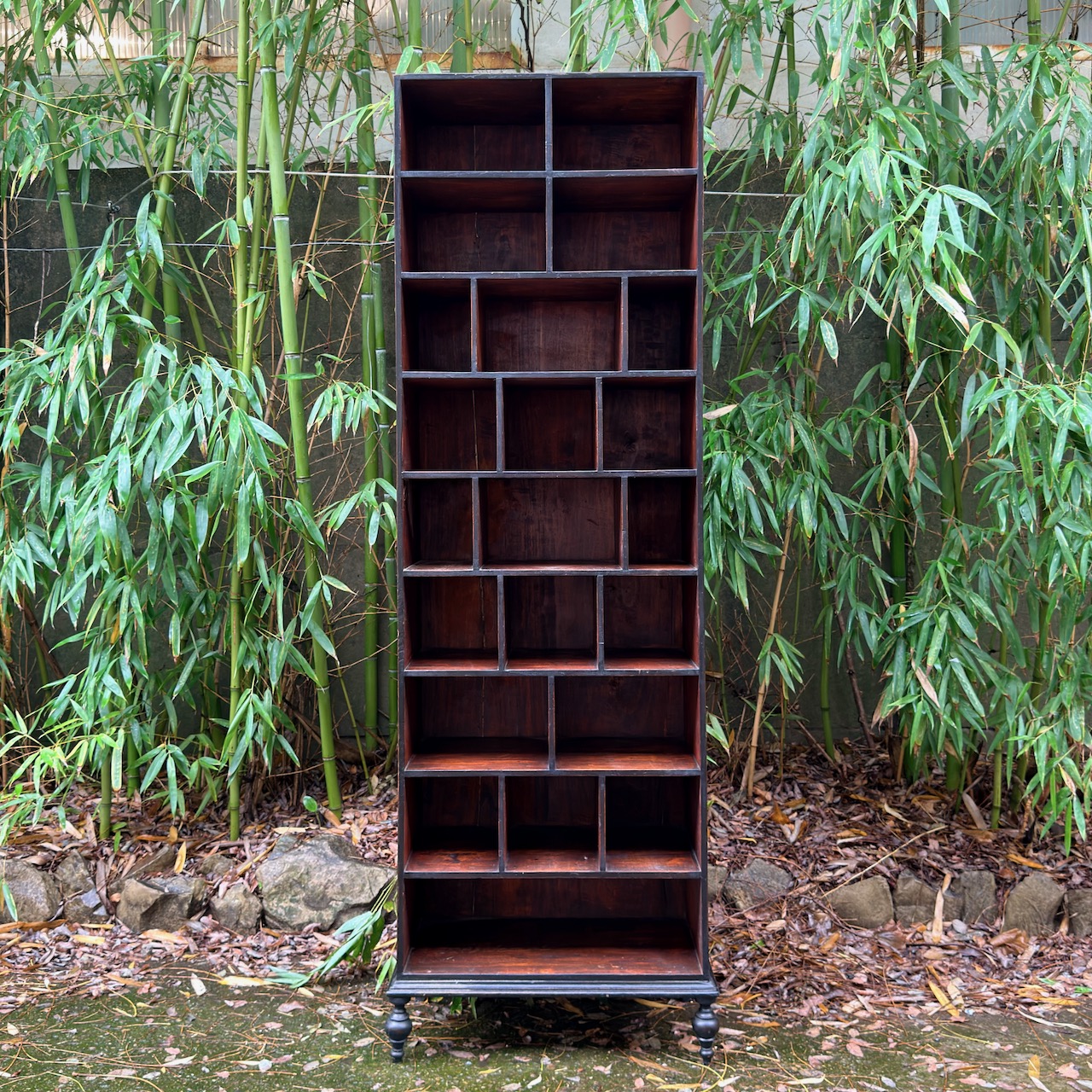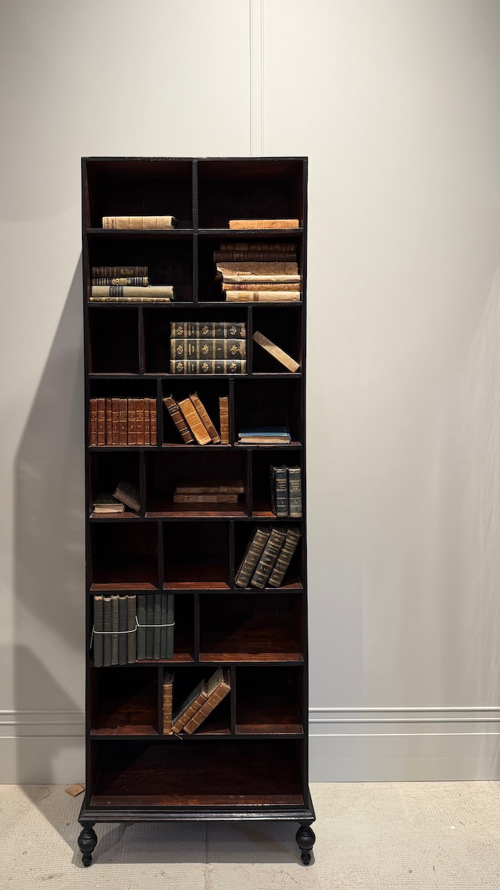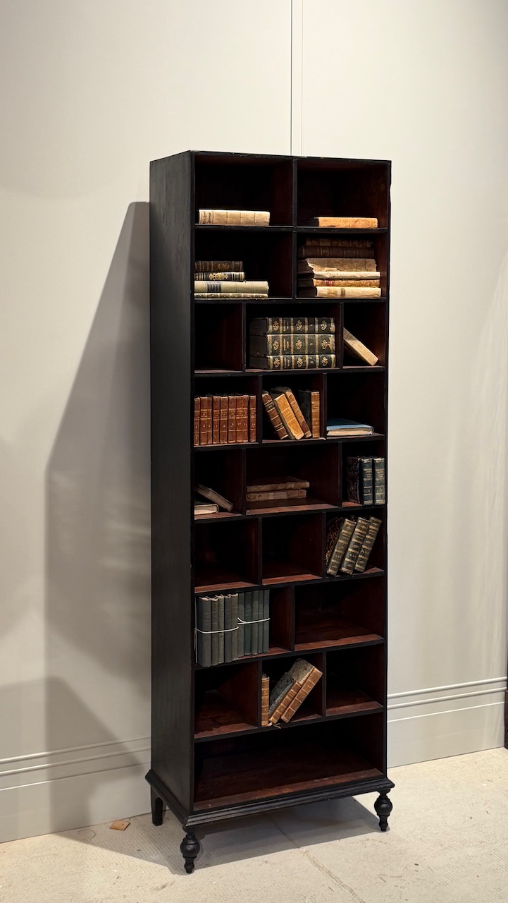 Libreria etagere in gattice a patina bruna in parte ebanizzata , a scomparti di varie dimensioni. Toscana fine sec. XIX