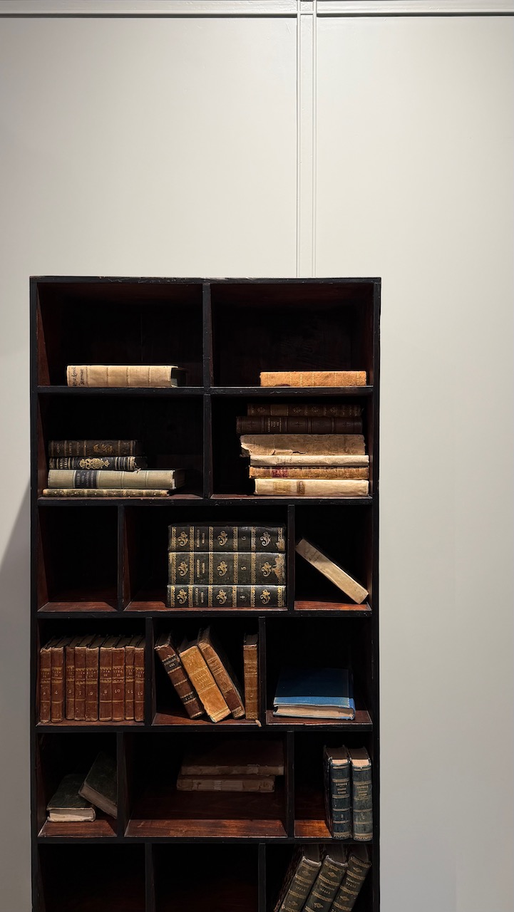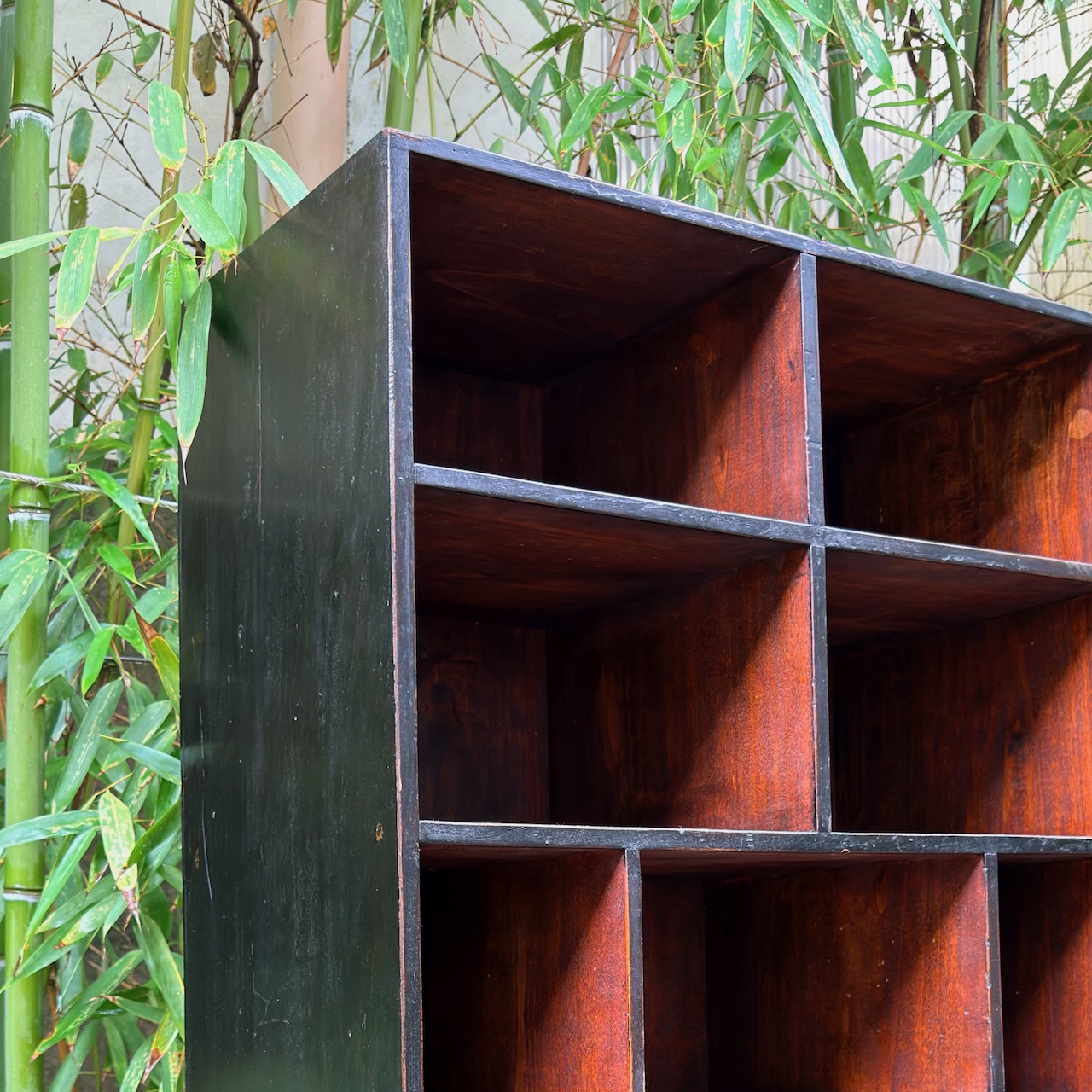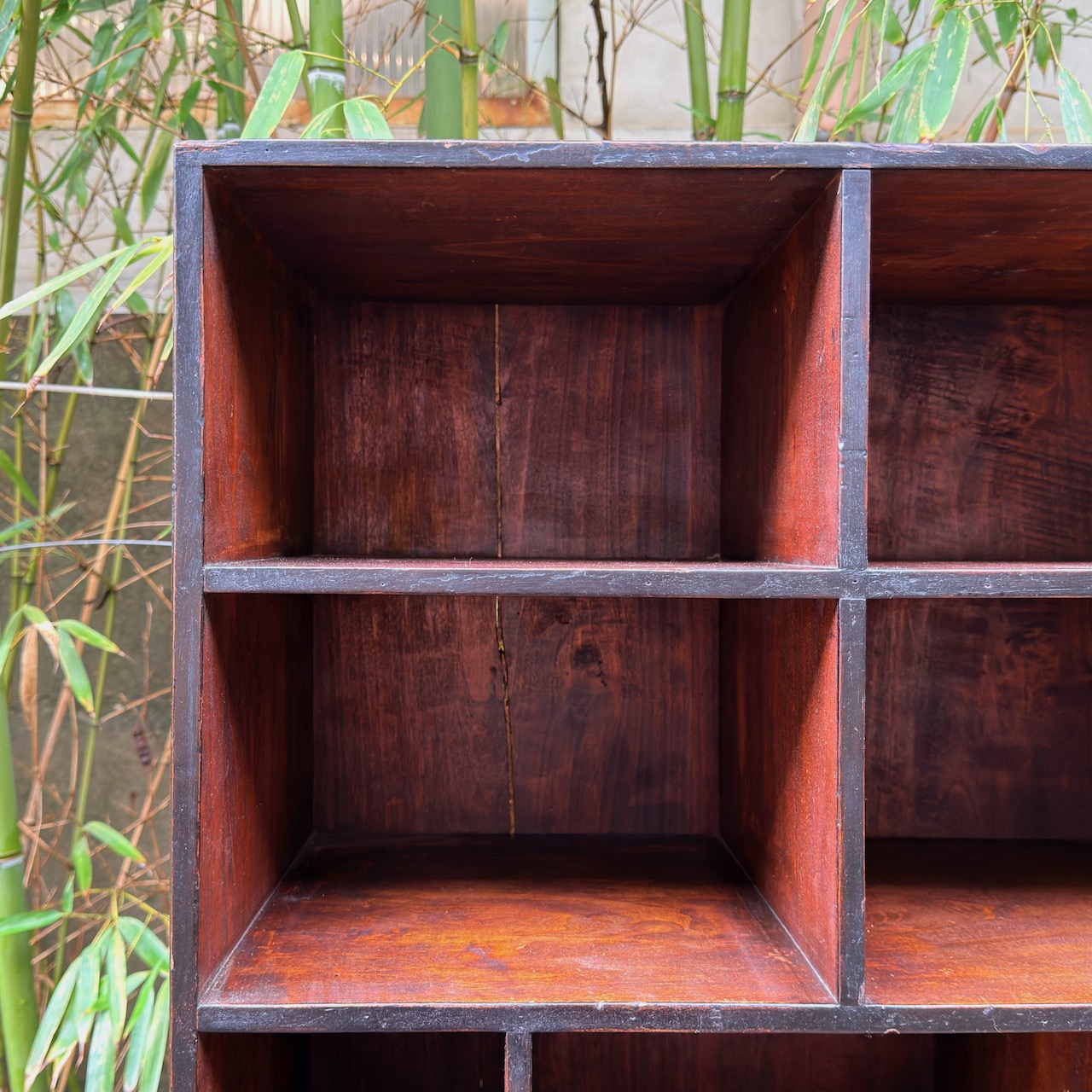 Libreria etagere in gattice a patina bruna in parte ebanizzata , a scomparti di varie dimensioni. Toscana fine sec. XIX