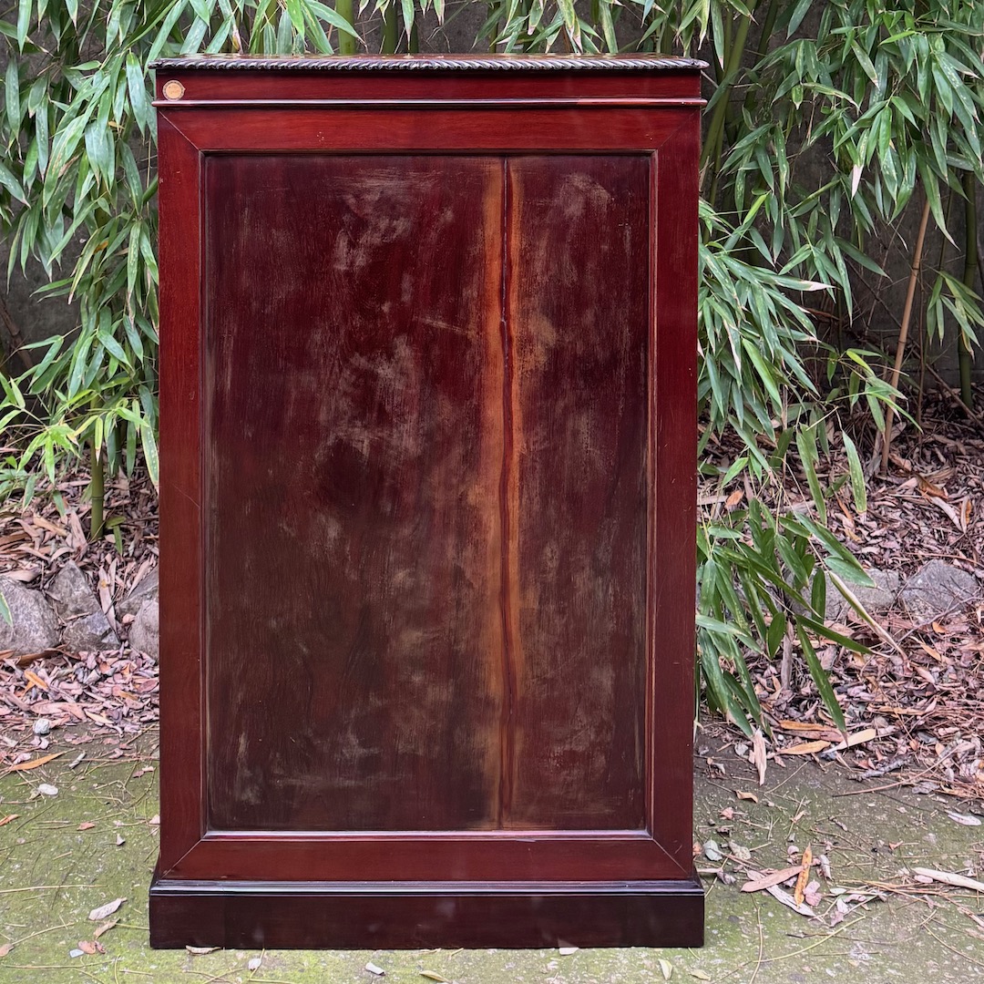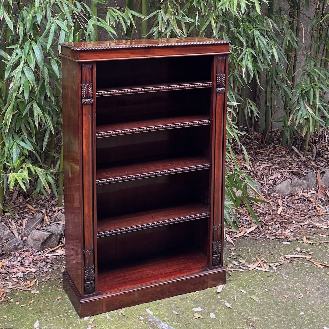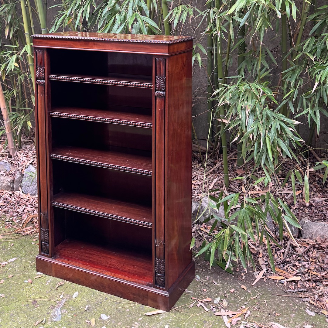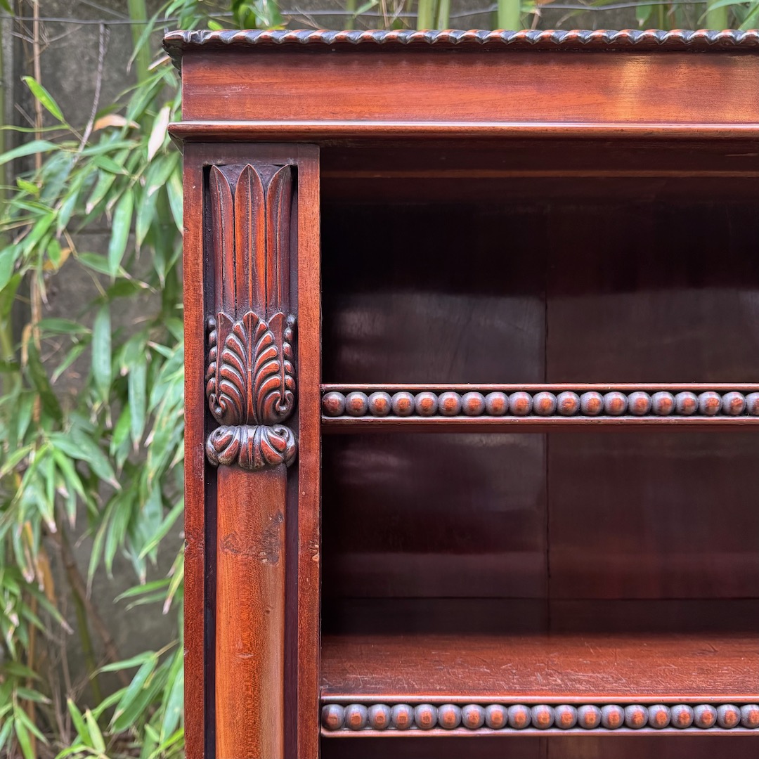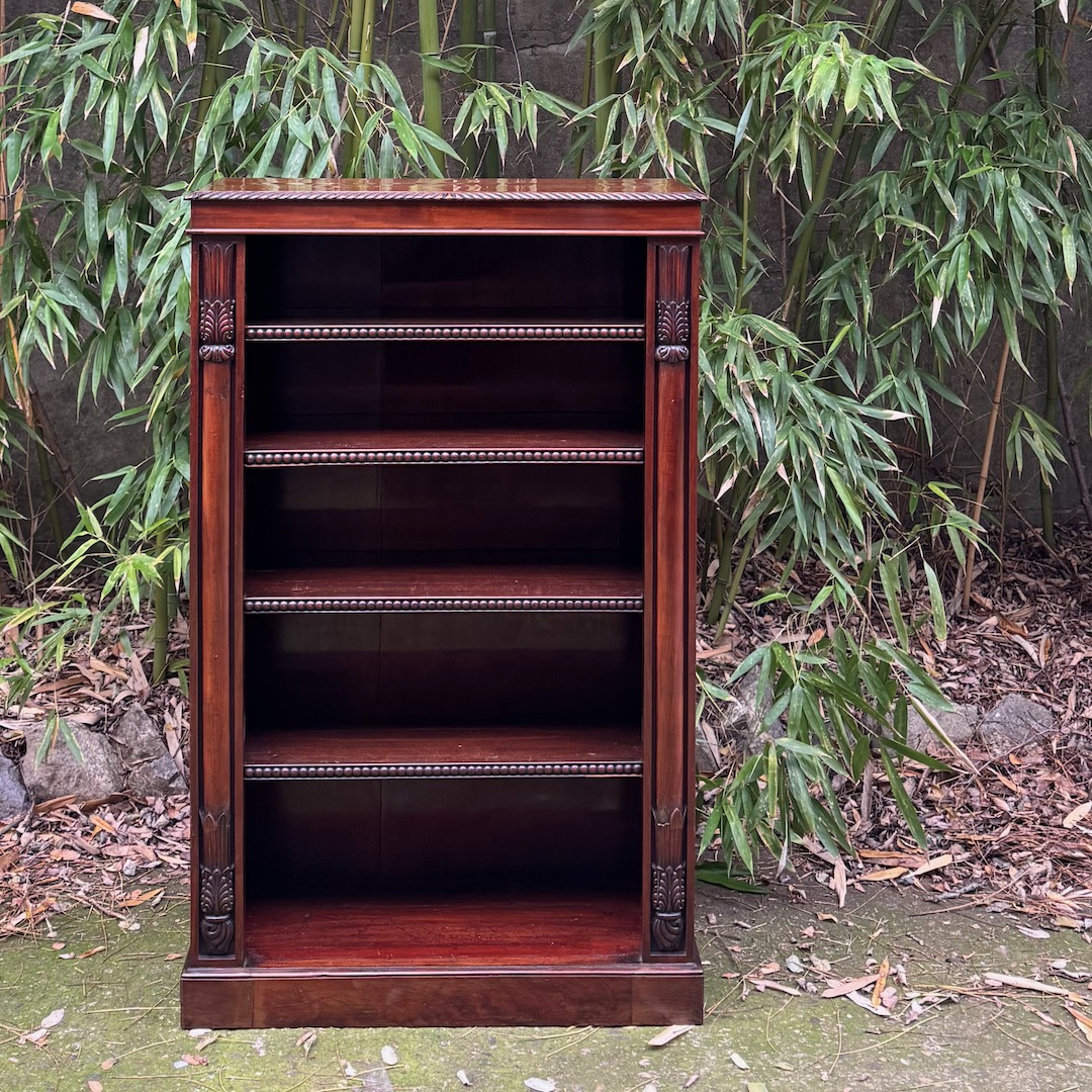 Piccola libreria da centro a plinto in mogano, profilo e montanti a lesene intagliati, piede a fascia continua. Inghilterra, inizio sec. XIX