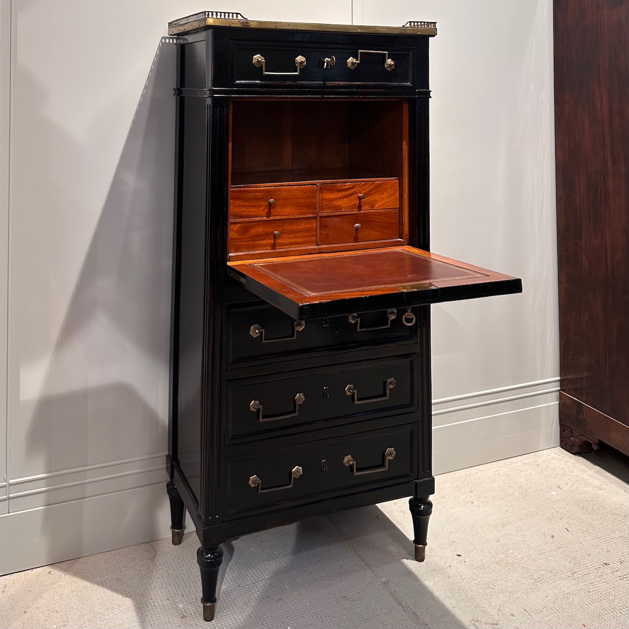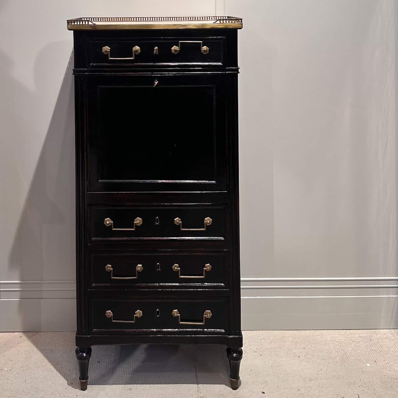 Secretaire in mogano ebanizatto a quattro cassetti, sportello a ribalta rivestito in pelle, quattro cassetti interni, piano in marmo bianco. Francia, inizi sec. XX