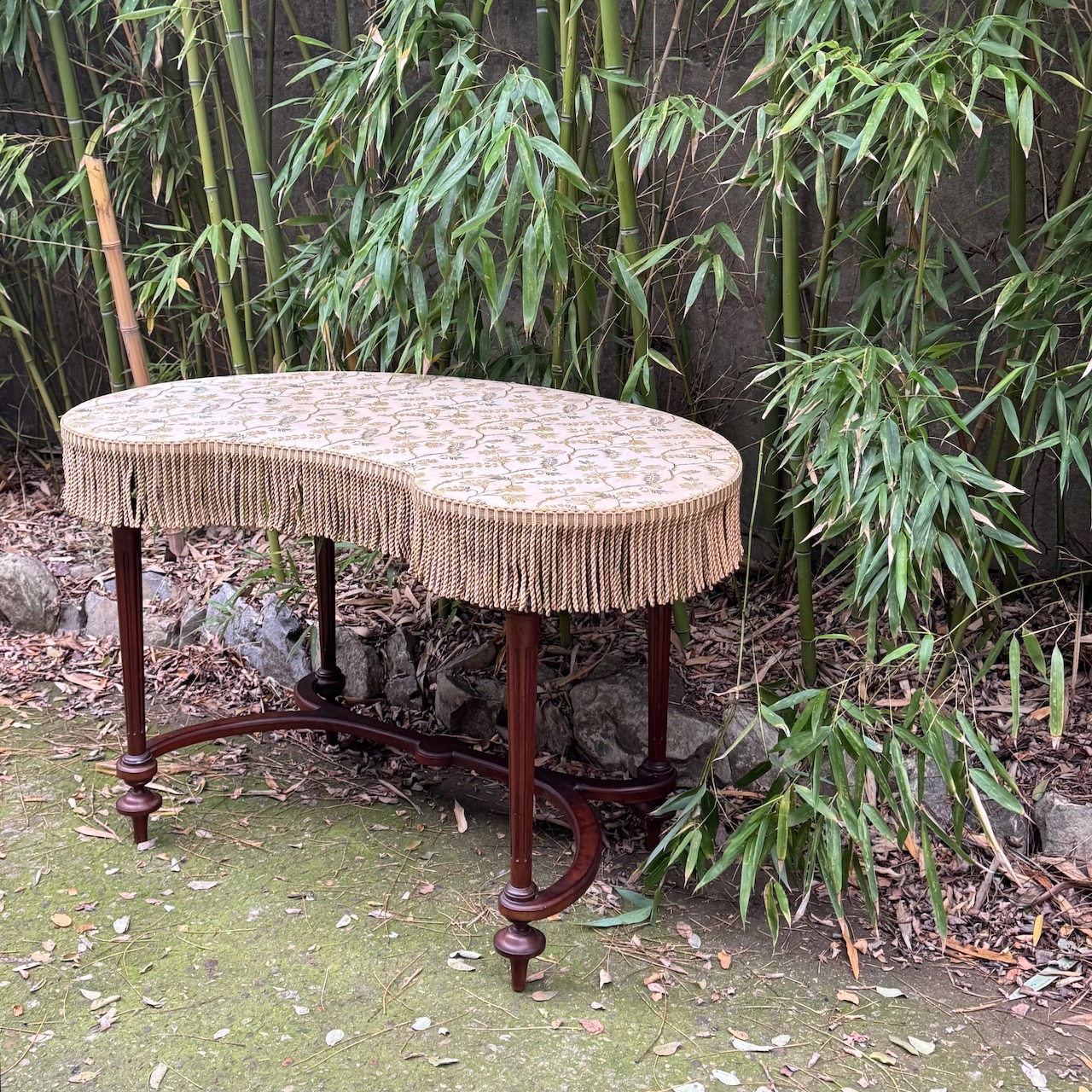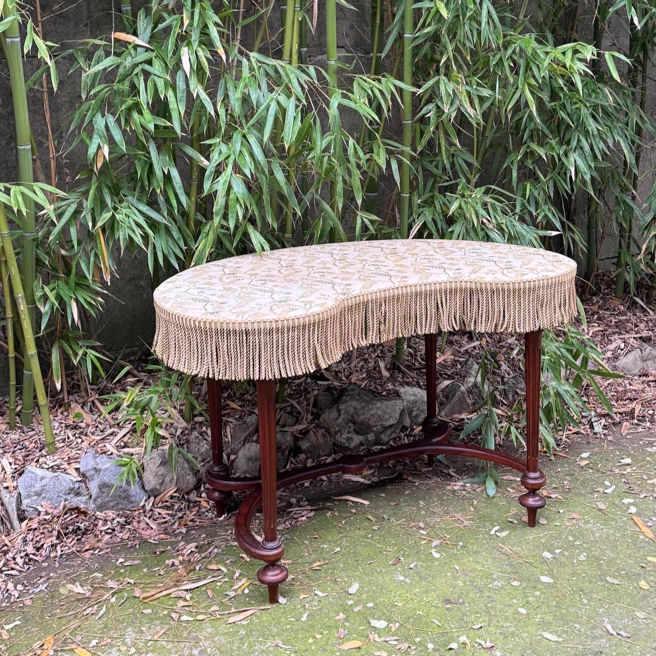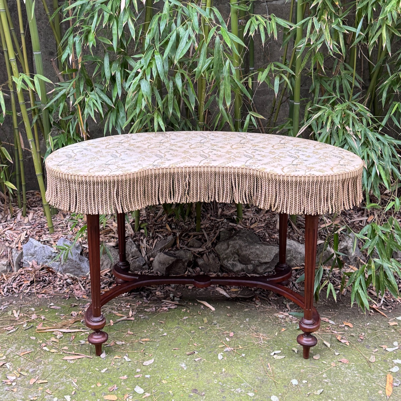Toilette a fagiolo in legno, gambe intagliate unite da traverse a ricciolo, piano rivestito in tessuto jacquard a fondo neutro, passamaneria a frange sulla fascia. Inghilterra, sec. XIX