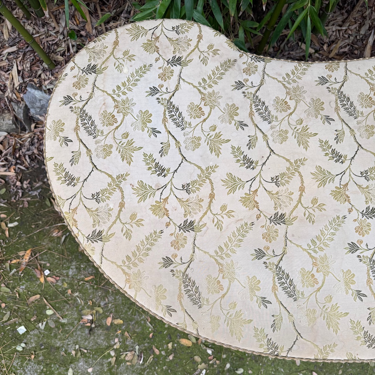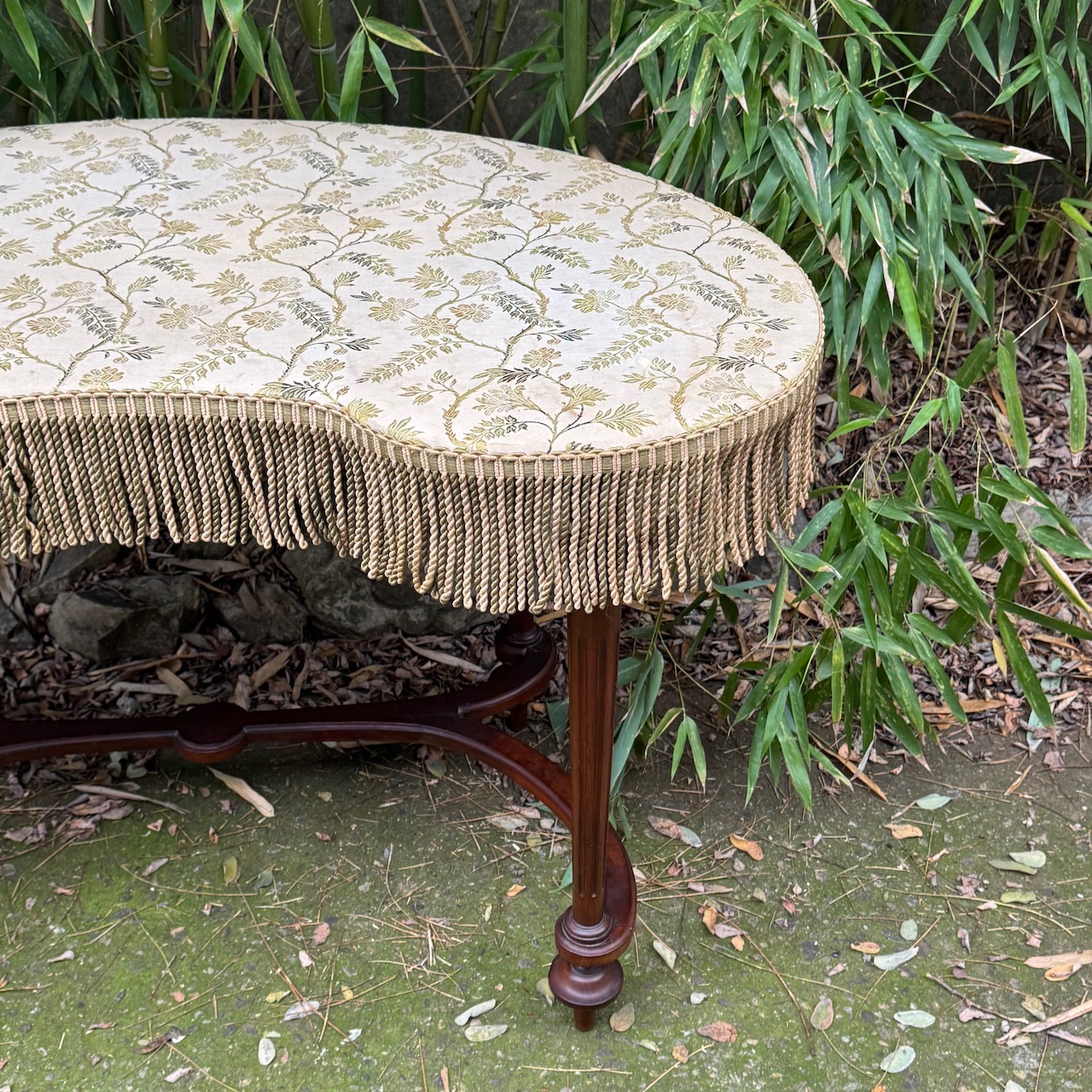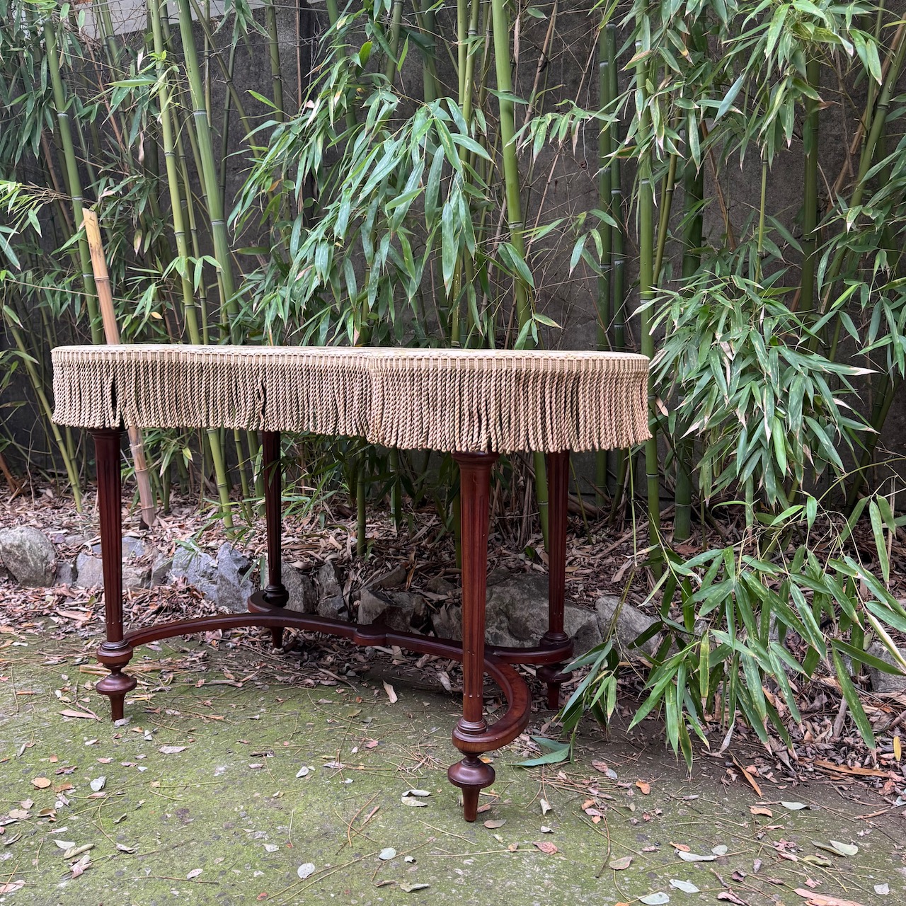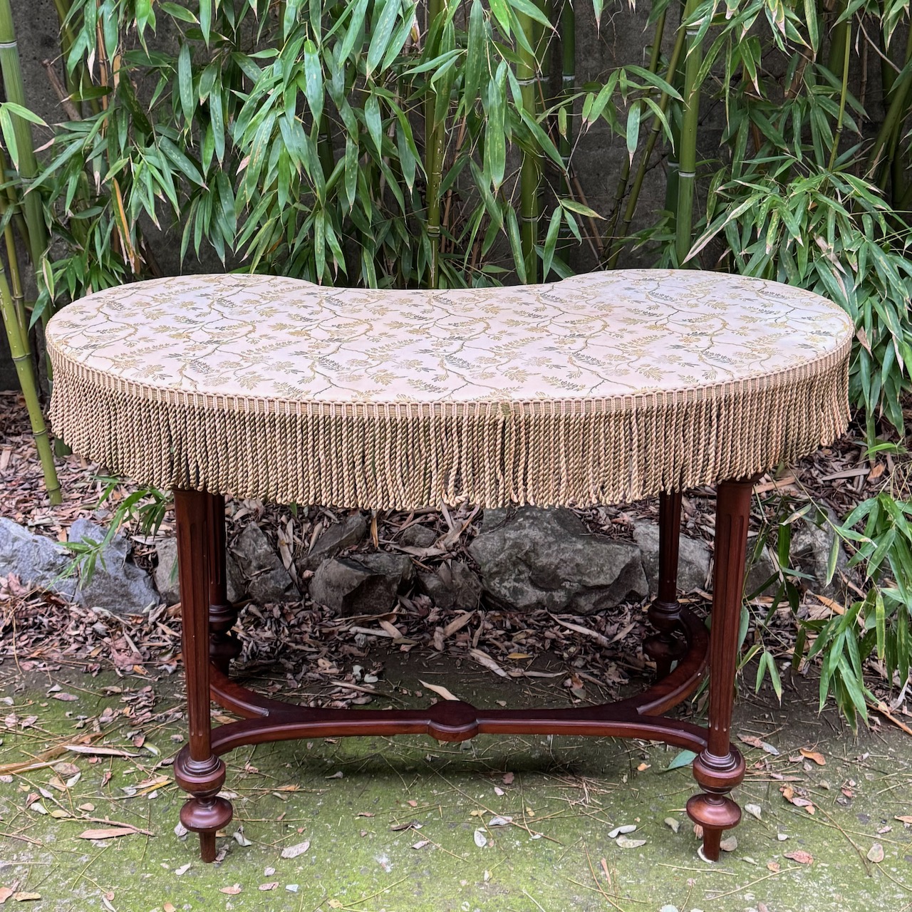 Toilette a fagiolo in legno, gambe intagliate unite da traverse a ricciolo, piano rivestito in tessuto jacquard a fondo neutro, passamaneria a frange sulla fascia. Inghilterra, sec. XIX