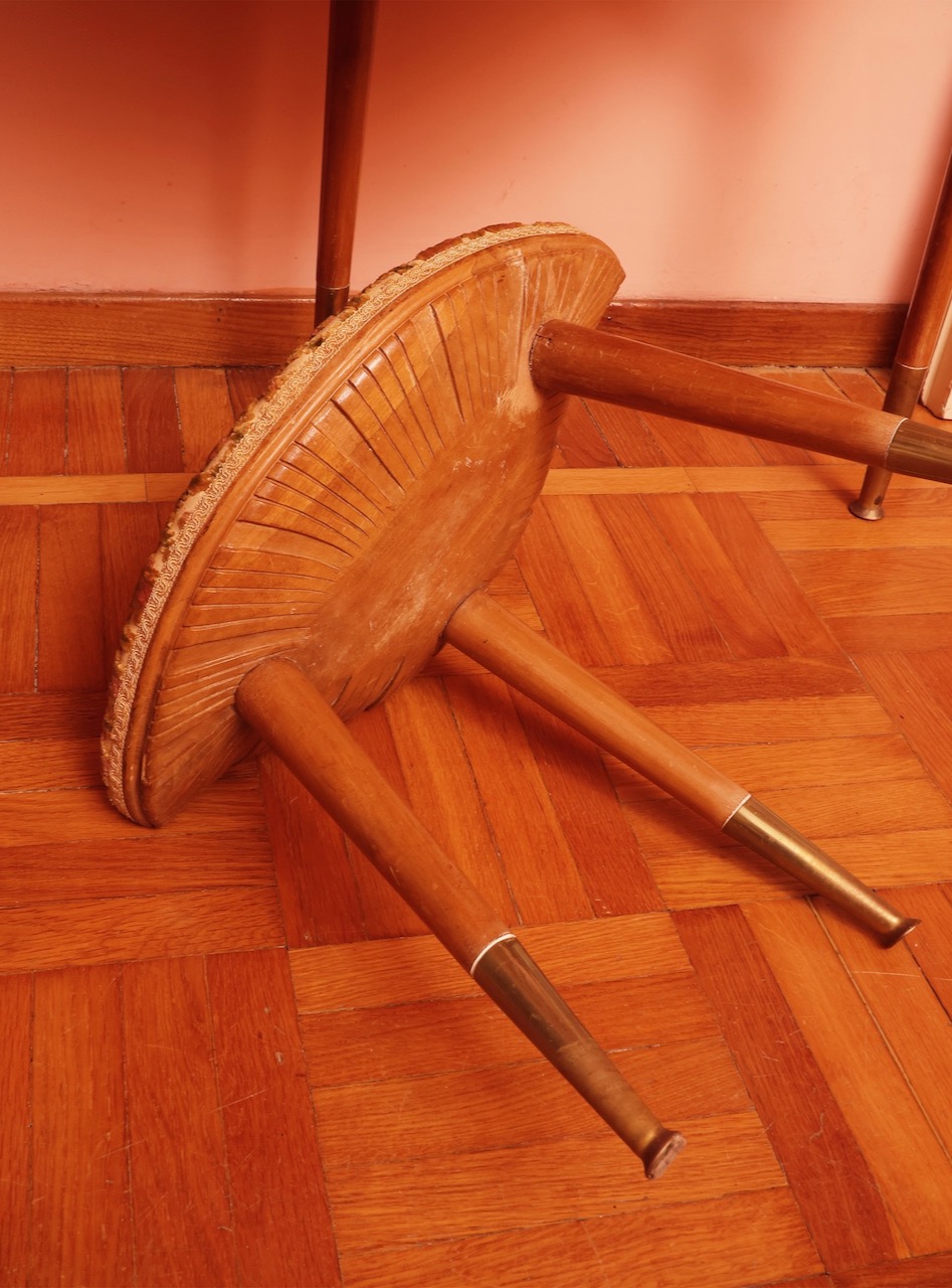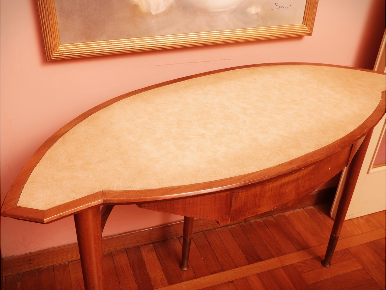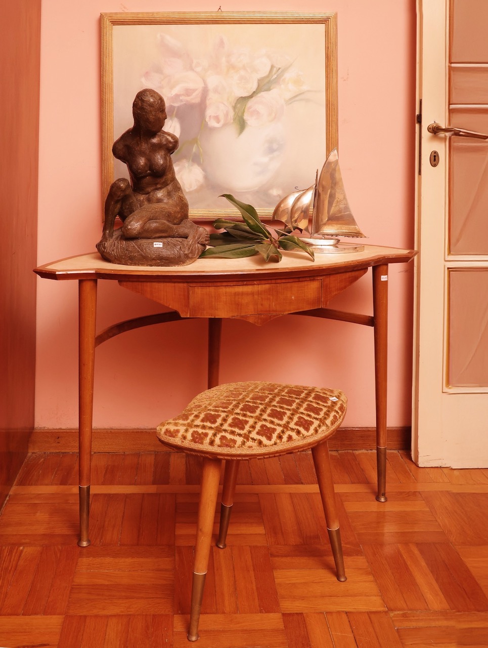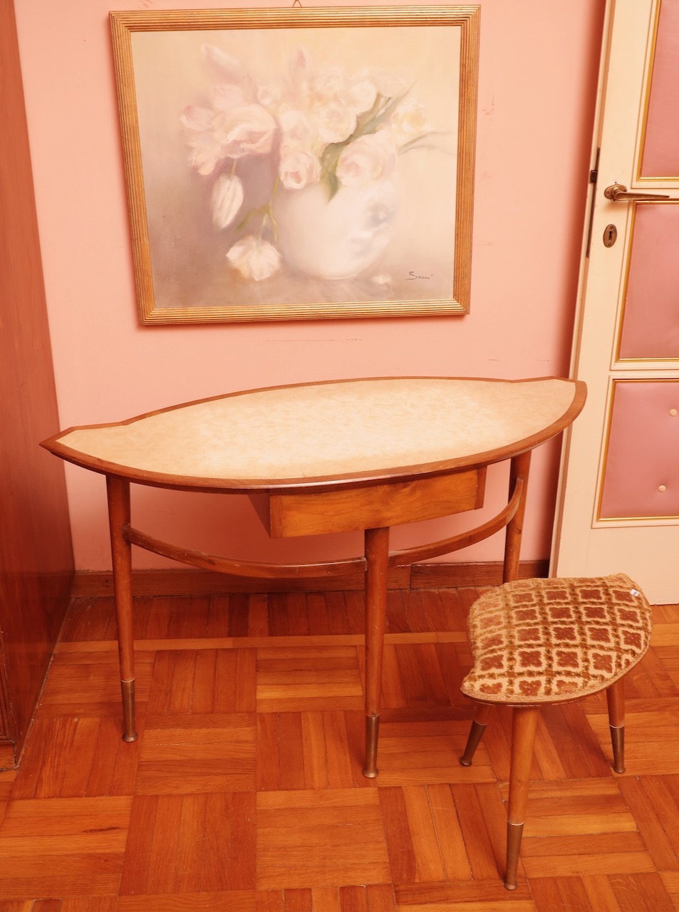 Toilette a fagiolo in satinwood, piano sagomato in laminato avorio, cassetto nella fascia, gambe a spillo con estremità in ottone, e sgabello con seduta imbottita rivestita in tela broccato. Italia 1950 ca