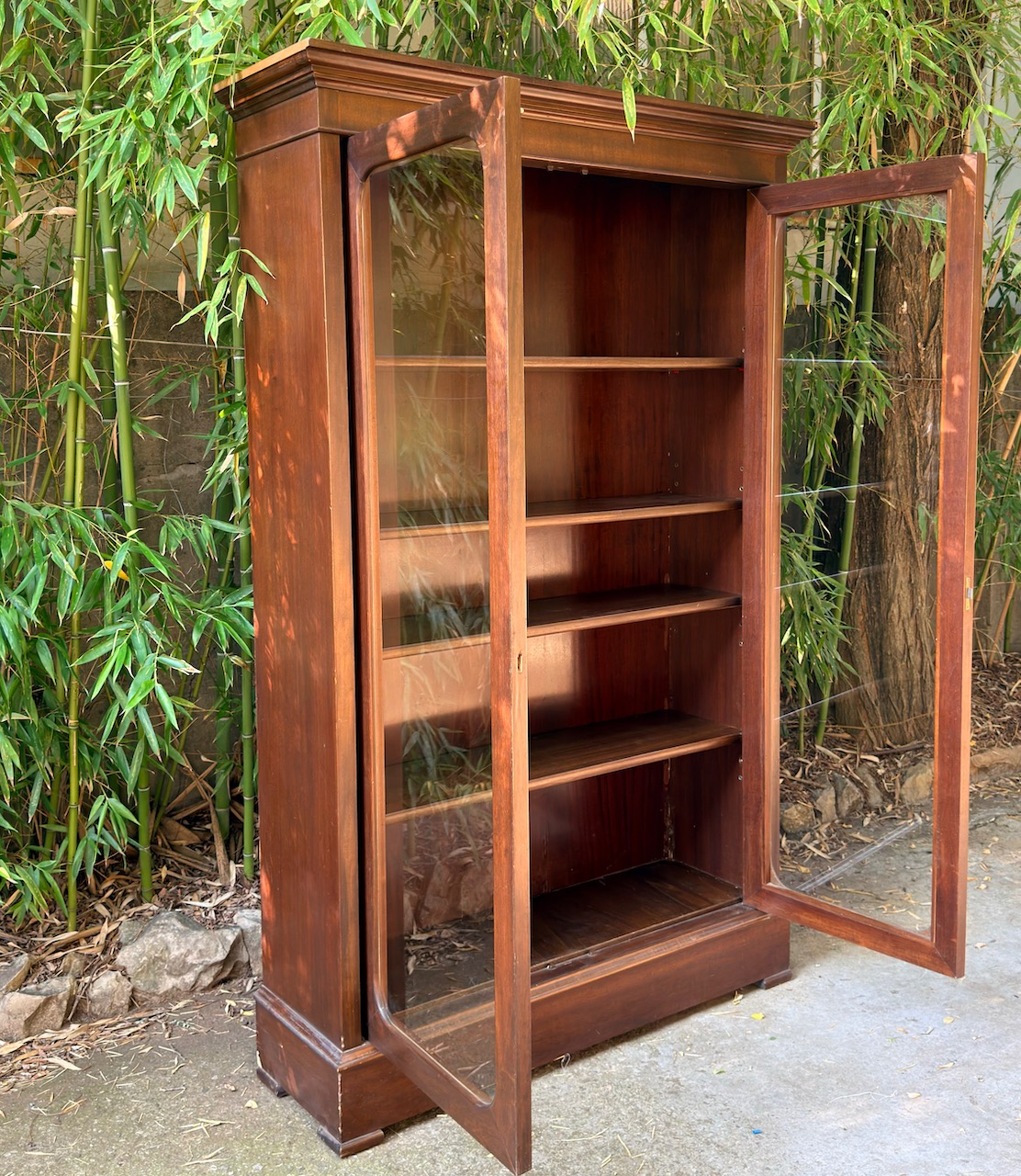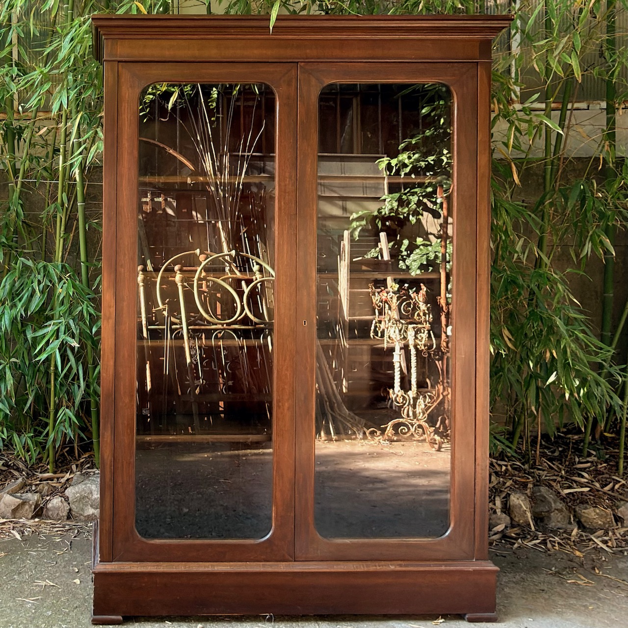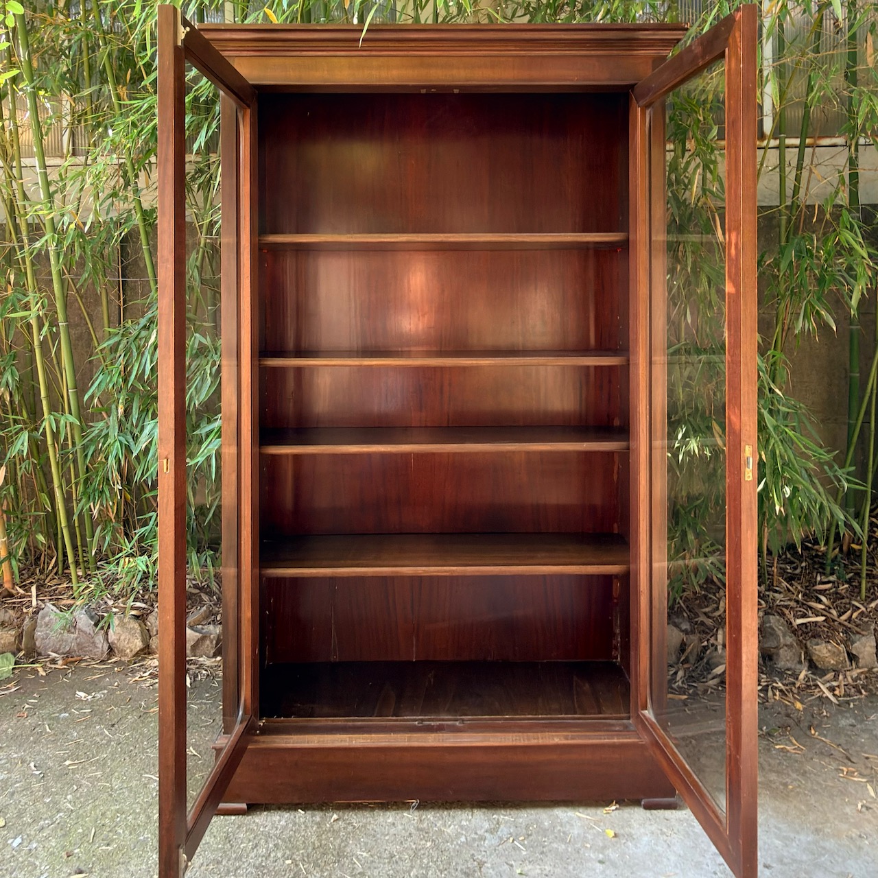 Libreria espositore da farmacia in masso di noce, due sportelli in vetro soffiato. Italia, sec. XIX