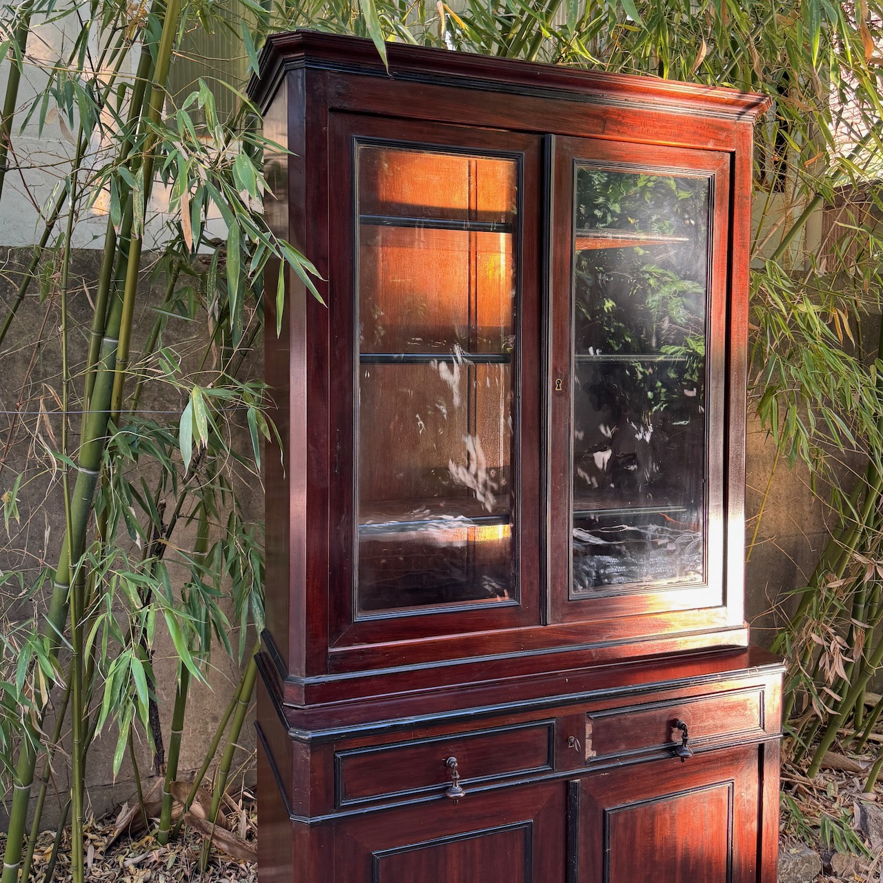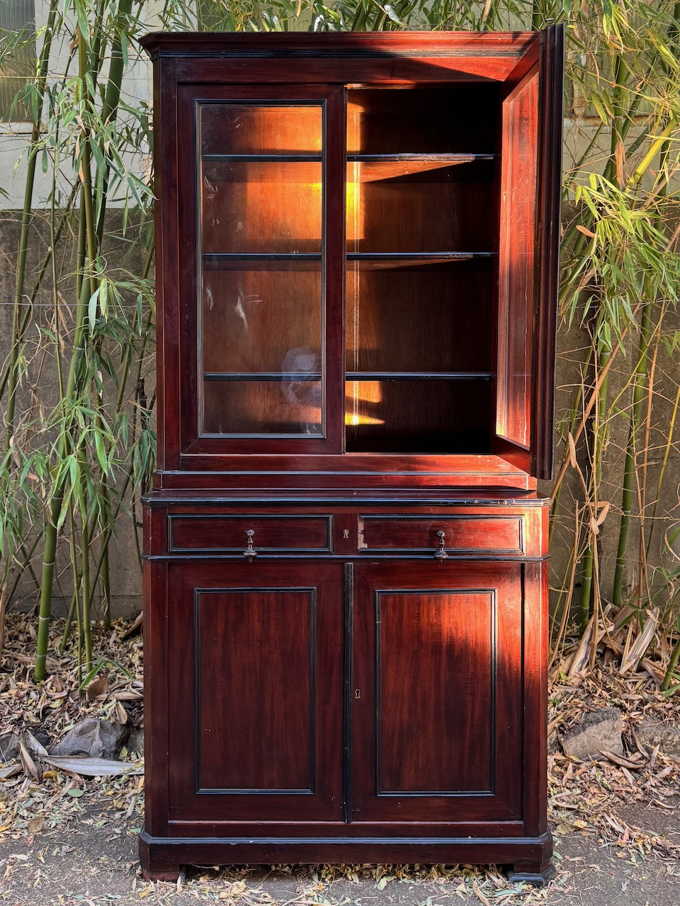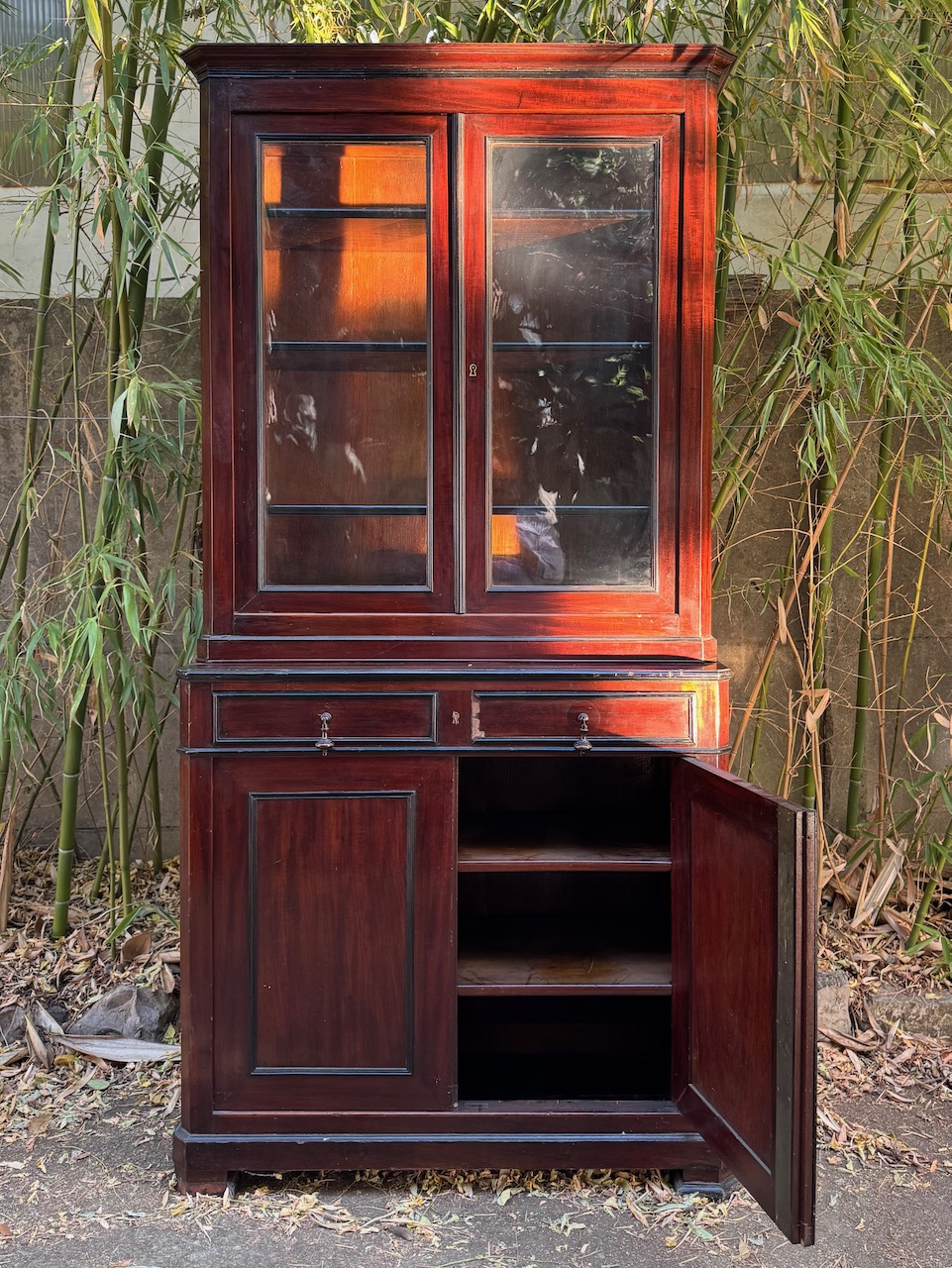 Vetrina Napoleone III in mogano, due sportelli in vetro superiori e dUe in legno inferiori, specchiare e bordi ripiani ebanizzati. Francia, sec. XIX