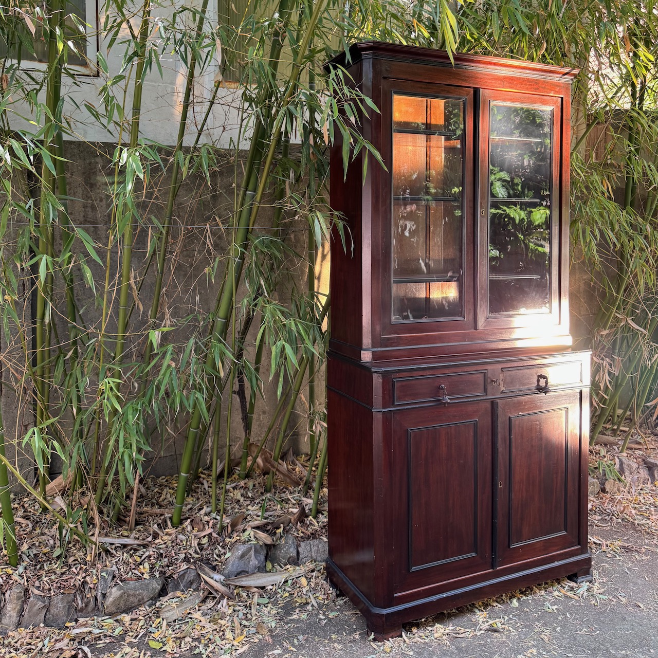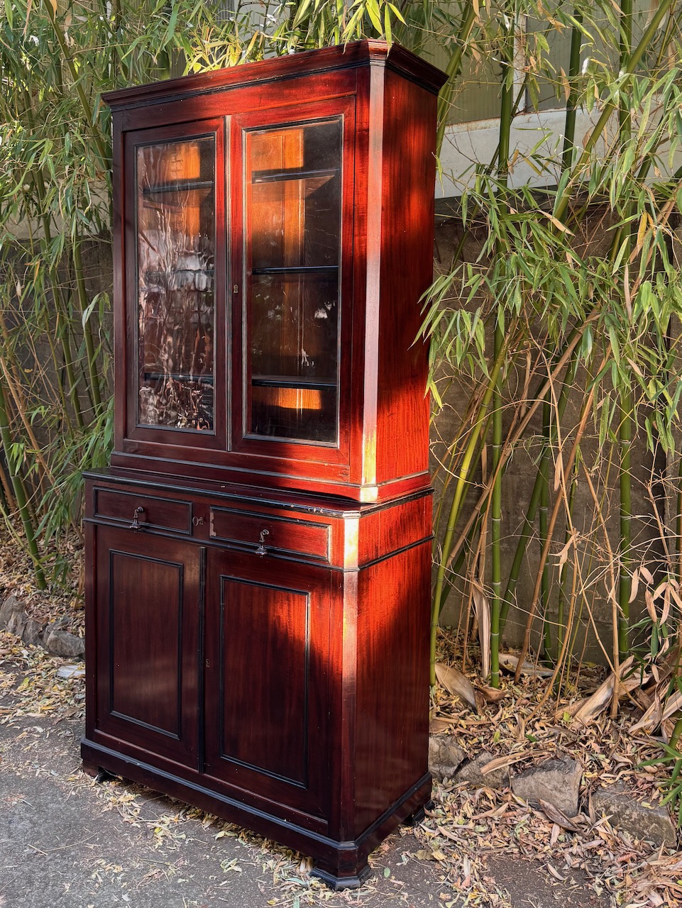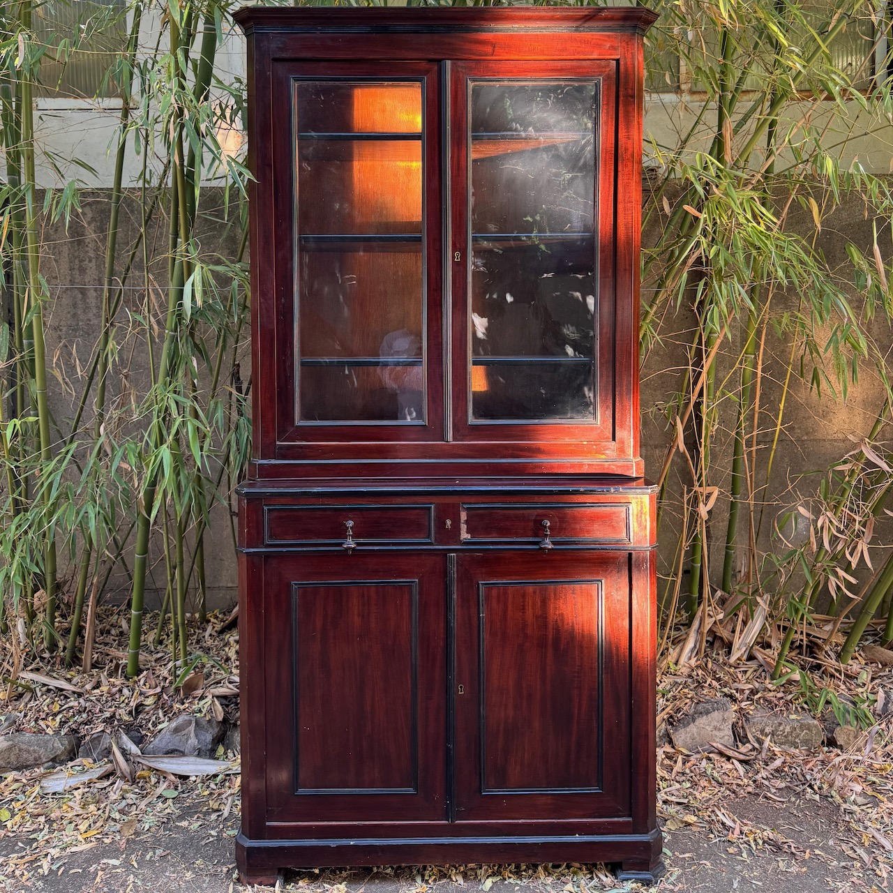 Vetrina Napoleone III in mogano, due sportelli in vetro superiori e dUe in legno inferiori, specchiare e bordi ripiani ebanizzati. Francia, sec. XIX