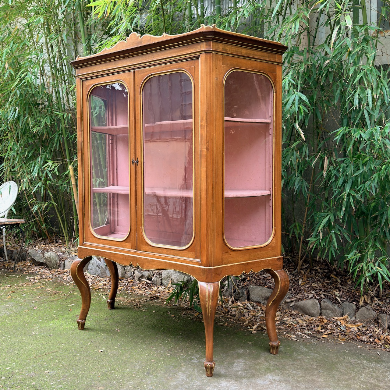 Mobile vetrina scantonata, in noce a due sporteli, gambe mosse, profili dorati. Italia, sec. XX