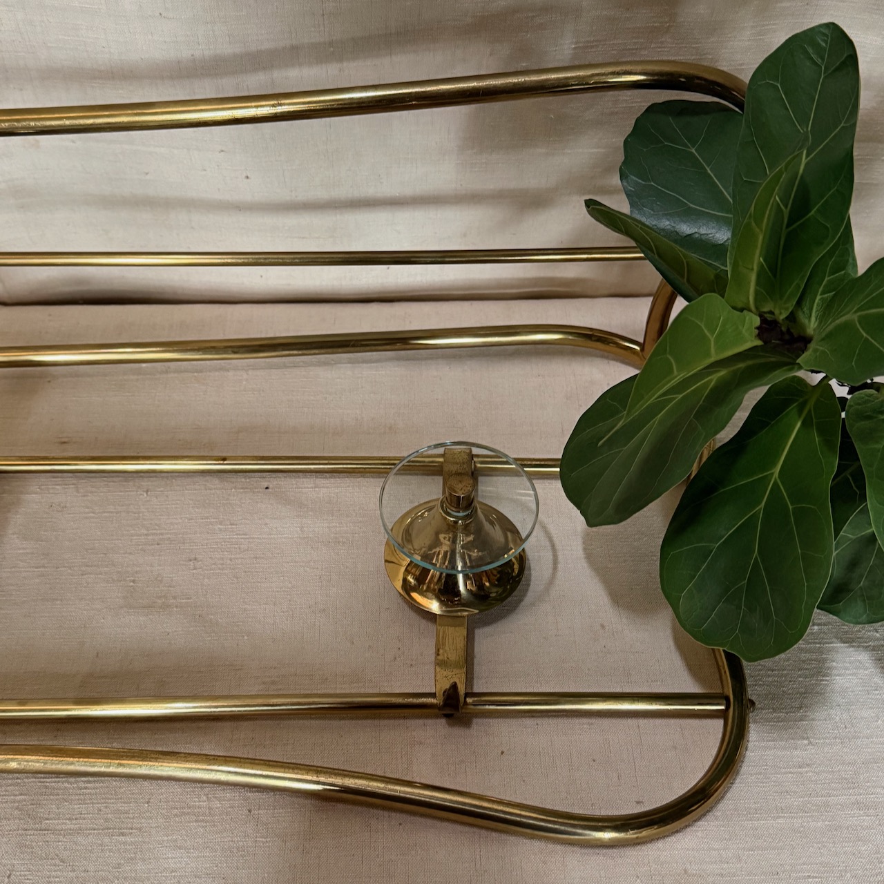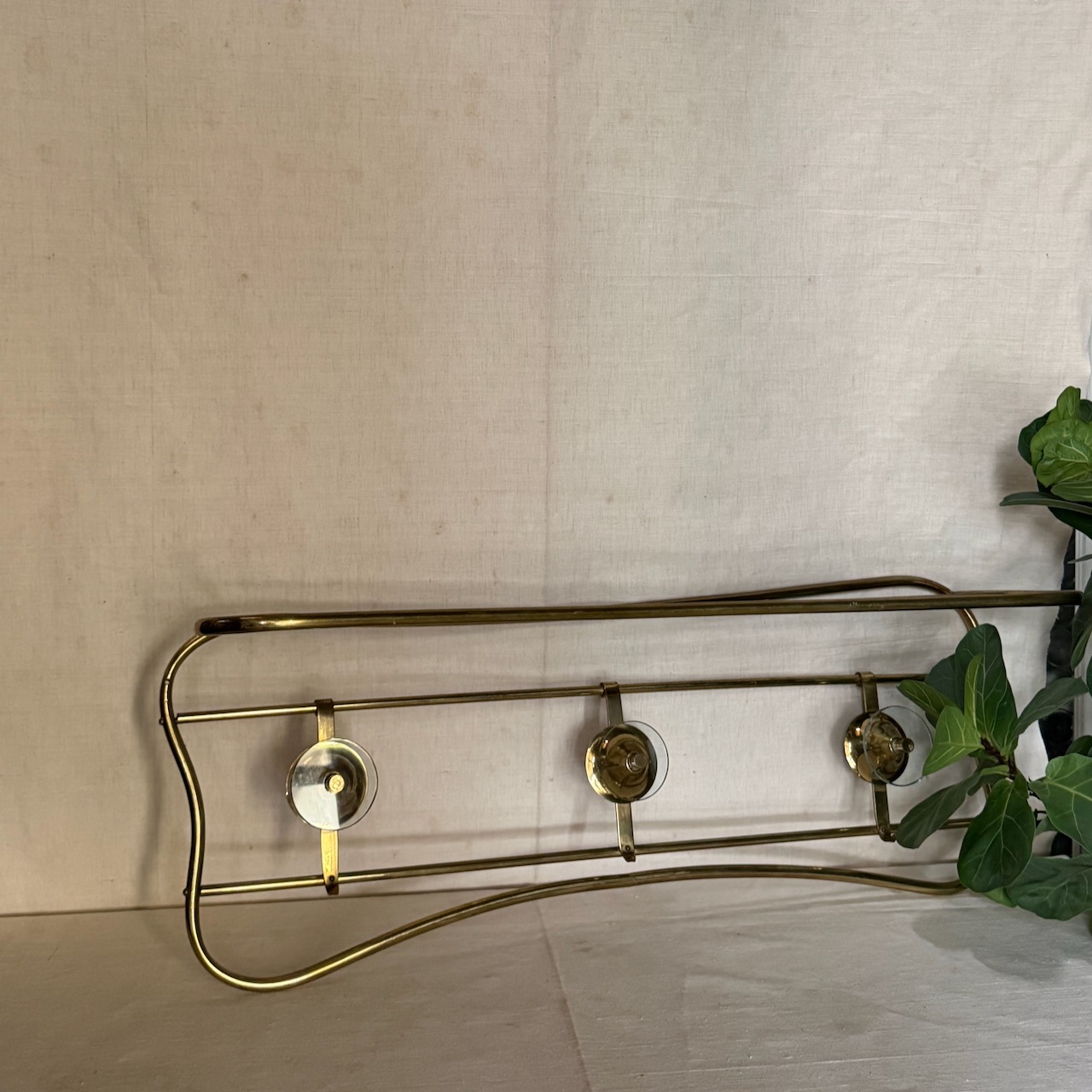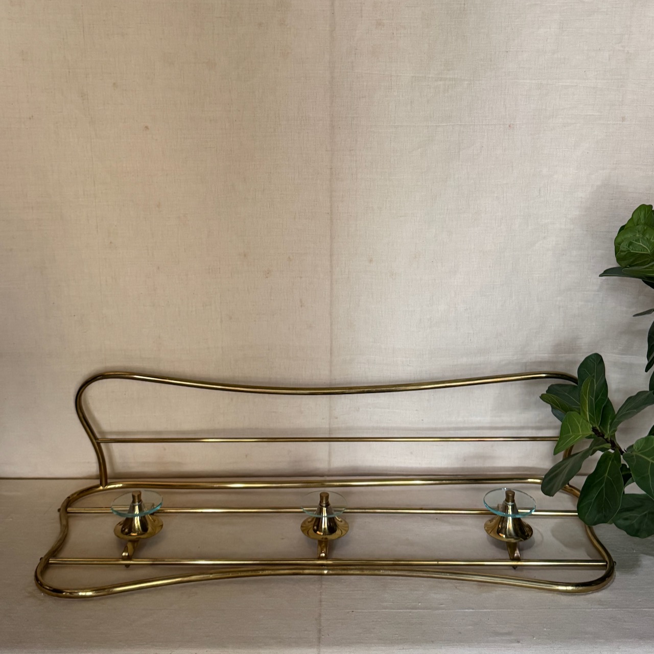 Appendiabiti curvilineo a parete Mid - Century, bronzo dorato con cristalli circolari a tre posti, cappelliera sopra. Italia, 1950 ca