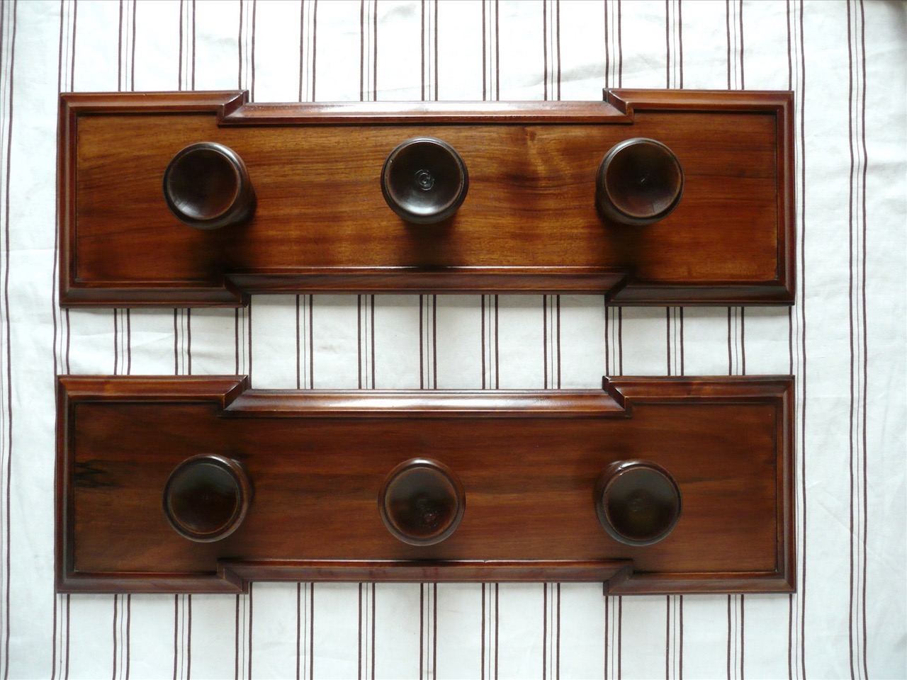 Coppia di attaccapanni in noce a tre posti ciascuno. Italia fine sec. XIX