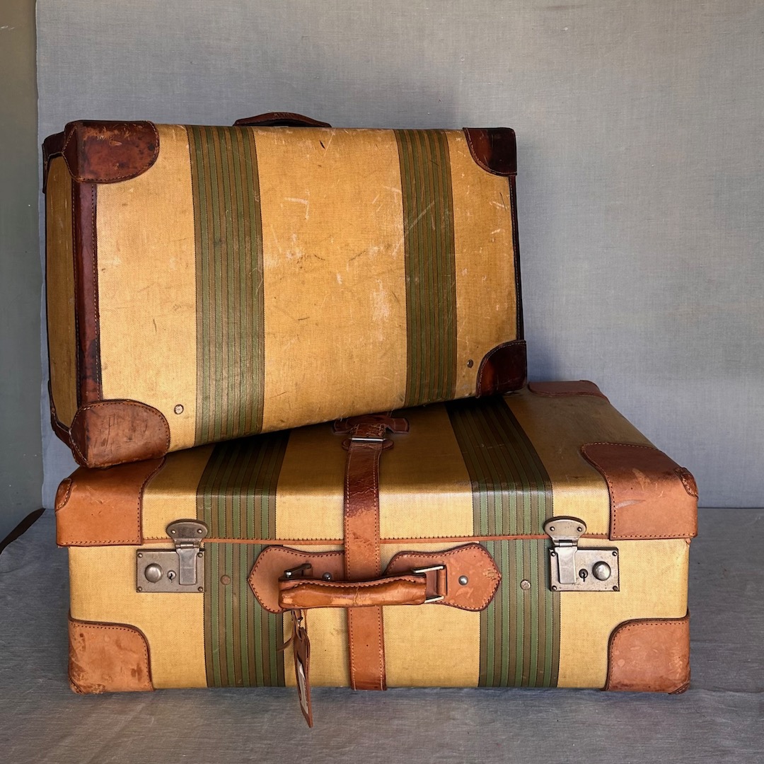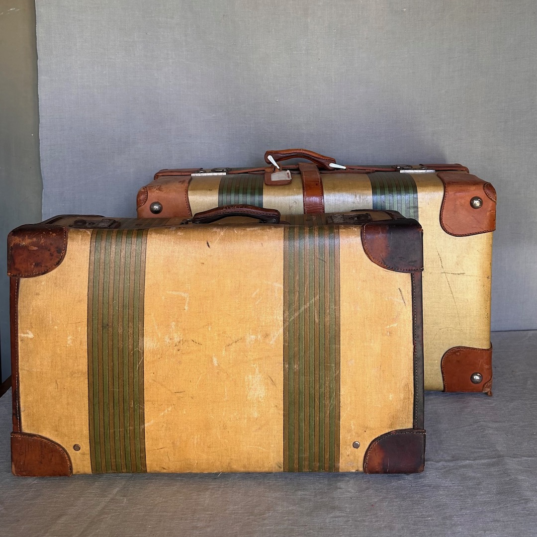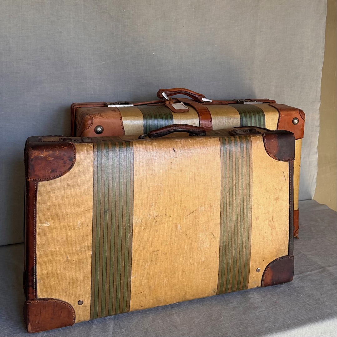 Due valigie in canvas cerato a righe e guarnizioni in cuoio. Italia, 1930 circa