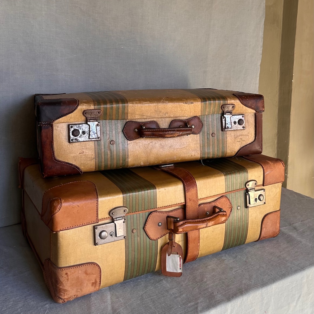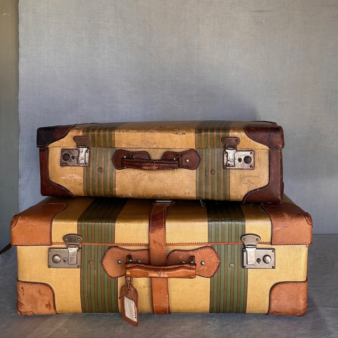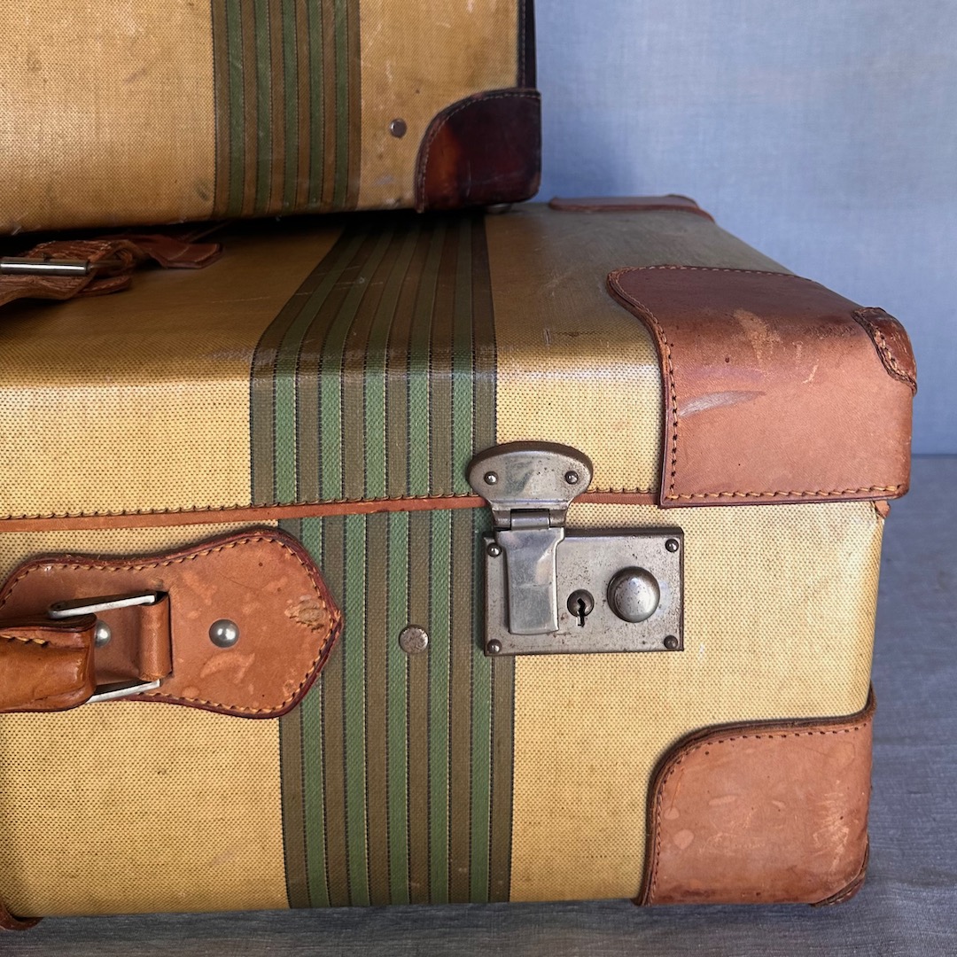 Due valigie in canvas cerato a righe e guarnizioni in cuoio. Italia, 1930 circa