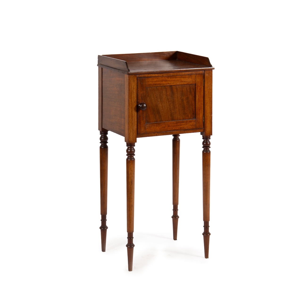 Comodino in mogano a uno sportello, gambe tornite a birillo. Italia, sec. XX