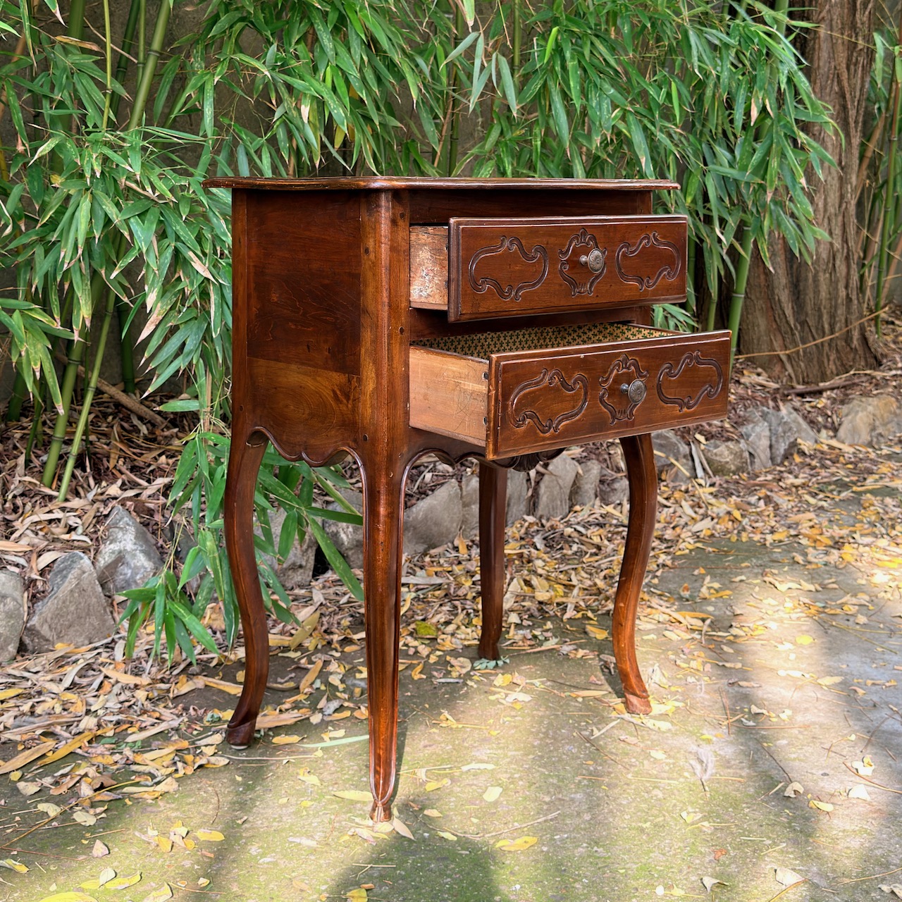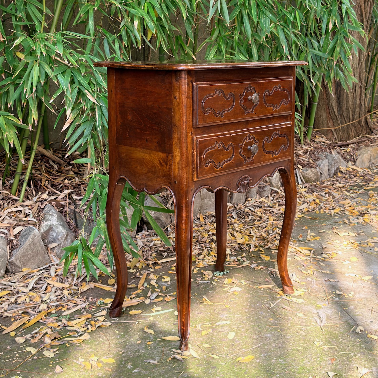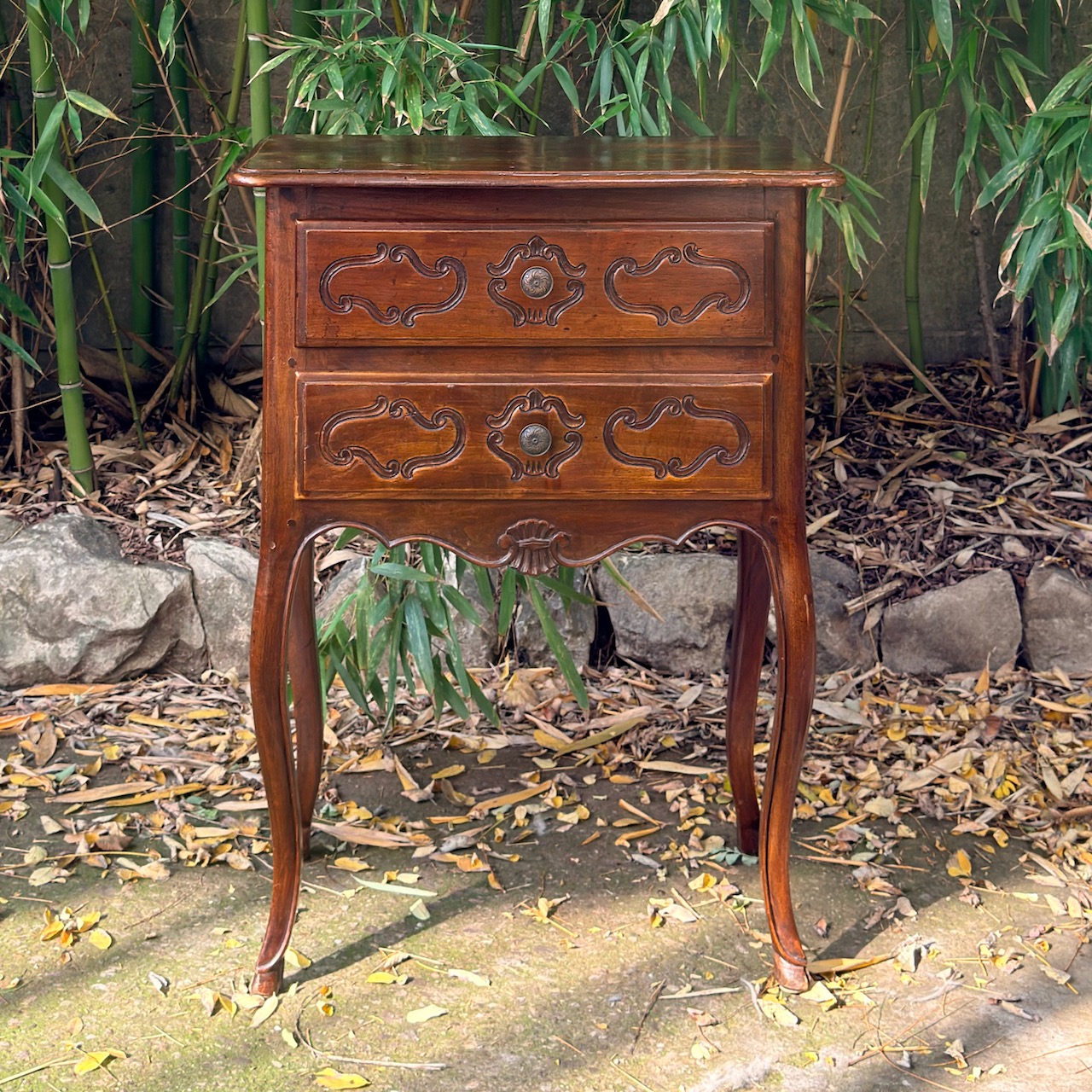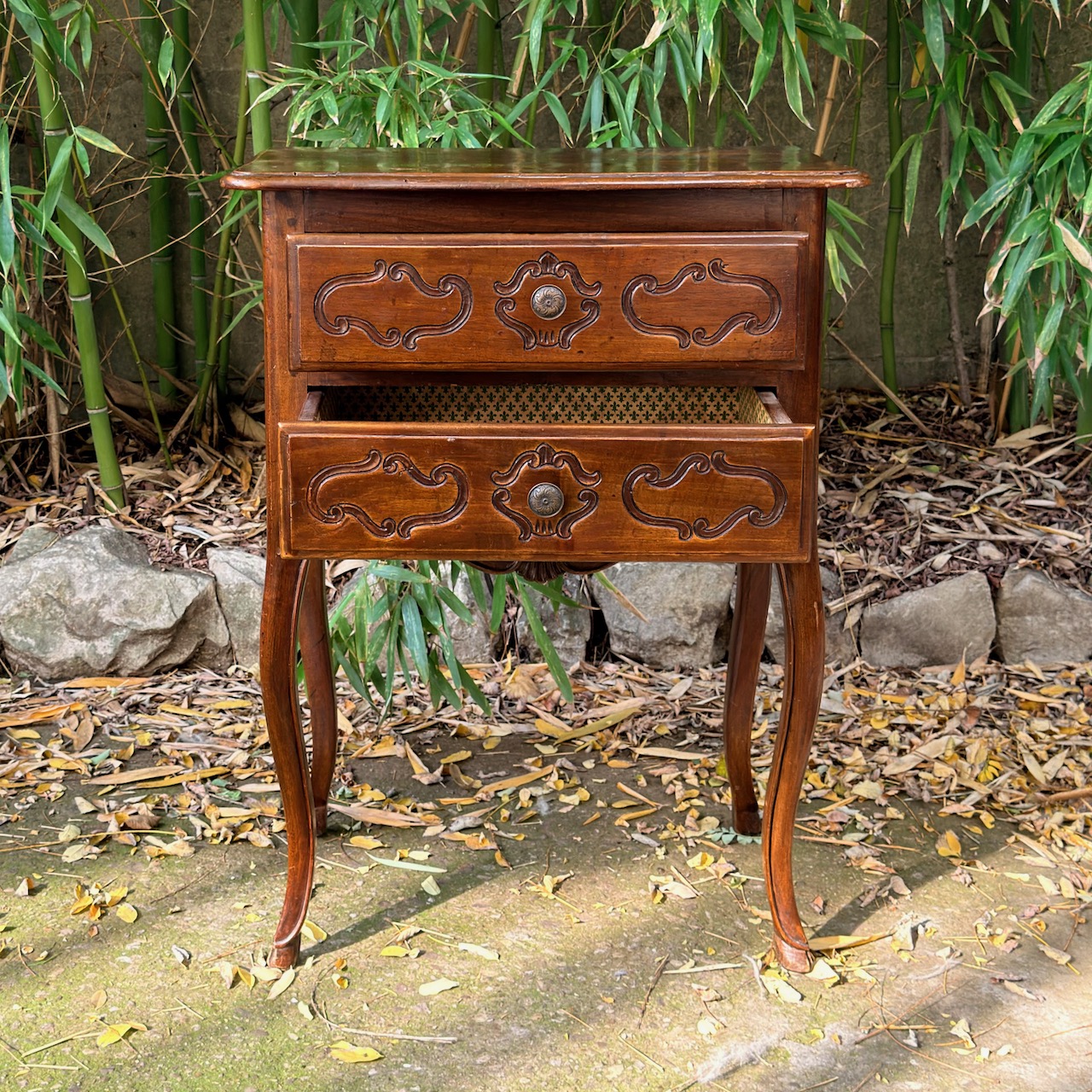 Comodino Luigi XV due cassetti, legno intagliato e gambe cabriolè. Italia, sec. XX