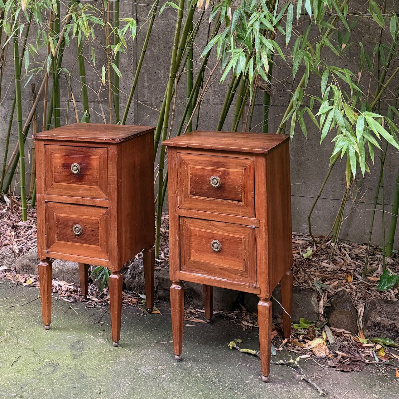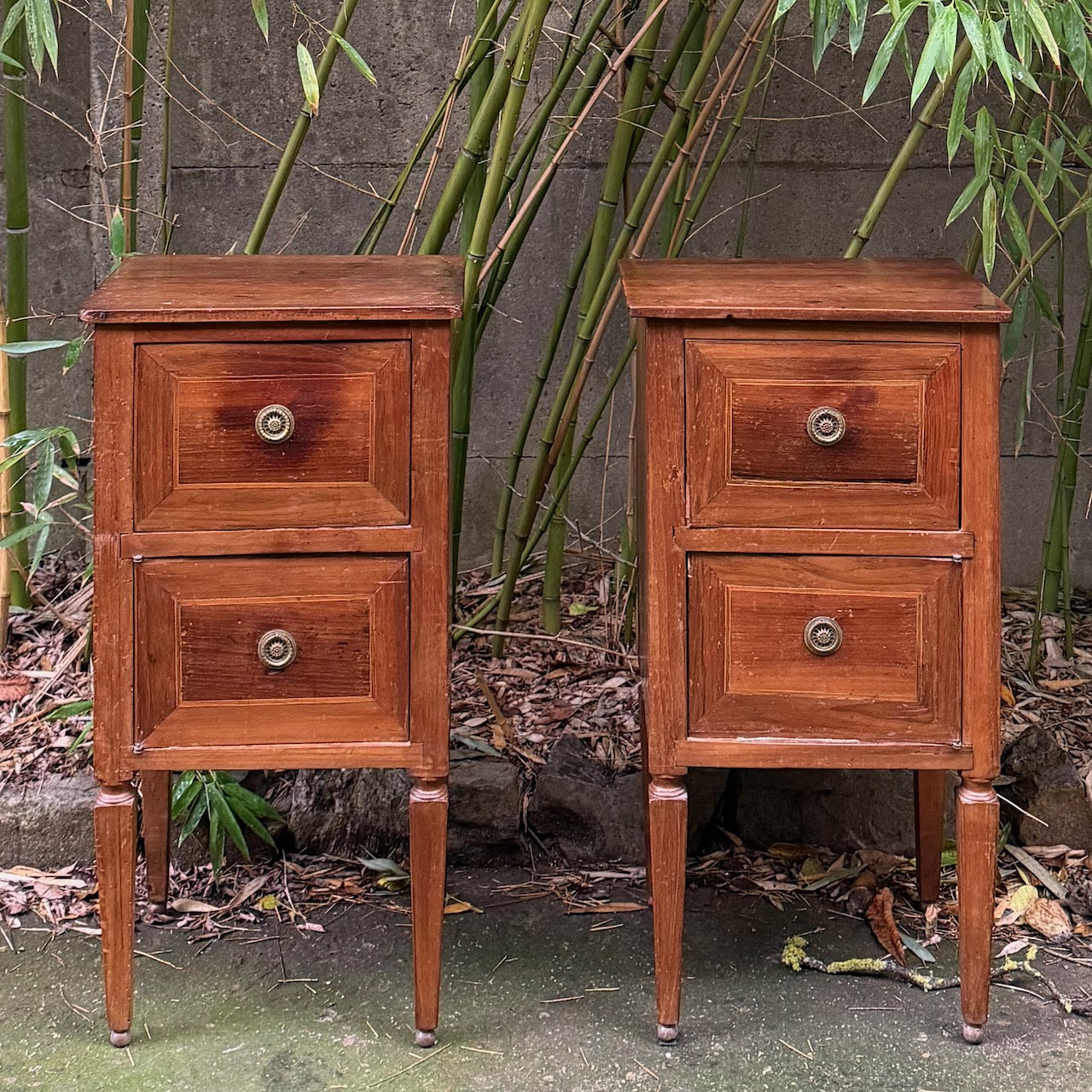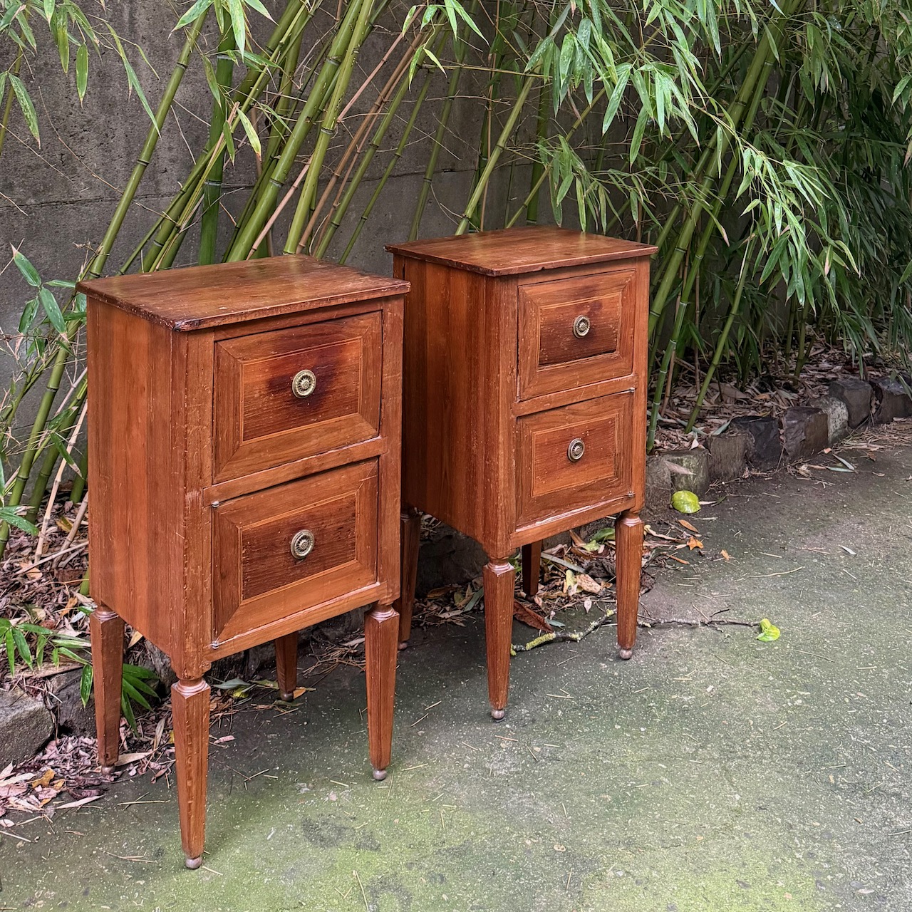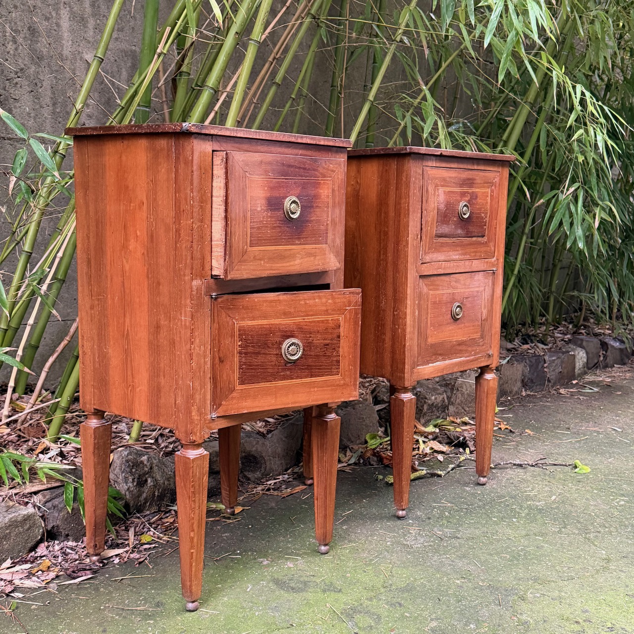 Coppia di comodini neoclassici, due cassetti sul fronte intarsiati con filettature, gambe a faretra. Italia, sec. XVIII