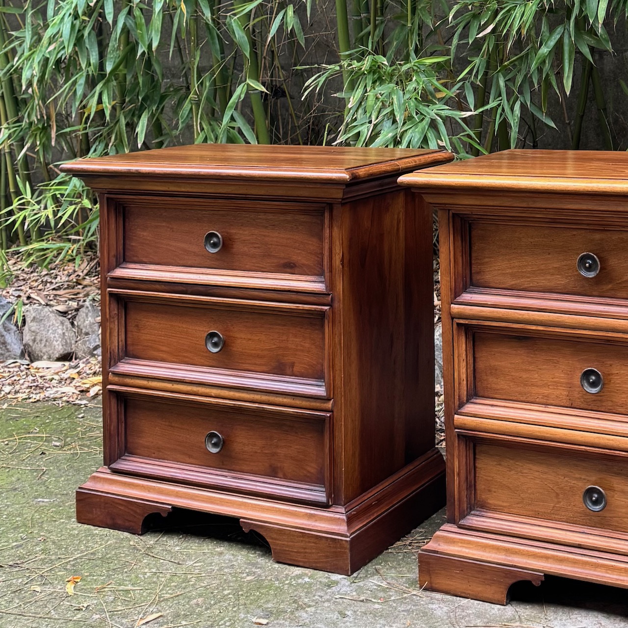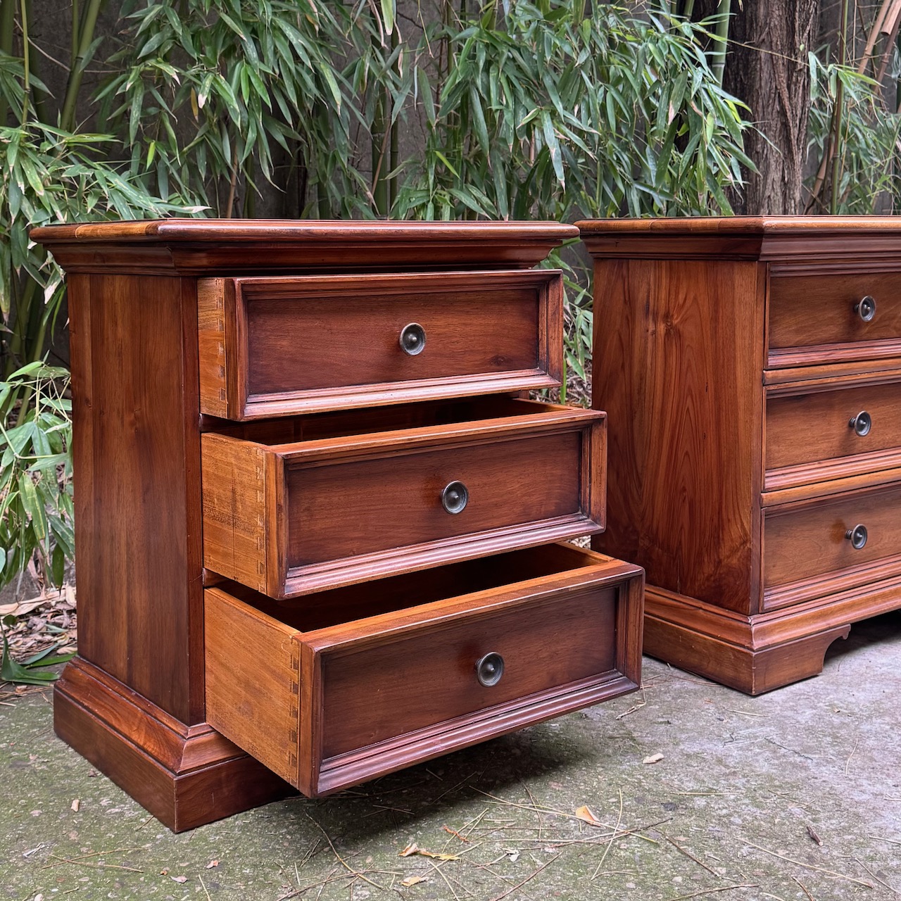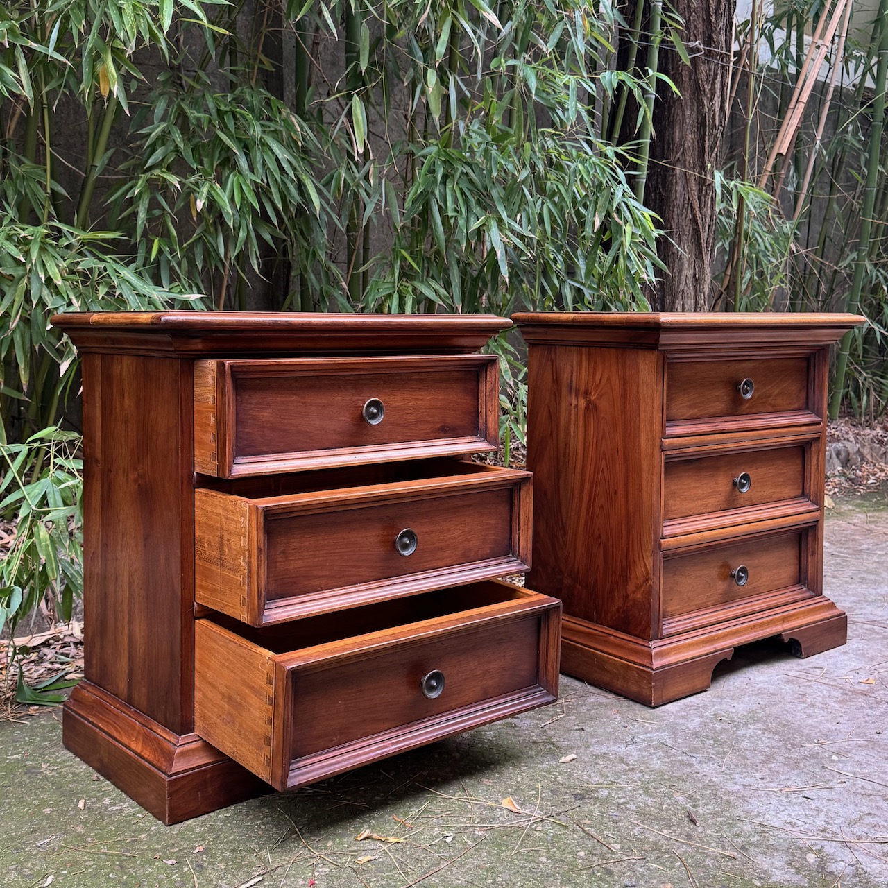 Coppia comodini in noce, tre cassetti. Italia, sec. XX