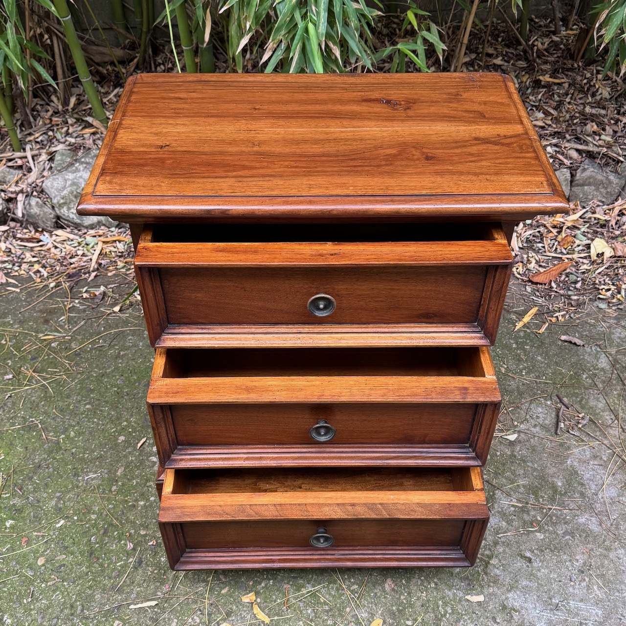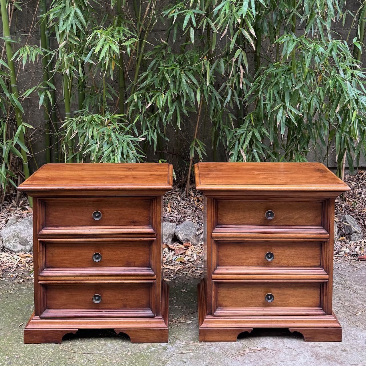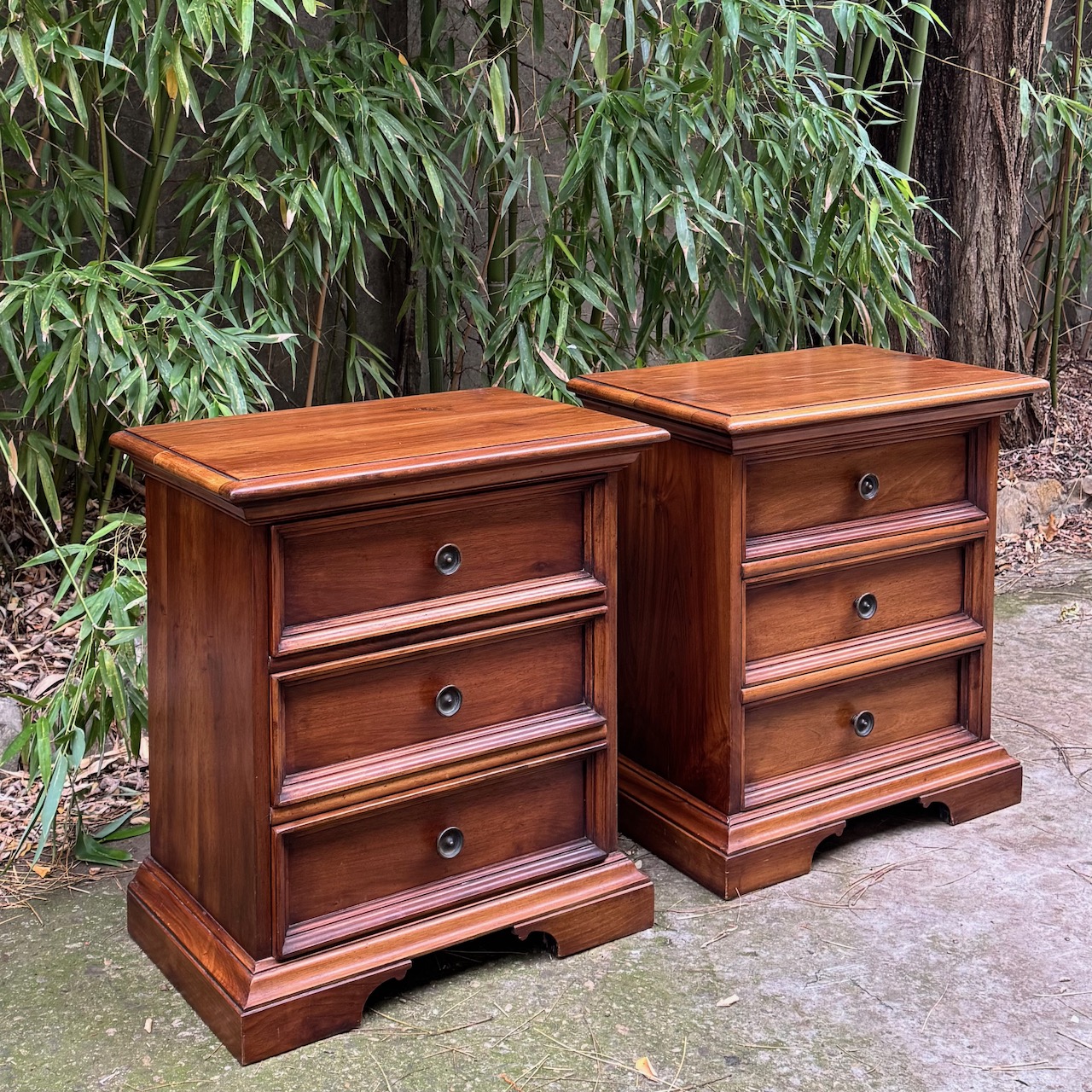 Coppia comodini in noce, tre cassetti. Italia, sec. XX