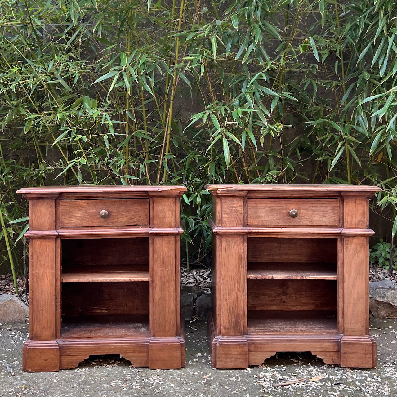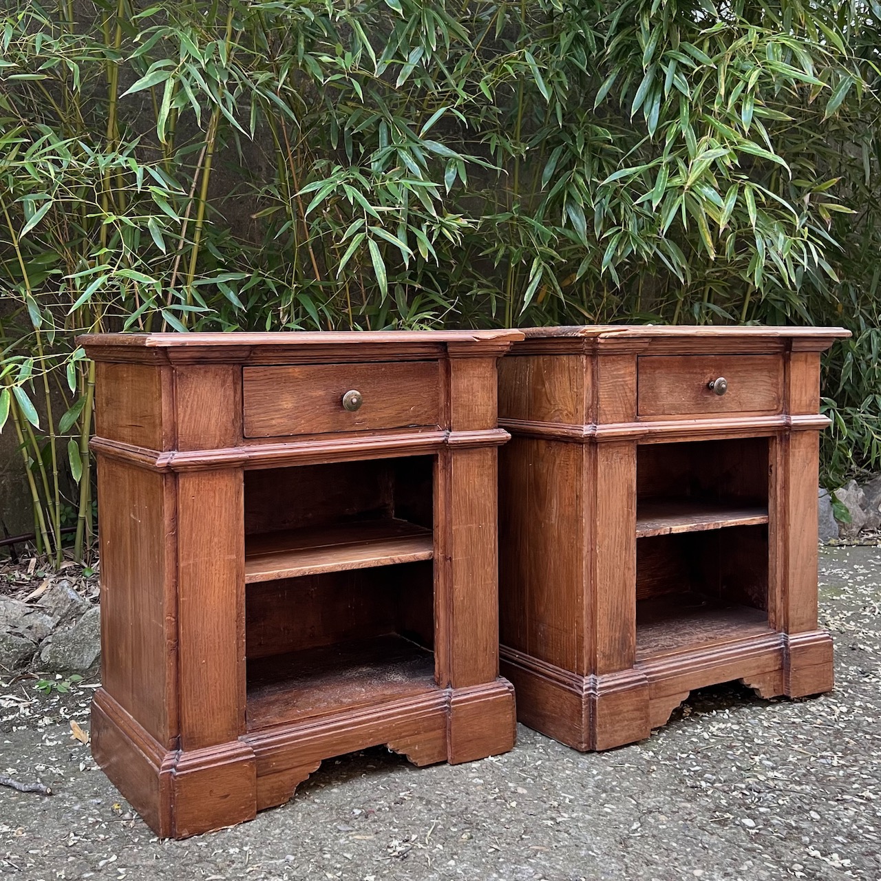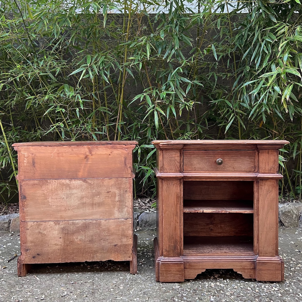 Coppia comodini-credenza rustici in noce, due ripiani e un cassetto, base sagomata. Italia, sec. XIX