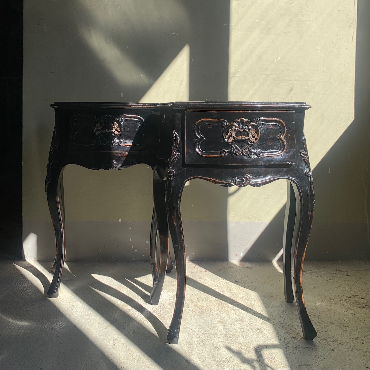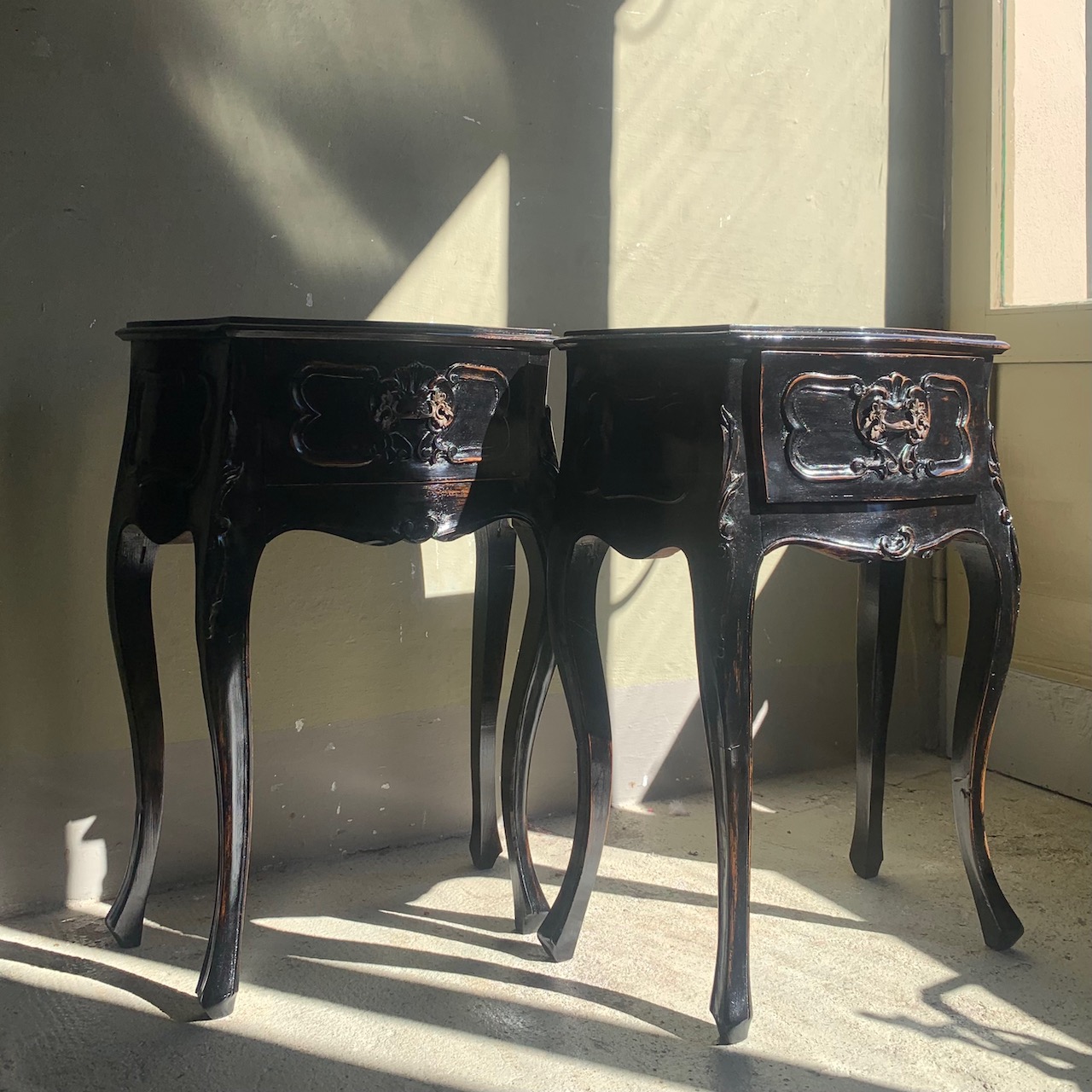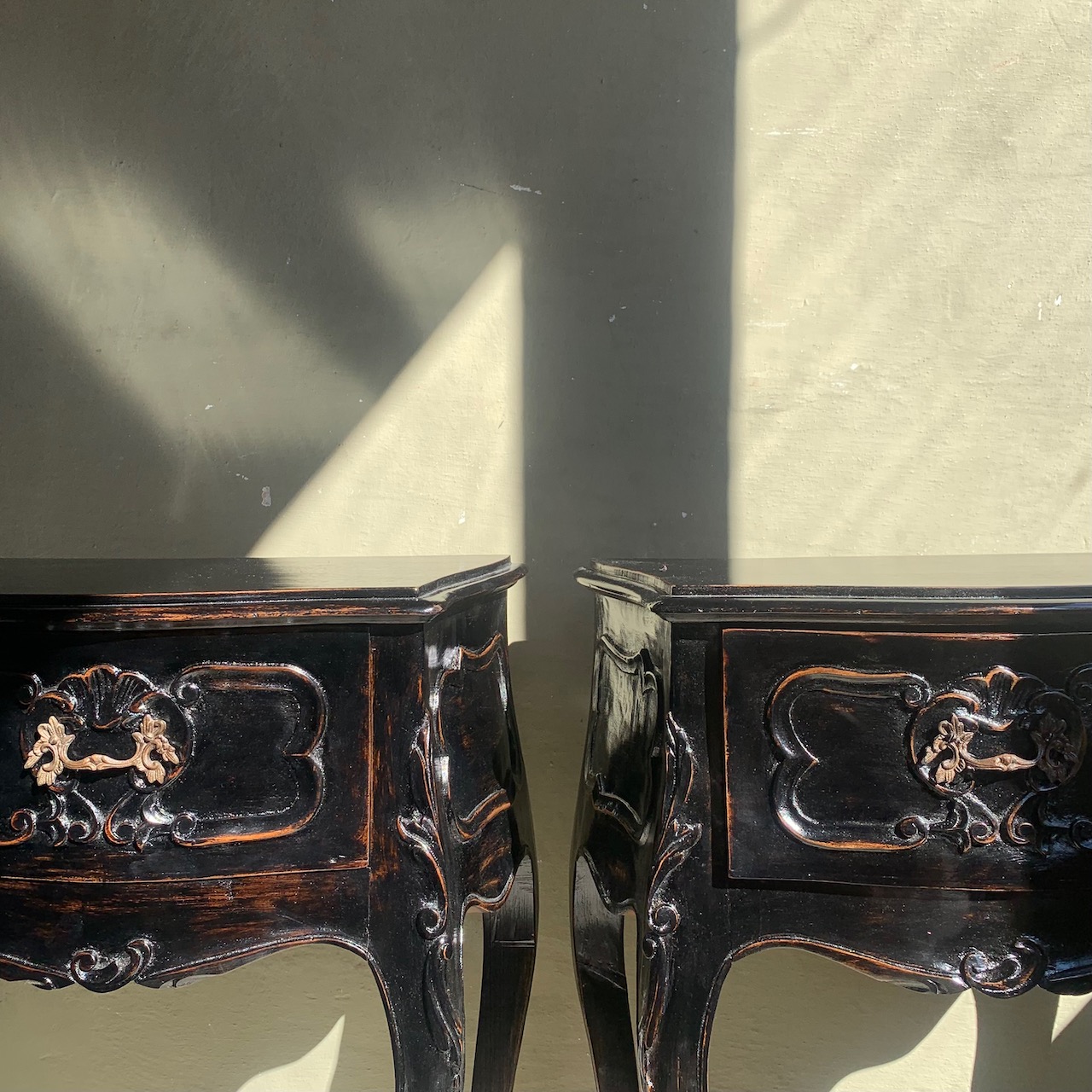 Coppia di comodini Luigi XV in noce a patina bruna, piano in noce ebanizzato. Italia, inizio sec. XX