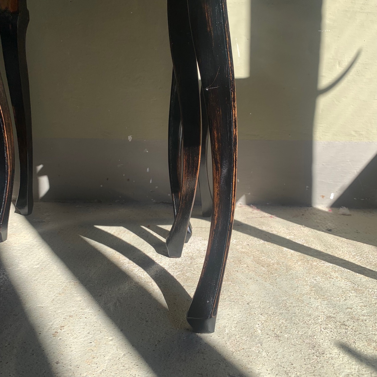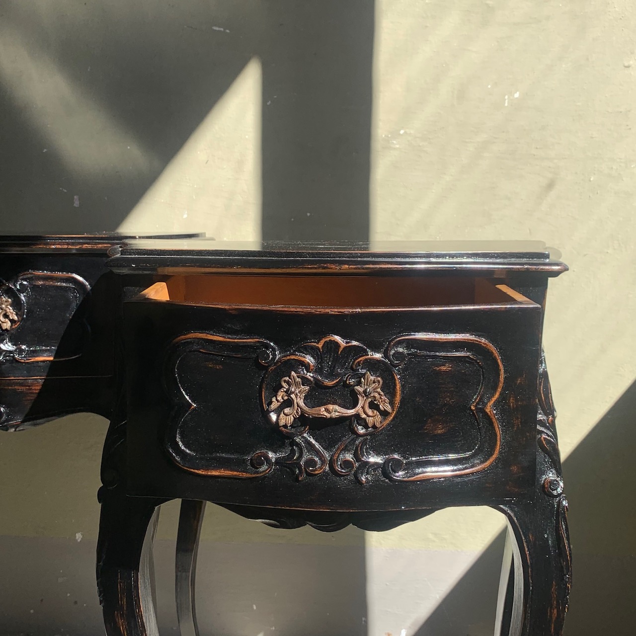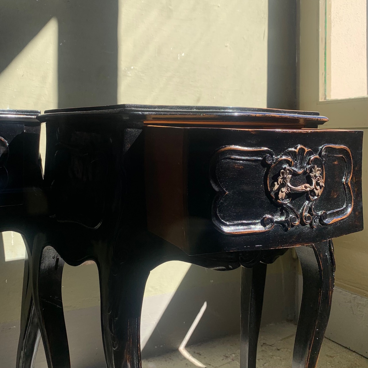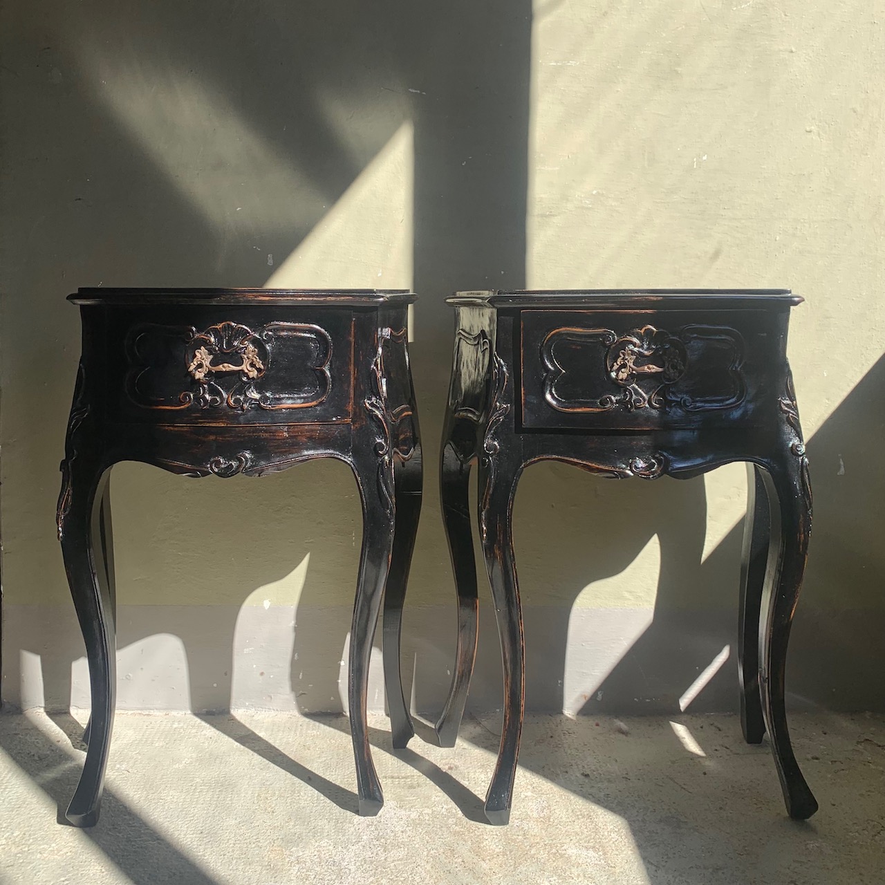 Coppia di comodini Luigi XV in noce a patina bruna, piano in noce ebanizzato. Italia, inizio sec. XX