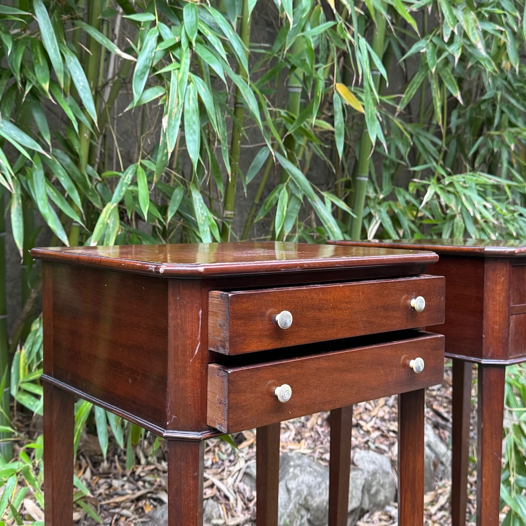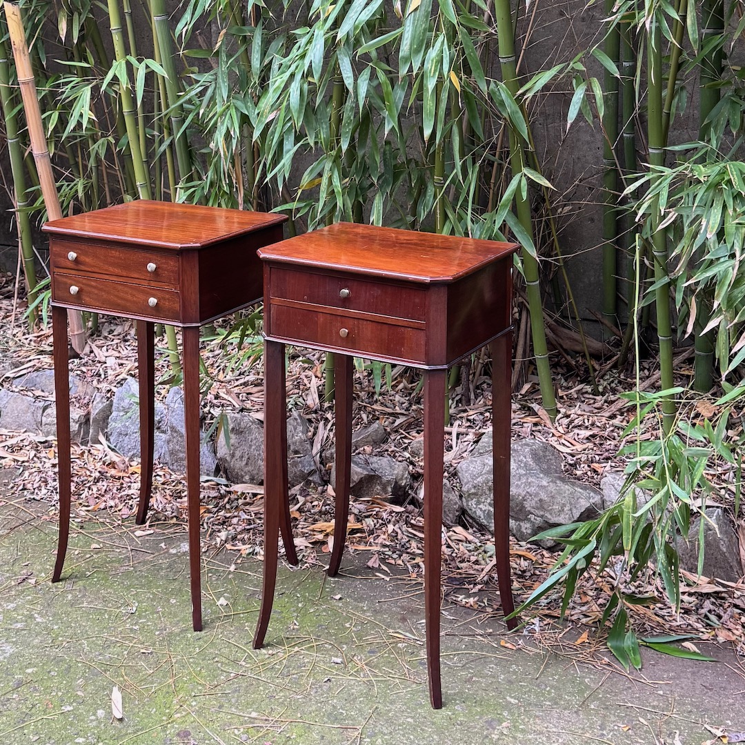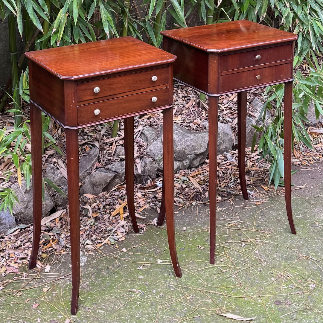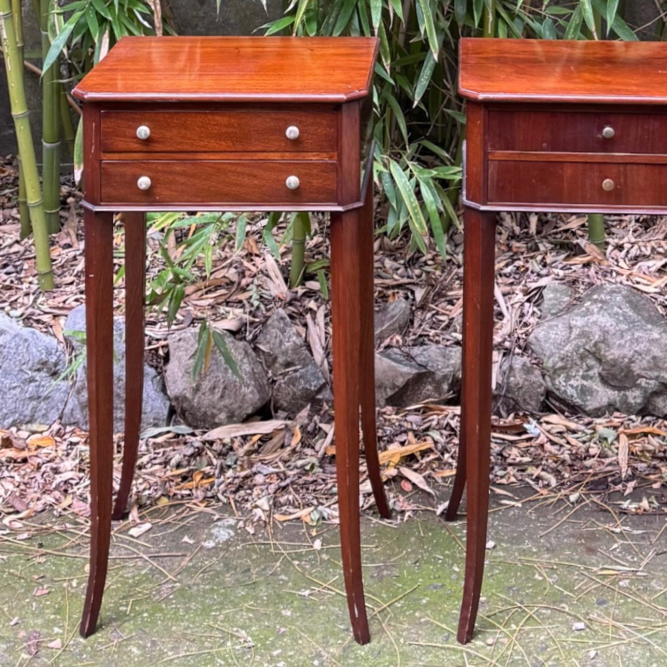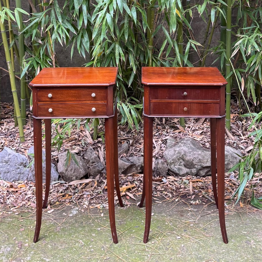 Coppia di comodini mid-century in noce, gambe a sciabola. Italia, sec. XIX