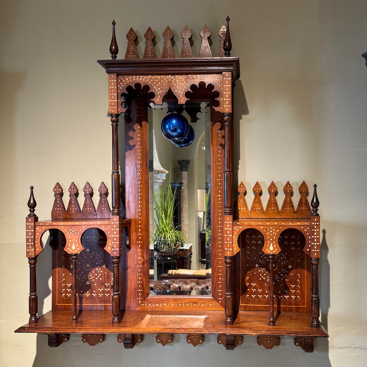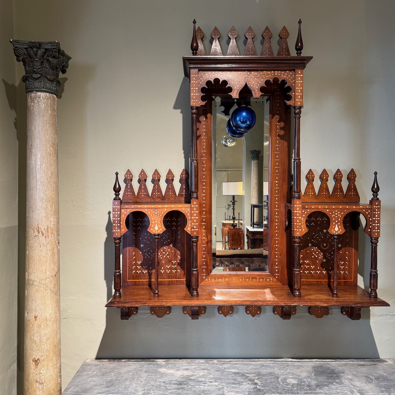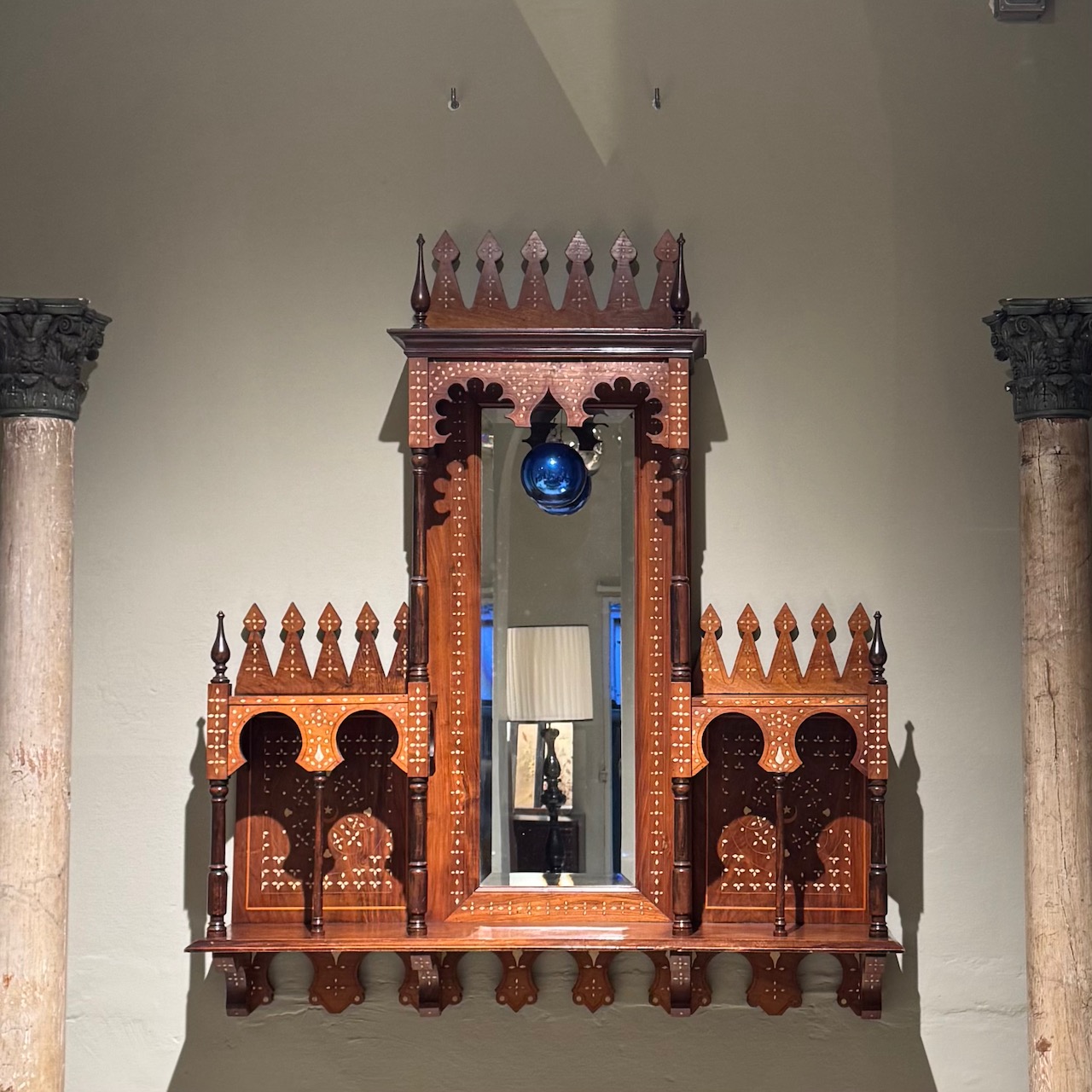 Pensile Moresco tripartito con archi e guglie, in legno di noce a patina bionda con decori ad intarsio in avorio, parte centrale specchiata con pendente a sfera in vetro blu. Italia, fine sec. XIX