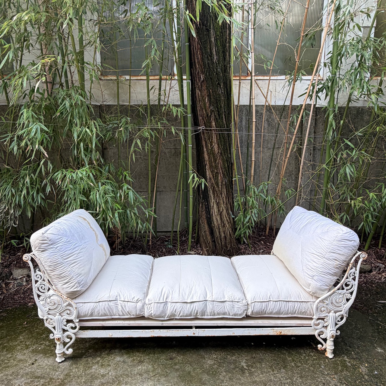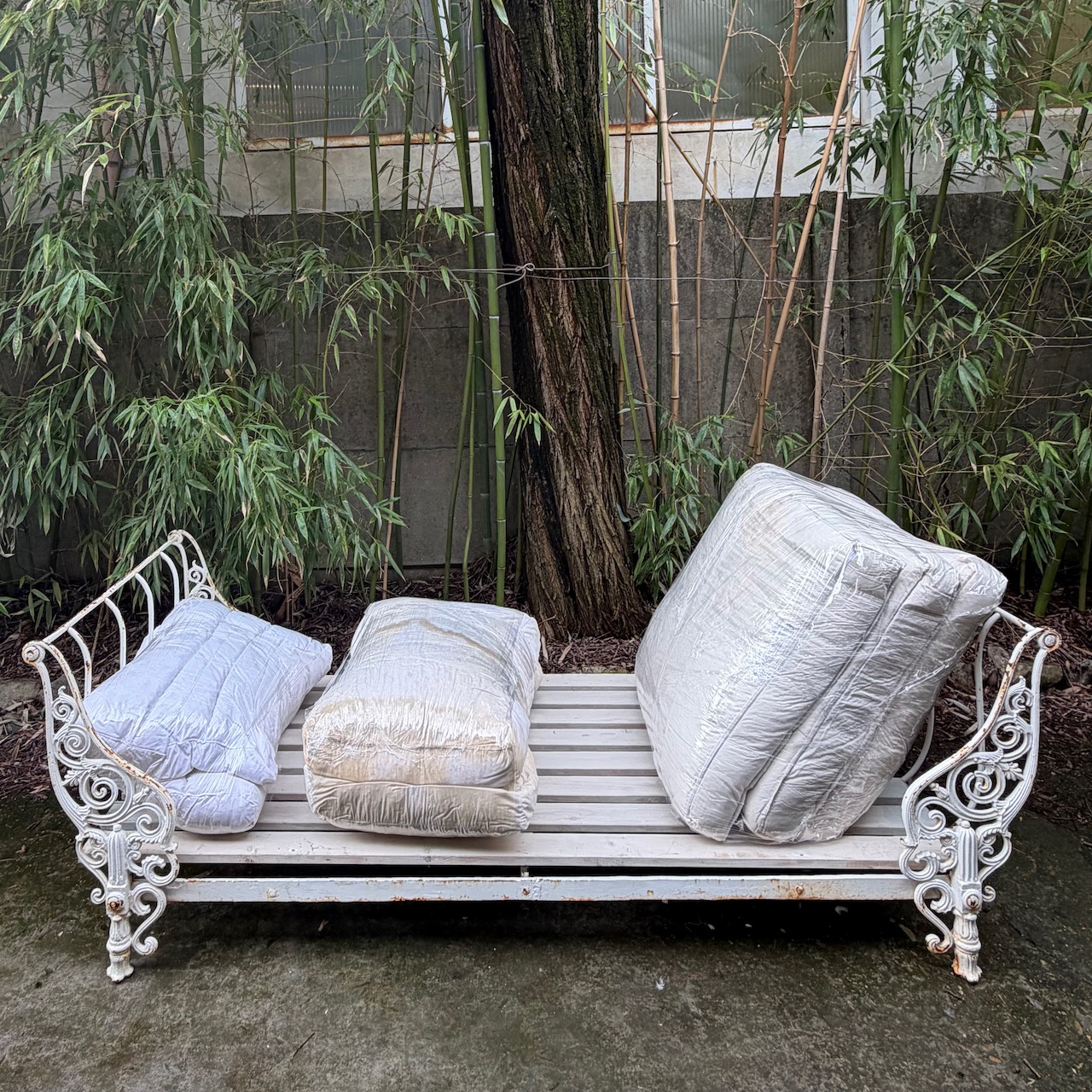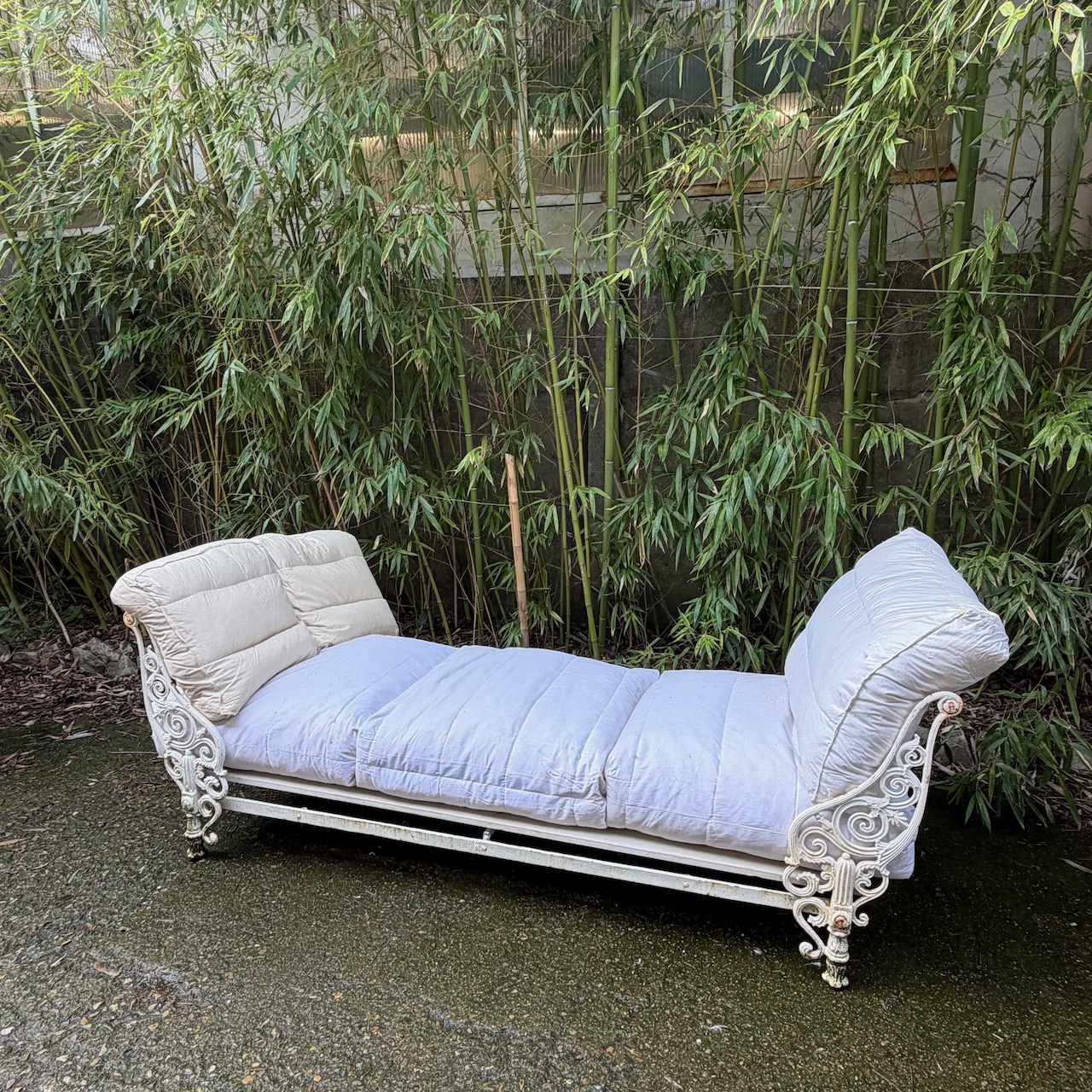 Coppia di divani dormeuse lit de jour in ferro e ghisa laccati avorio. Fonderie Granducali di Follonica, Toscana prima metà sec. XIX RETI / MATERASSI E CUSCINI NOLEGGIATI / VENDUTI SEPARATAMENTE