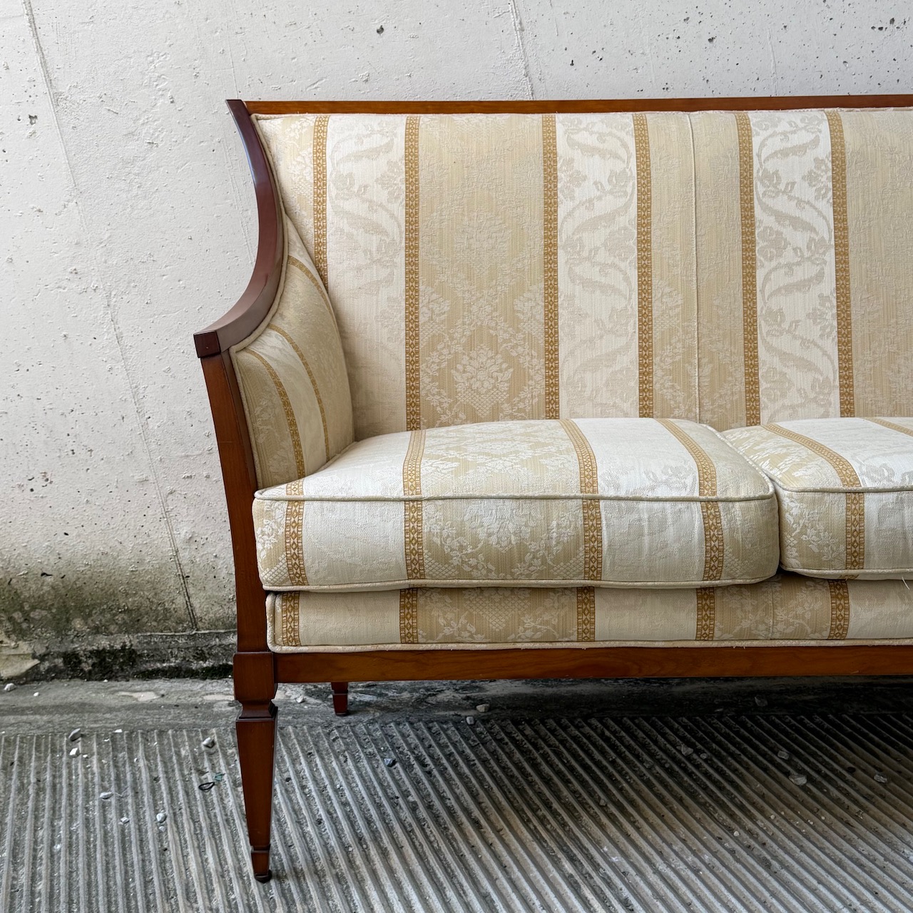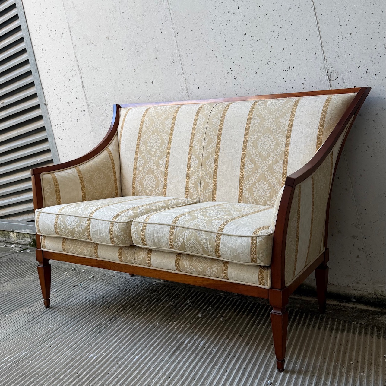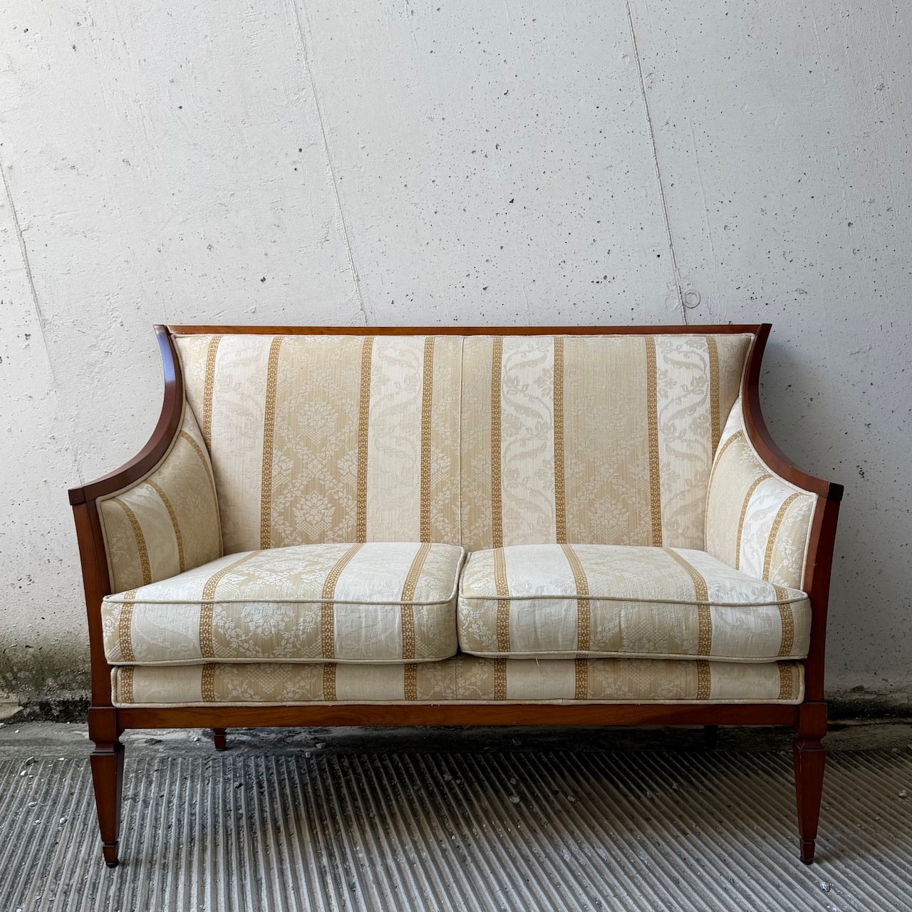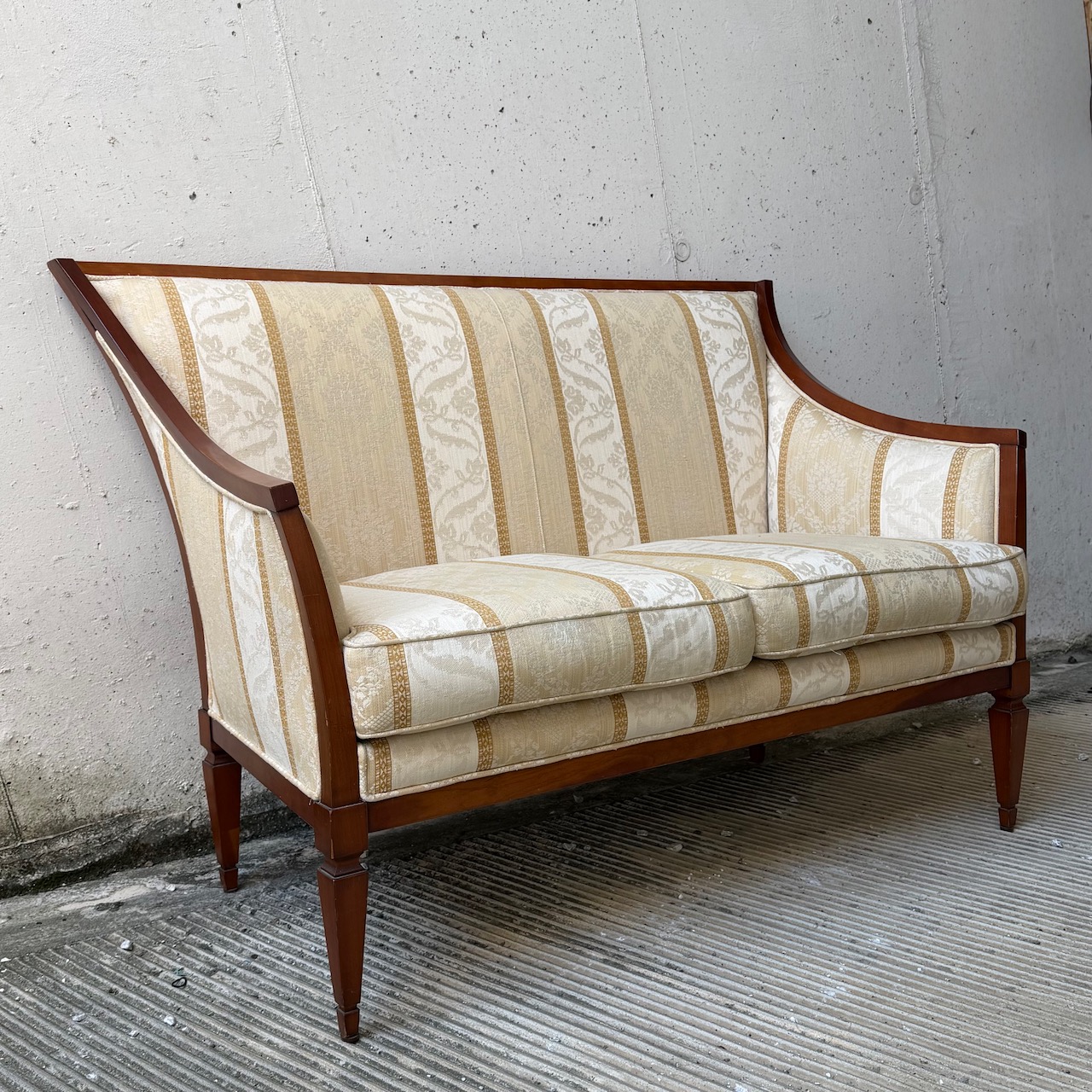 Divano due posti francese, cornice mossa, seduta, schienale e braccioli imbottiti e rivestiti in tela di cotone damasco a fasce crema e avorio. Italia, sec. XIX