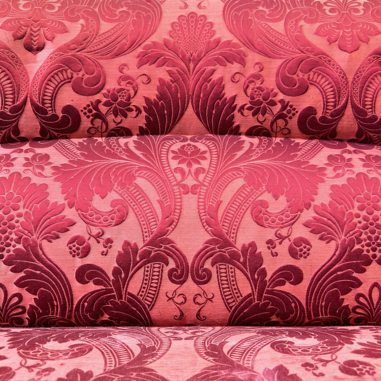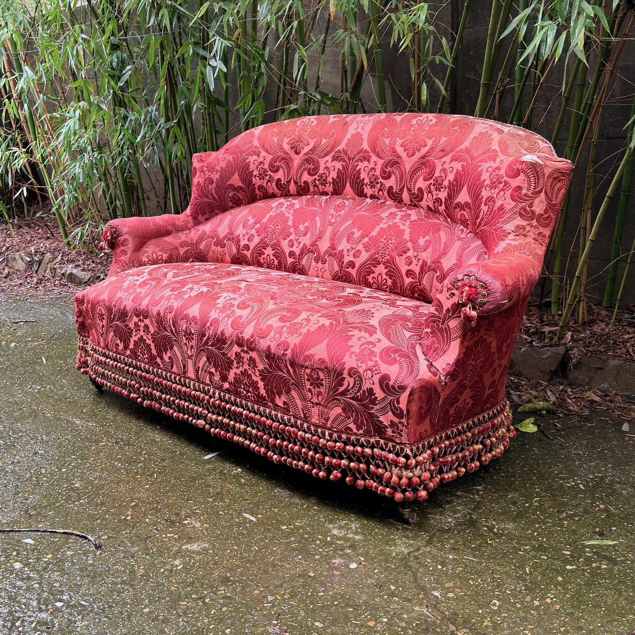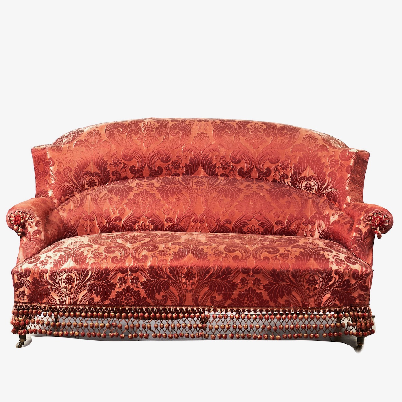 Divano panca rospo Napoleone III con braccioli, seta damasco rosso e pappine sulla fascia inferiore. Italia, sec. XIX