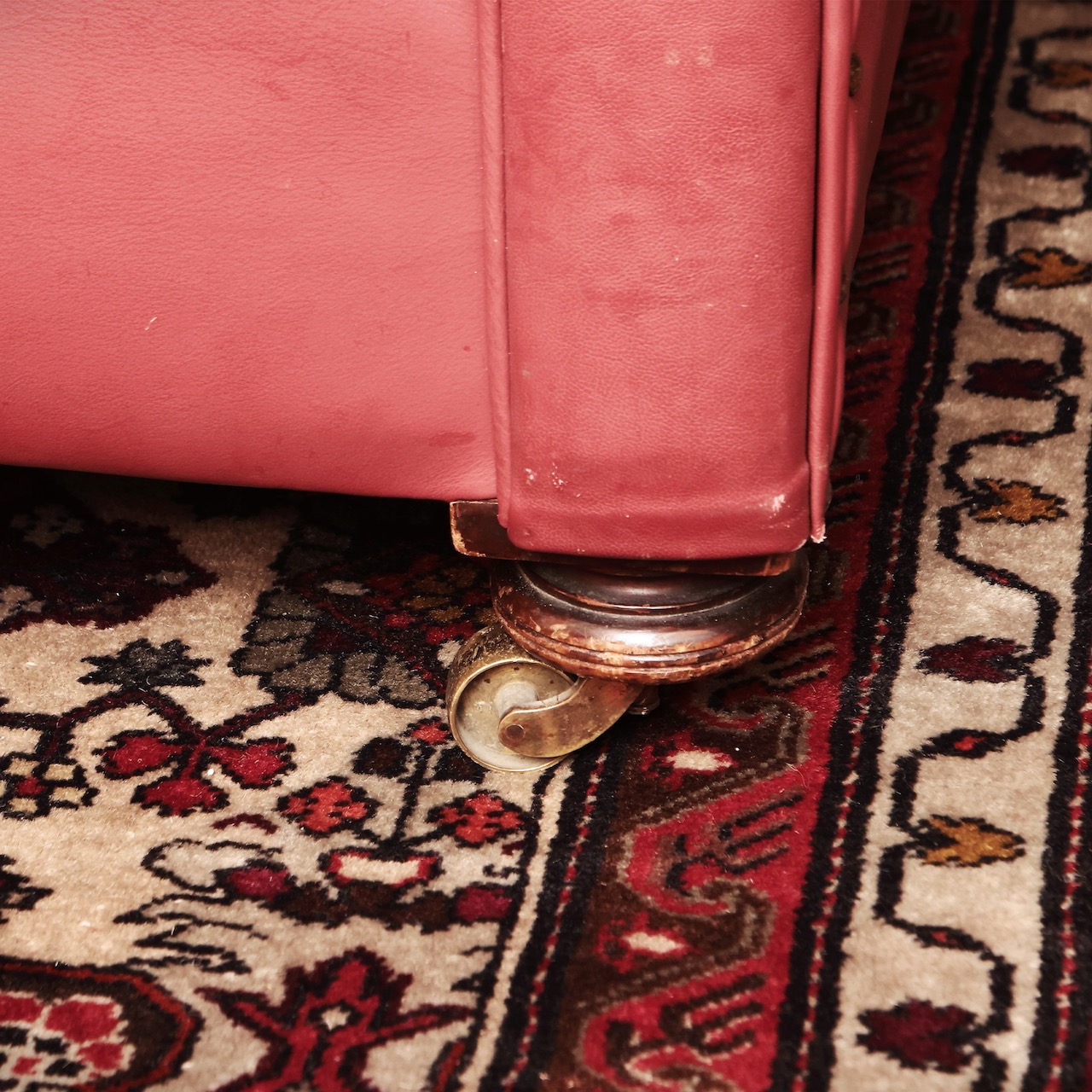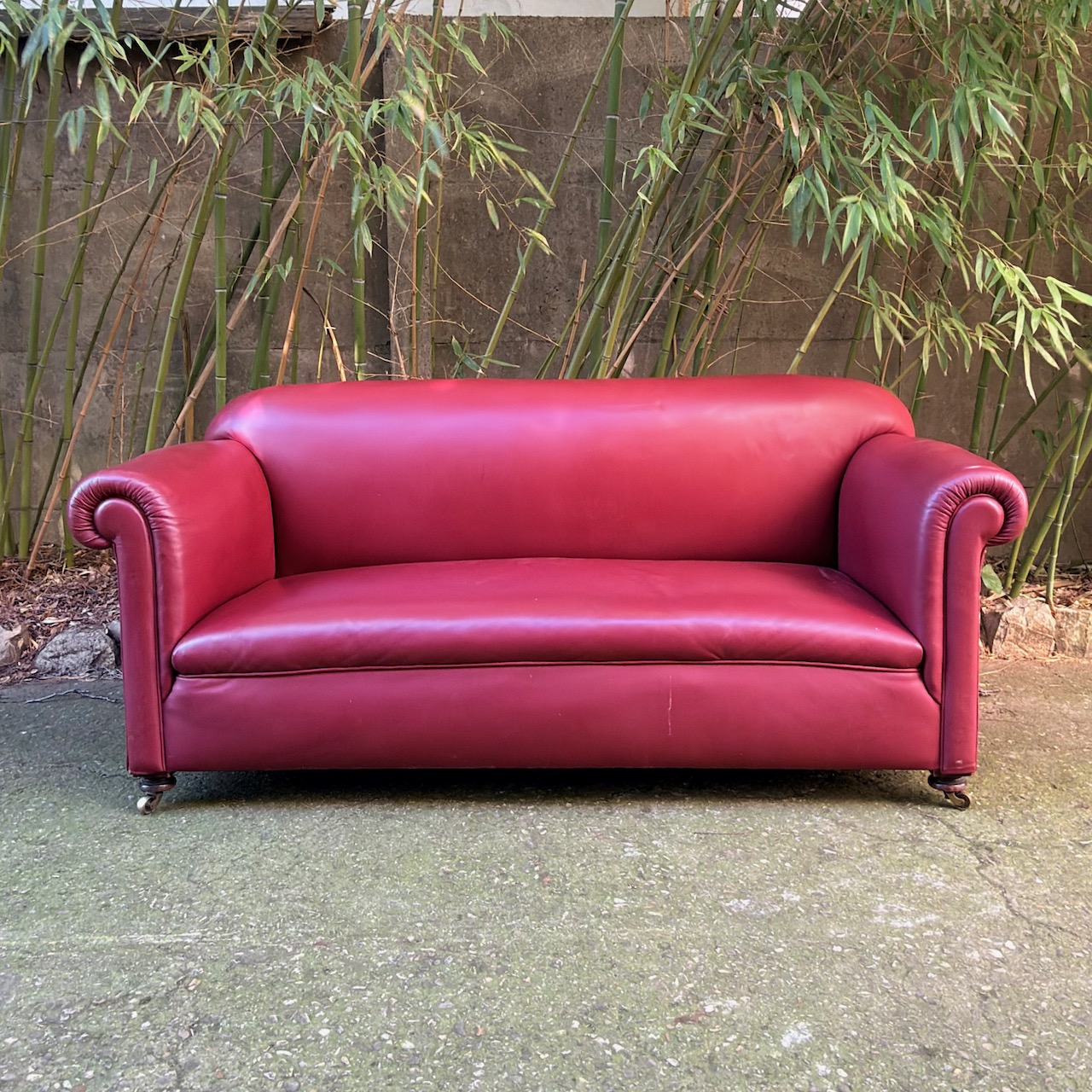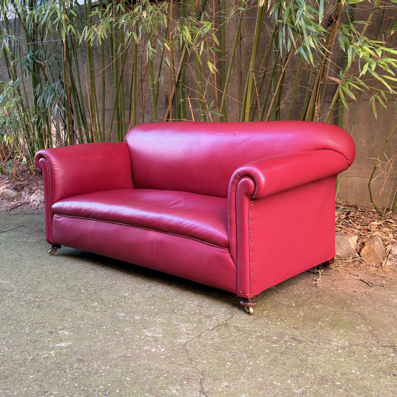 Divano imbottito, rivestito in pelle vinaccia, piedi a cipolla su ruotine. Italia, sec. XX