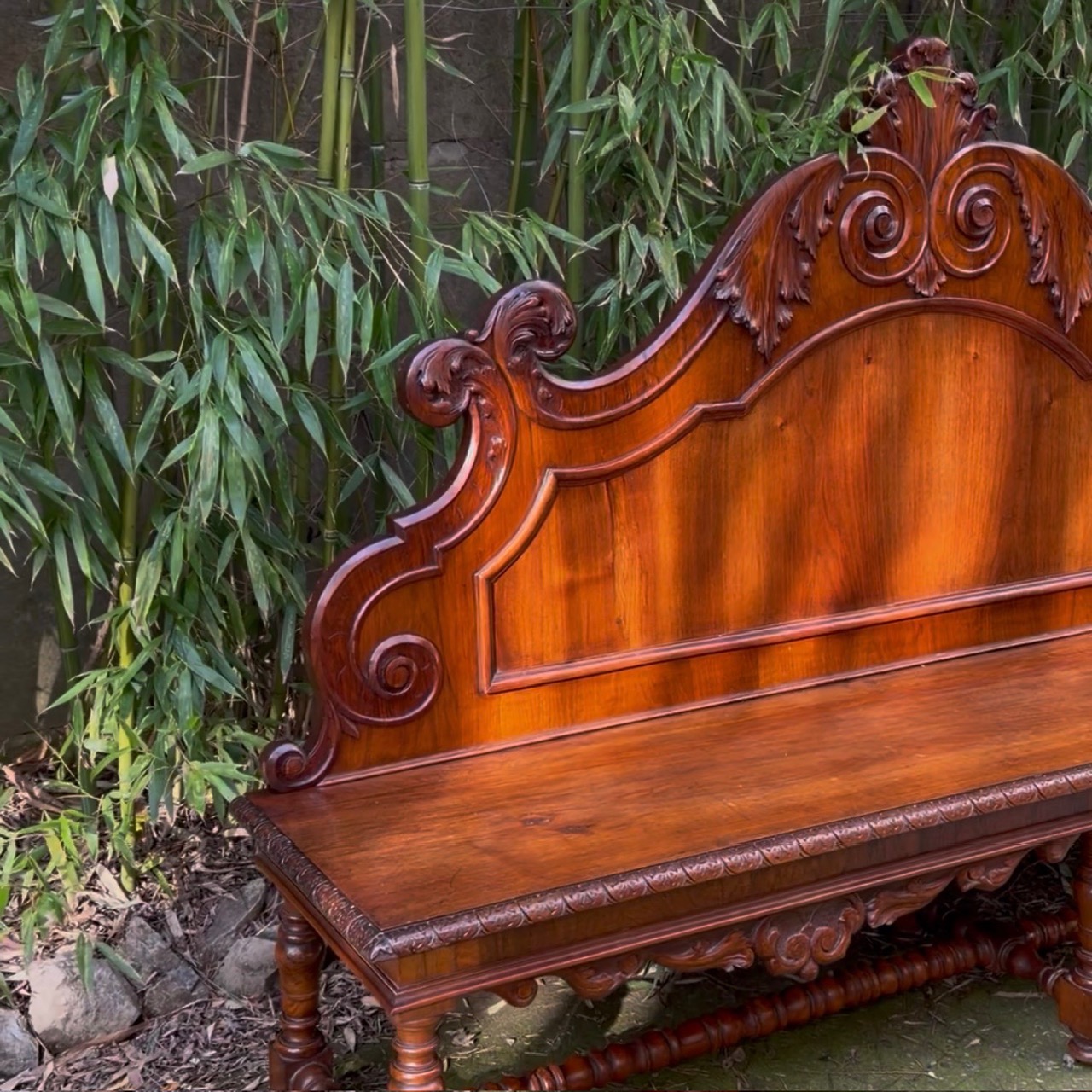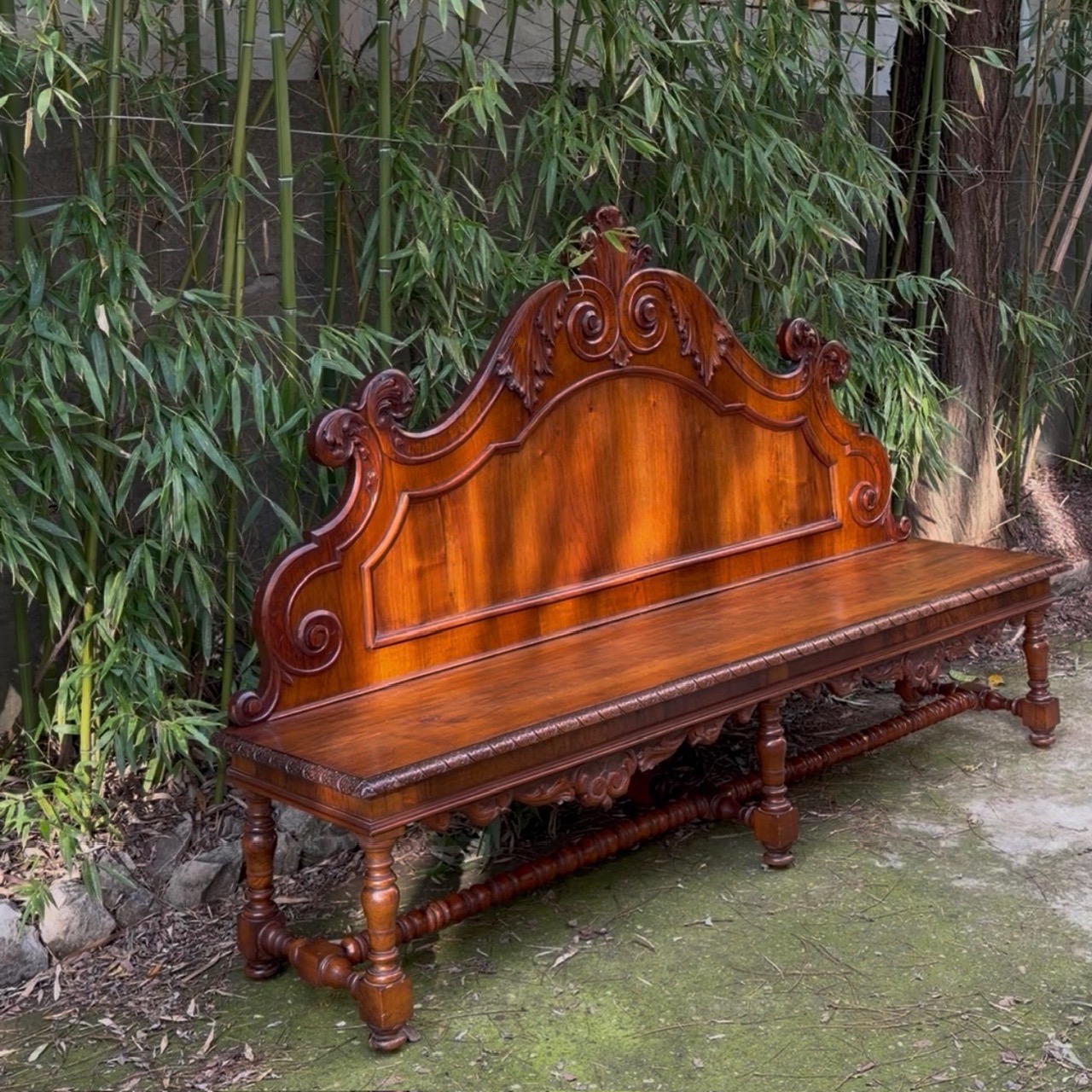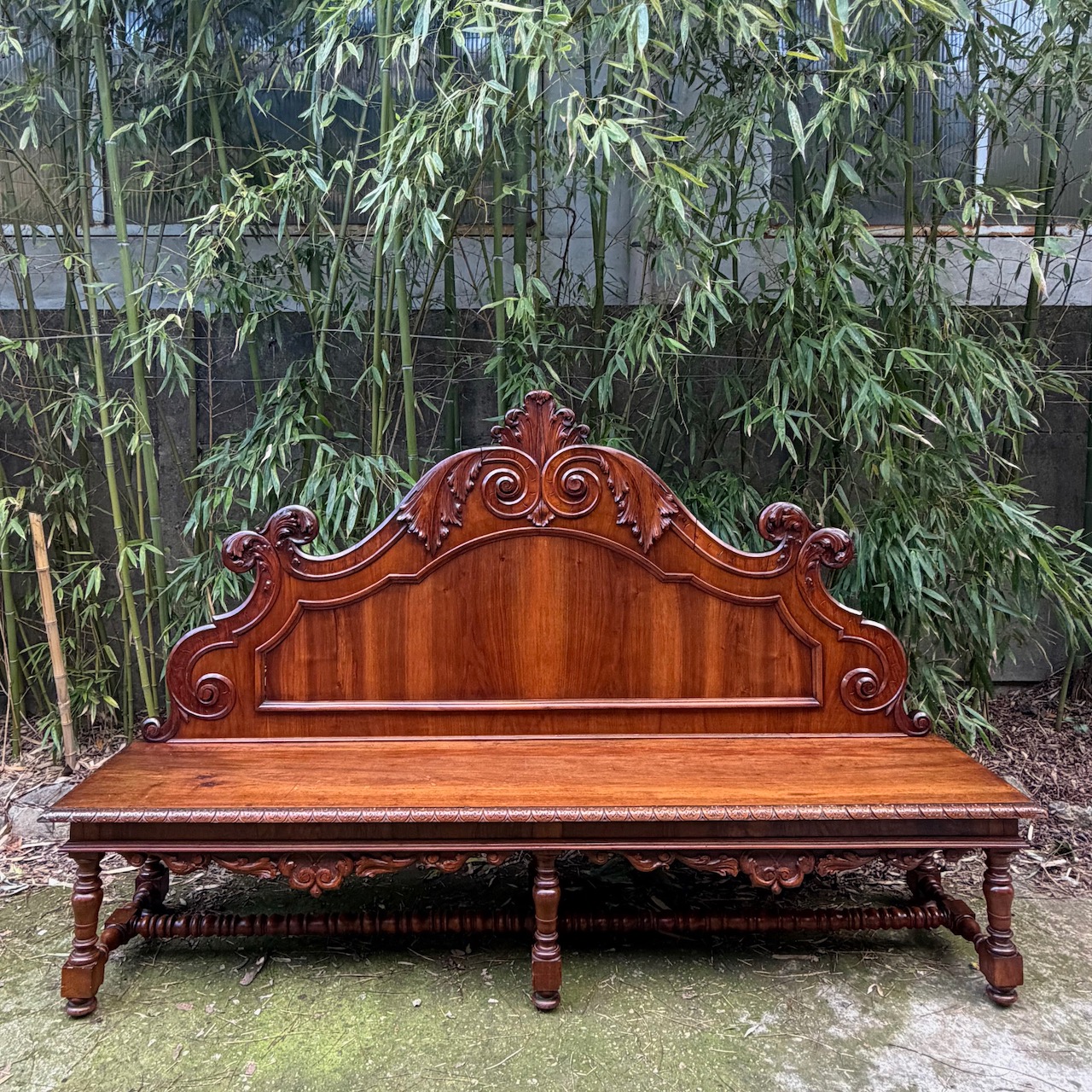 Grande divano panca da parata in noce, spalliera intagliata e sagomata a volute e girali, gambe tornite riunite da traversa. Toscana metà sec. XIX