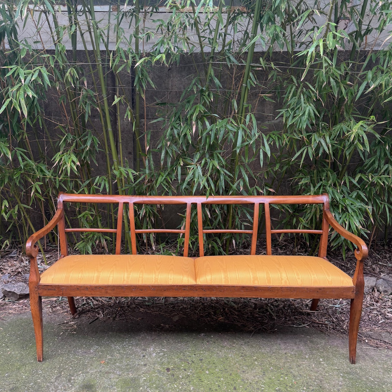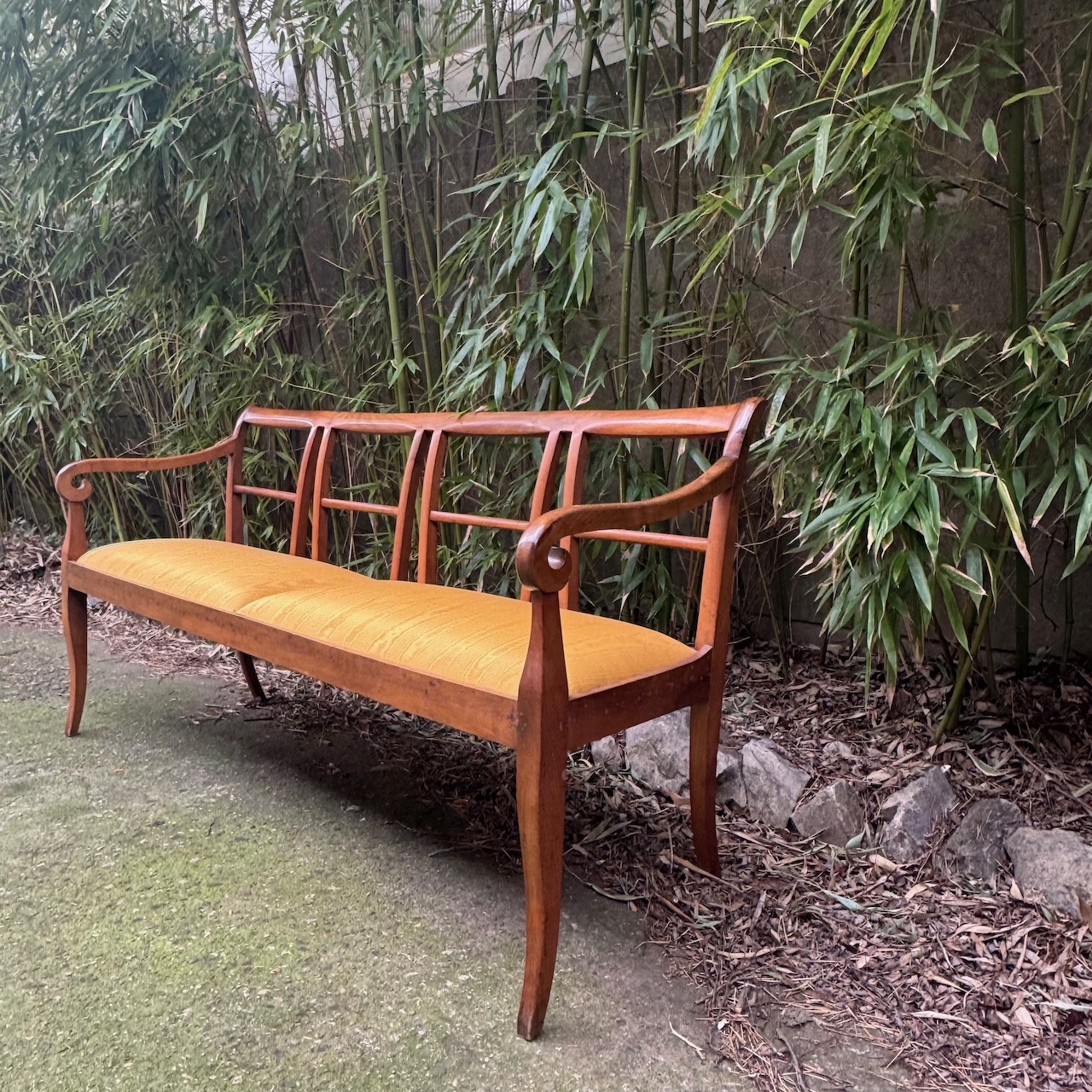 Grande divano panca direttorio in noce a patina bionda, braccioli ricurvi e seduta imbottina giallo senape. Italia, sec. XVIII