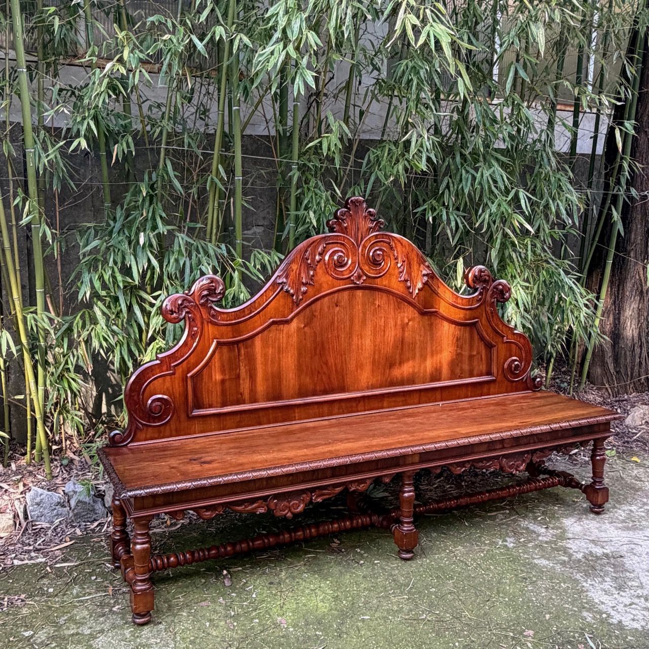 Grande panca da parete, sei gambe riunite da traversa in masso di noce tornito a rochetto. Toscana, sec. XIX