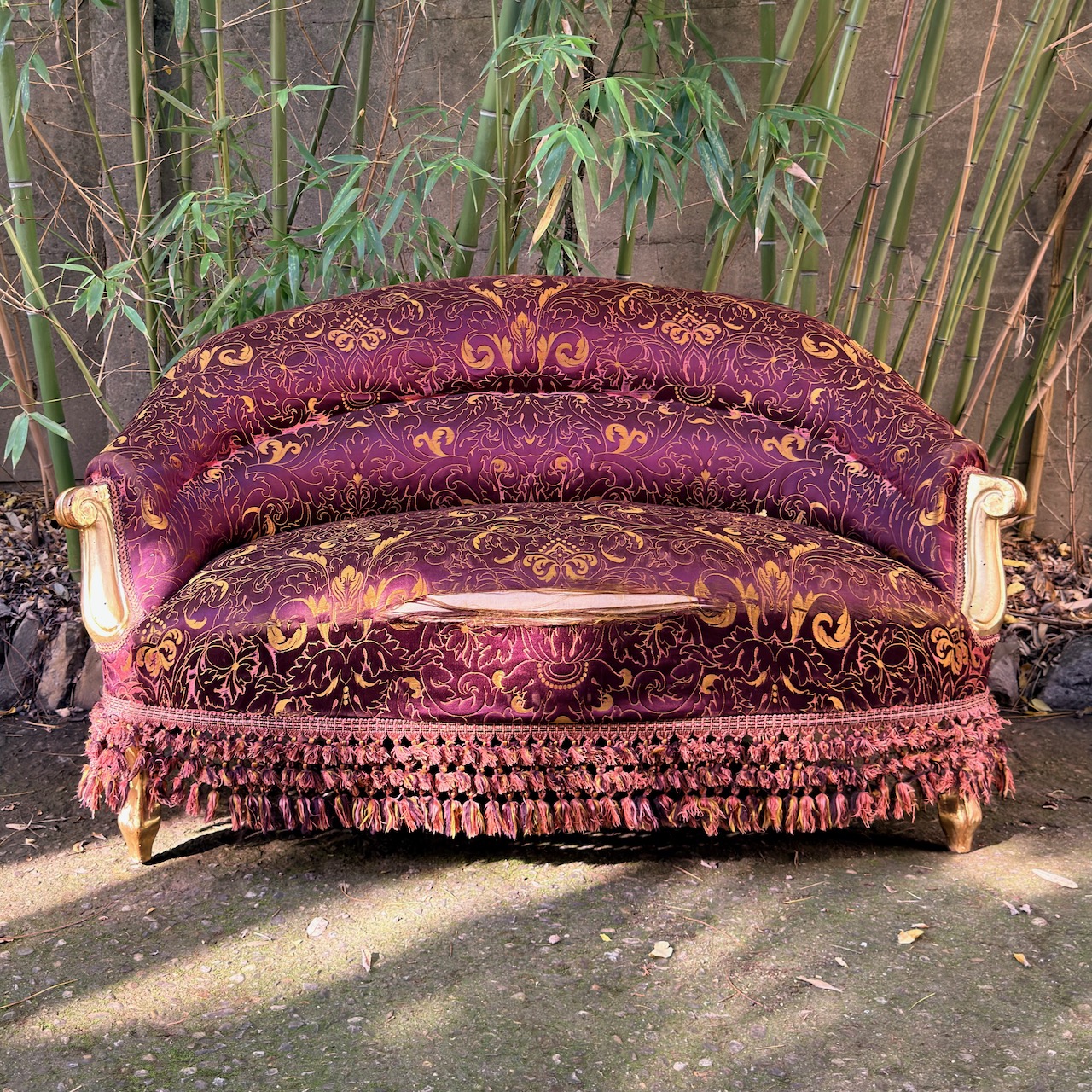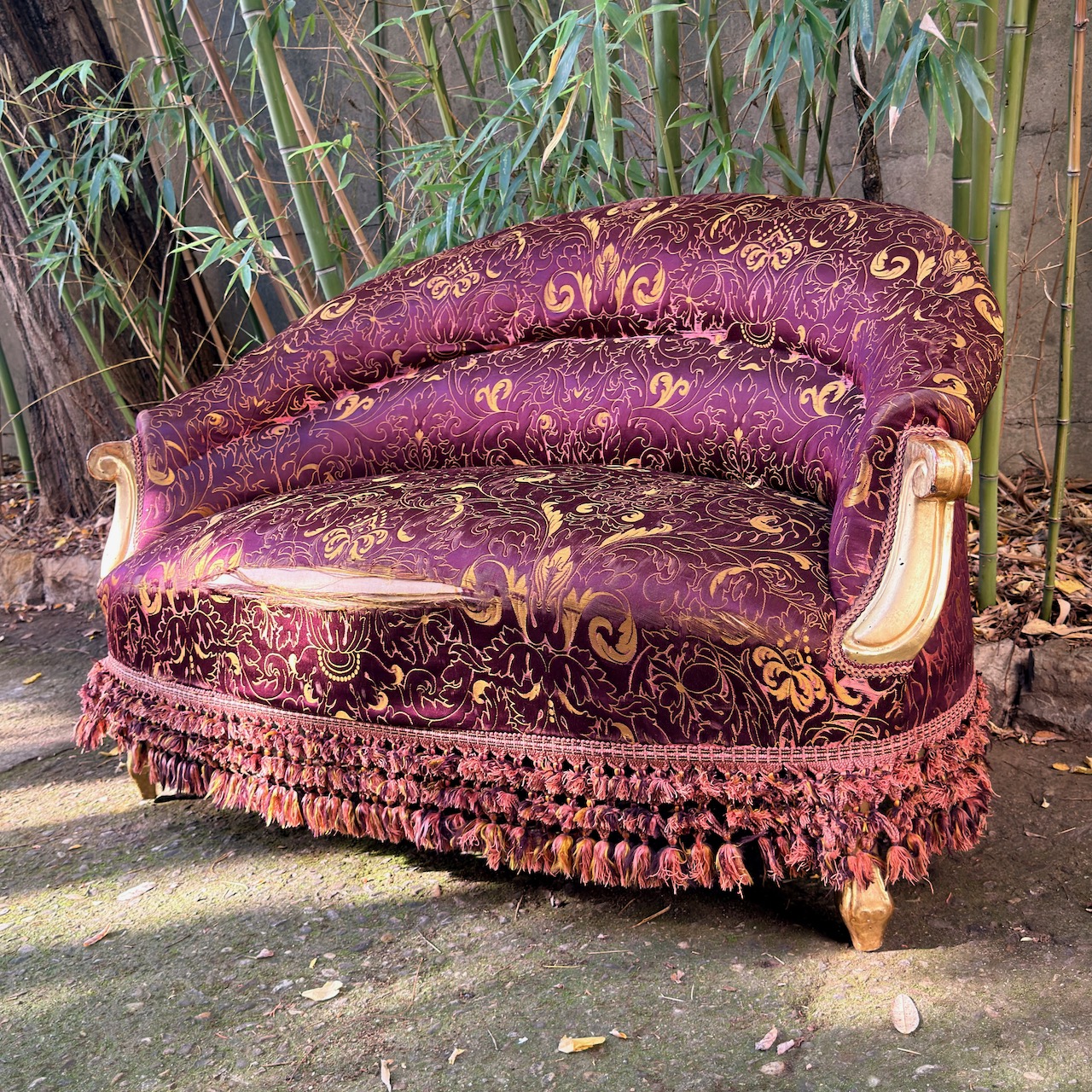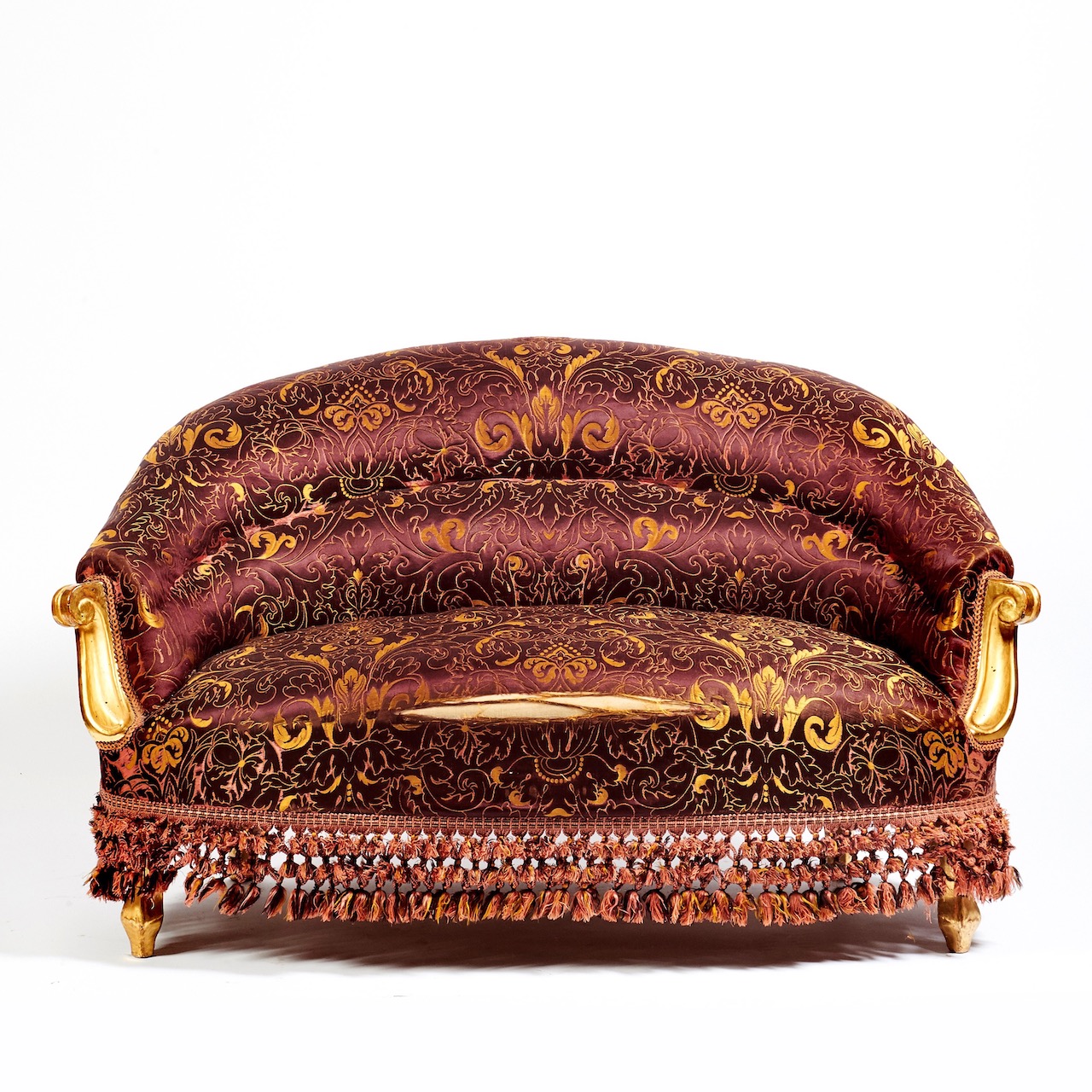 Piccolo divano Napoleone III, seta damasco bordeaux e pappine. Italia, sec. XIX