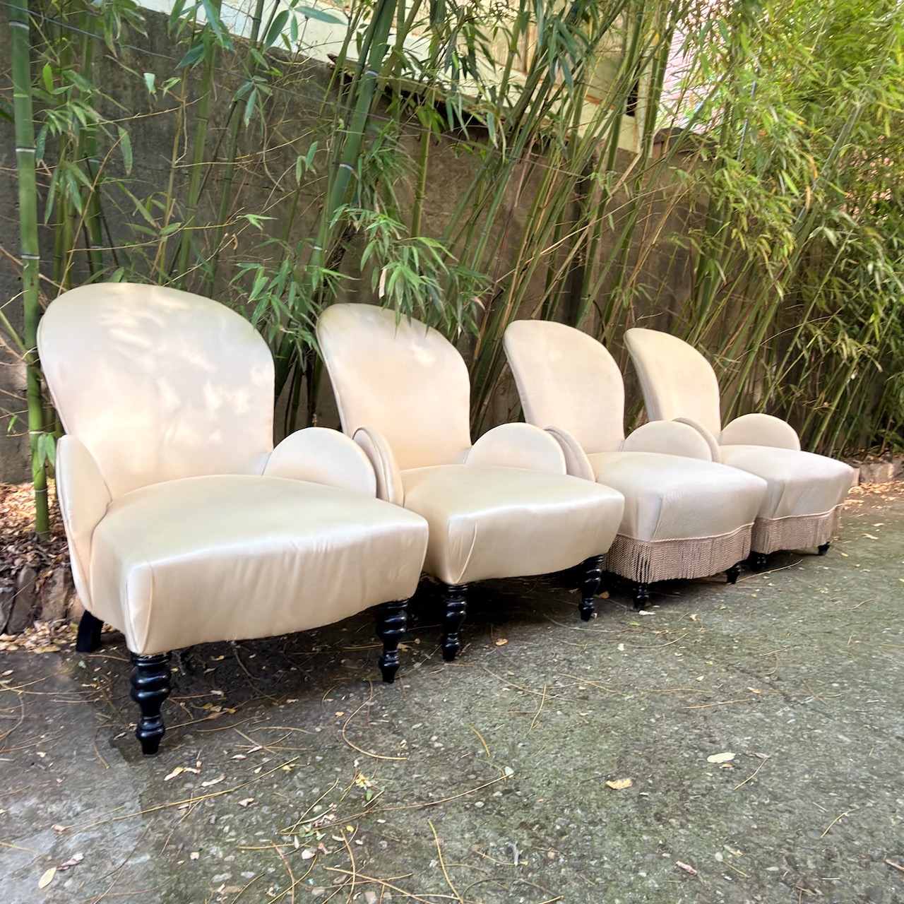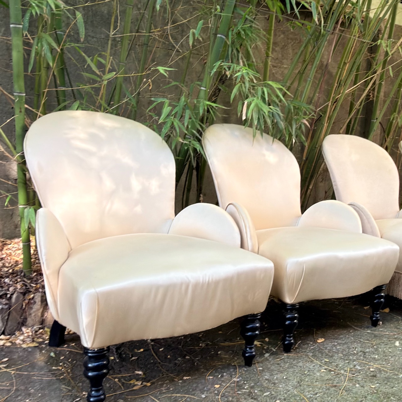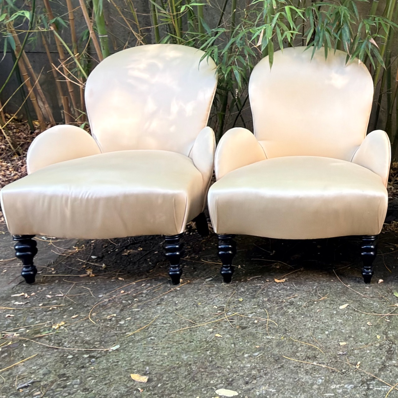 Coppia poltrone imbottite e rivestite in seta color champagne, piedini in legno ebanizzato, anteriori torniti, i posteriori a sciabola. Italia, sec. XX