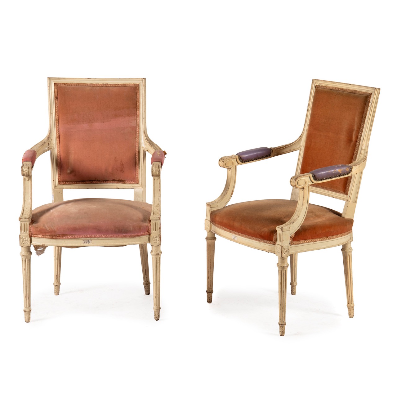 Coppia poltrone Luigi XVI, in legno laccato burro, gambe scanalate, seduta e schienale rivestite in velluto rosa antico. Italia, sec. XIX