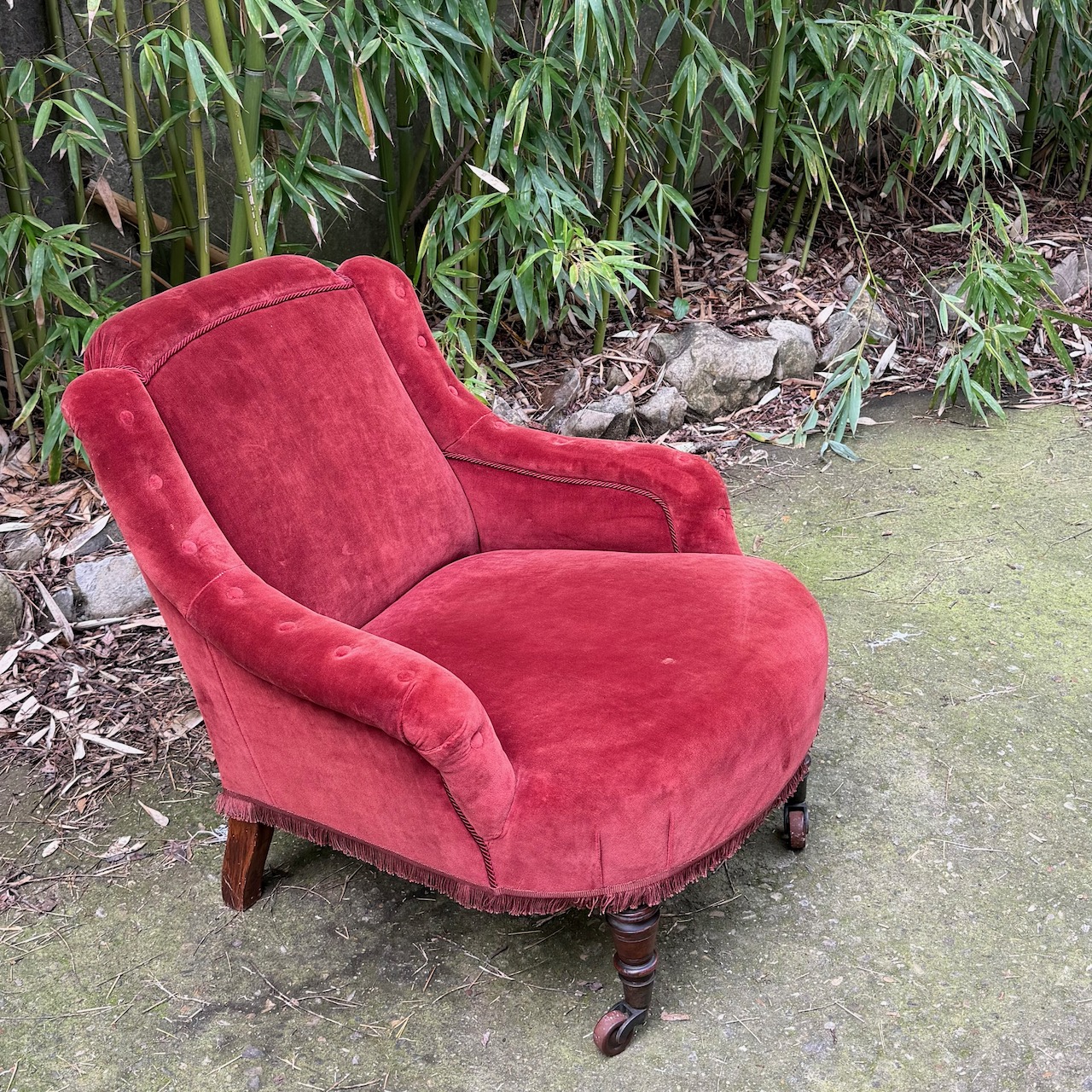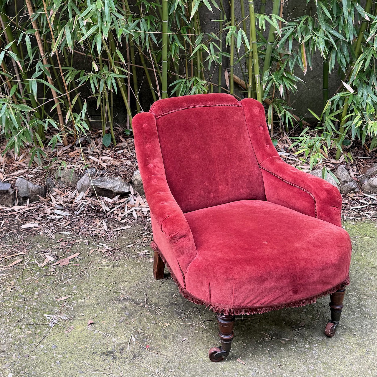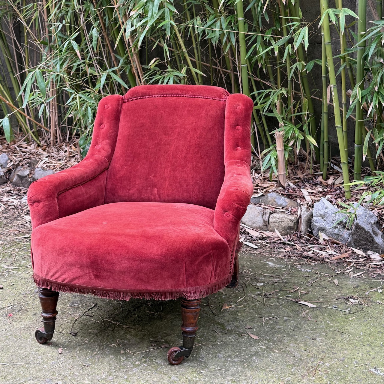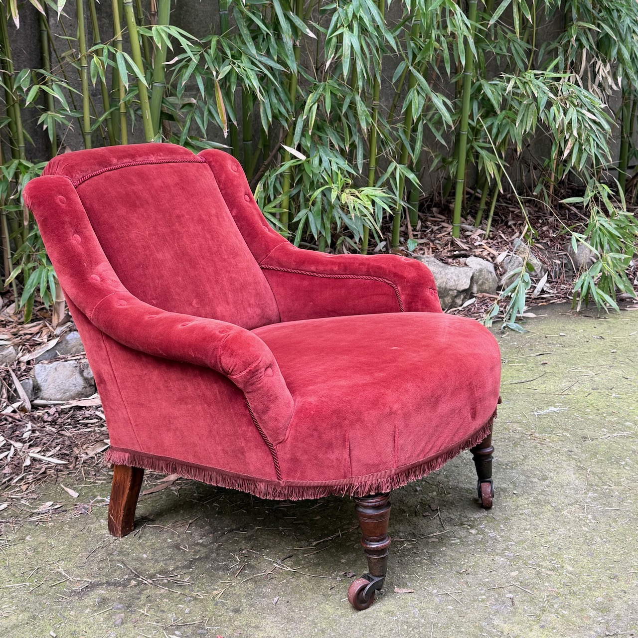 Poltrona a pozzetto in velluto rosso cardinale, piedi torniti su rotelle. Italia, sec. XIX