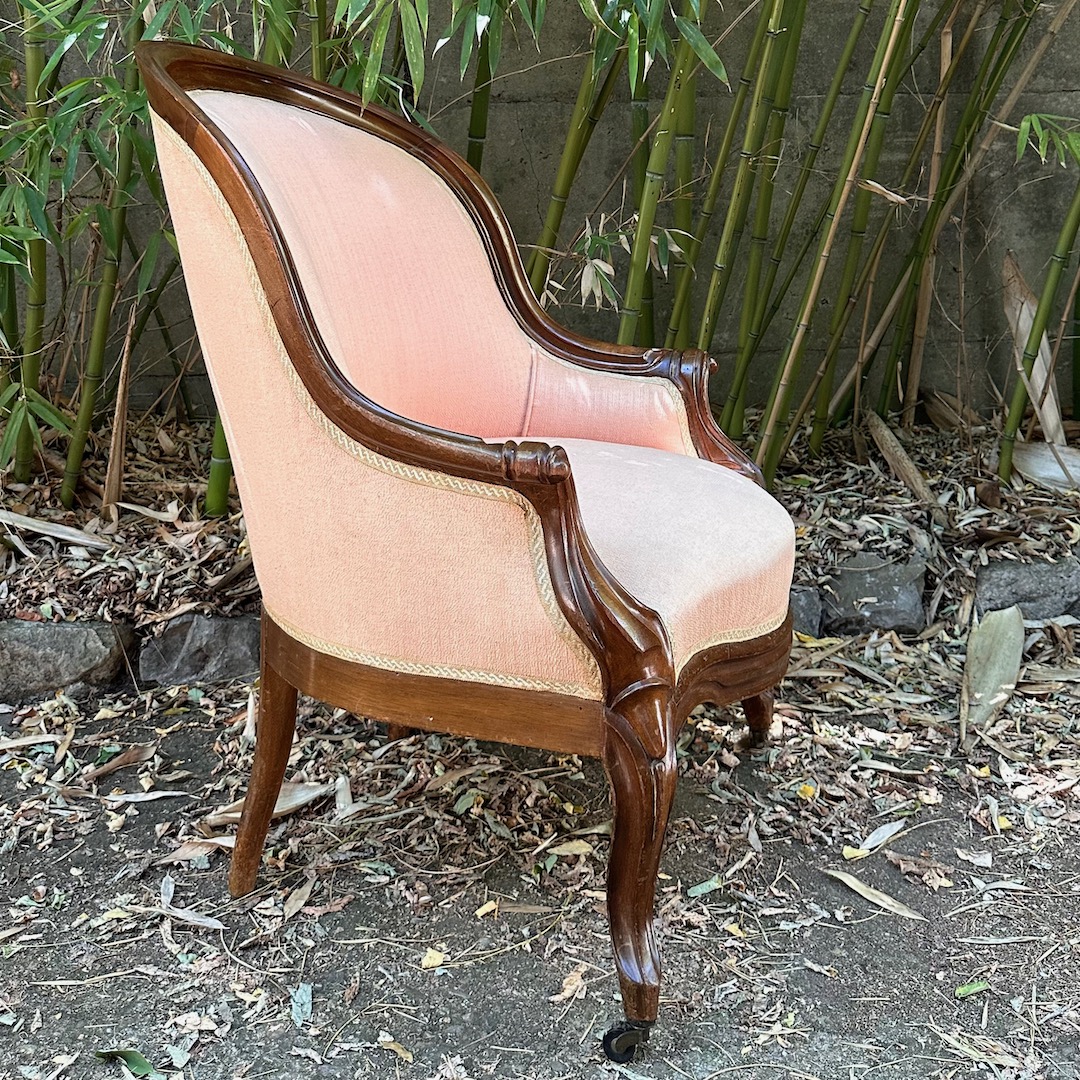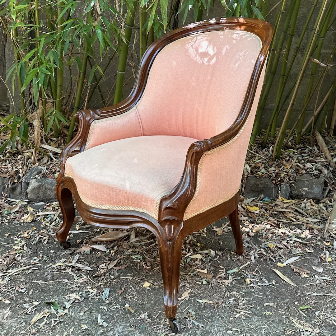 Poltrona a pozzetto, in noce sagomato, imbottita e rivestita in seta rosa. Italia, sec. XIX