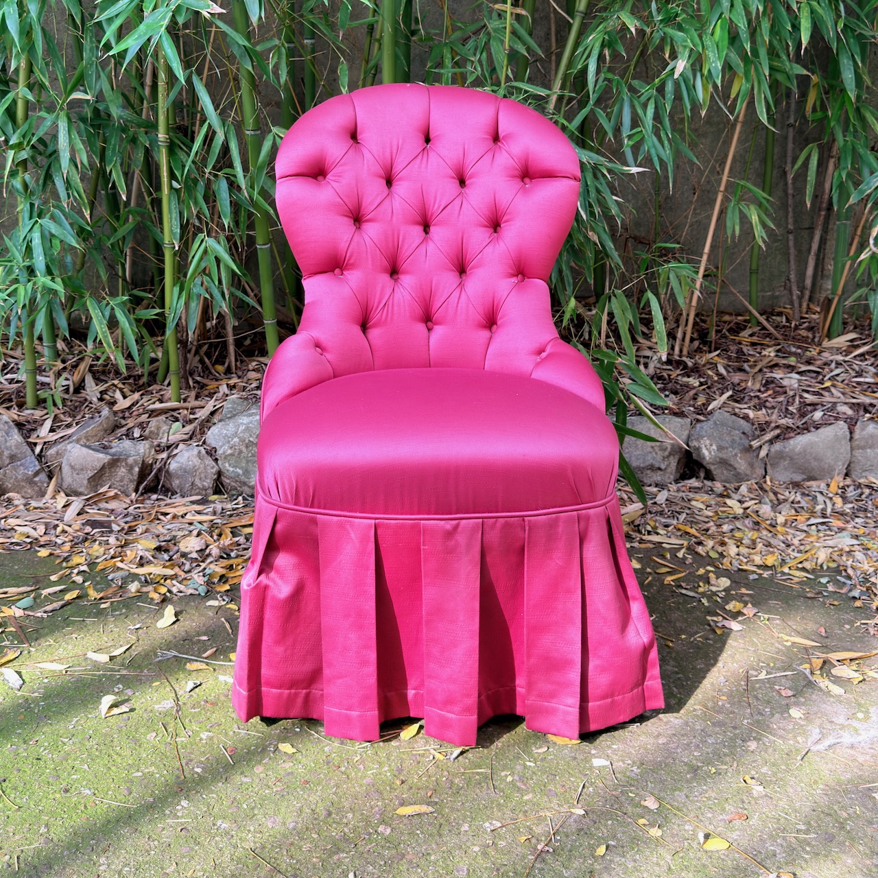 Poltrona bassa imbottita, vestita in raso capitonné rosa magenta. Italia, sec. XX