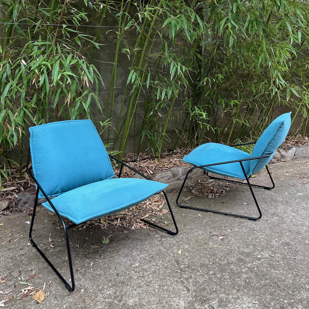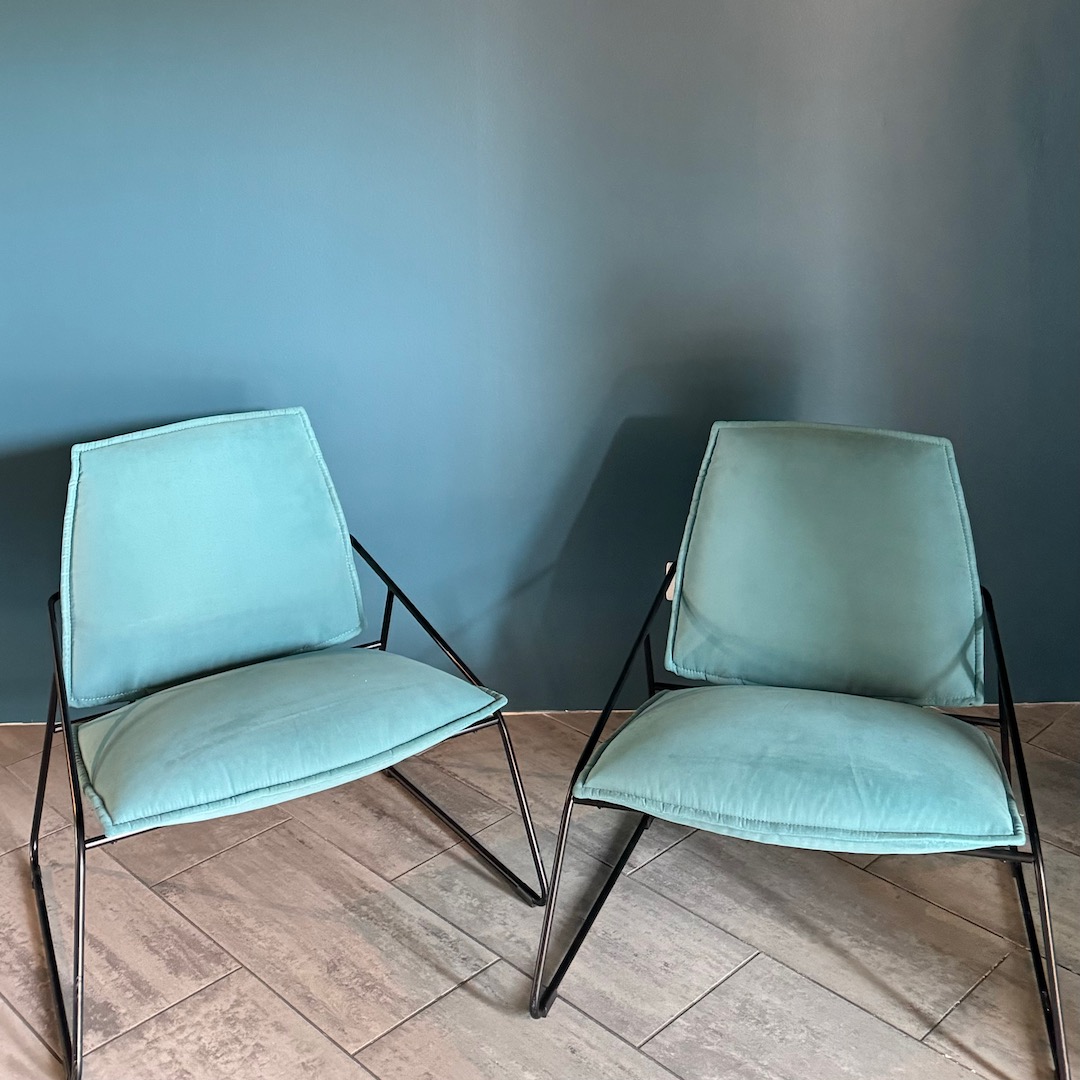 Coppia di poltrone in ferro a vernice nera e seduta in tela carta zucchero. Italia, 1980 circa
