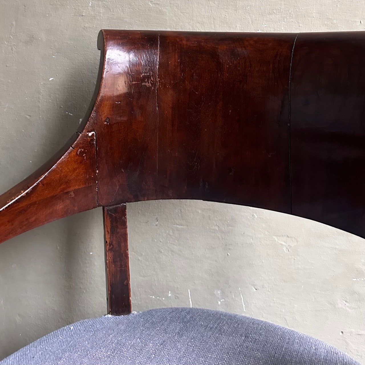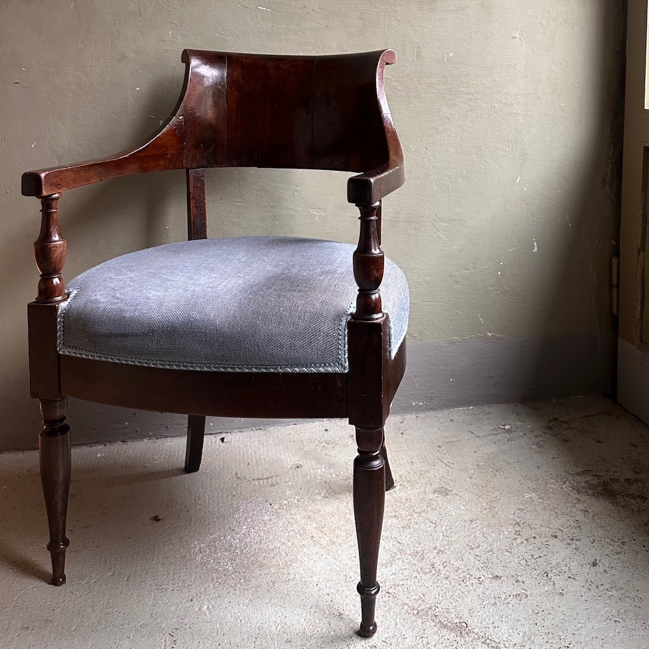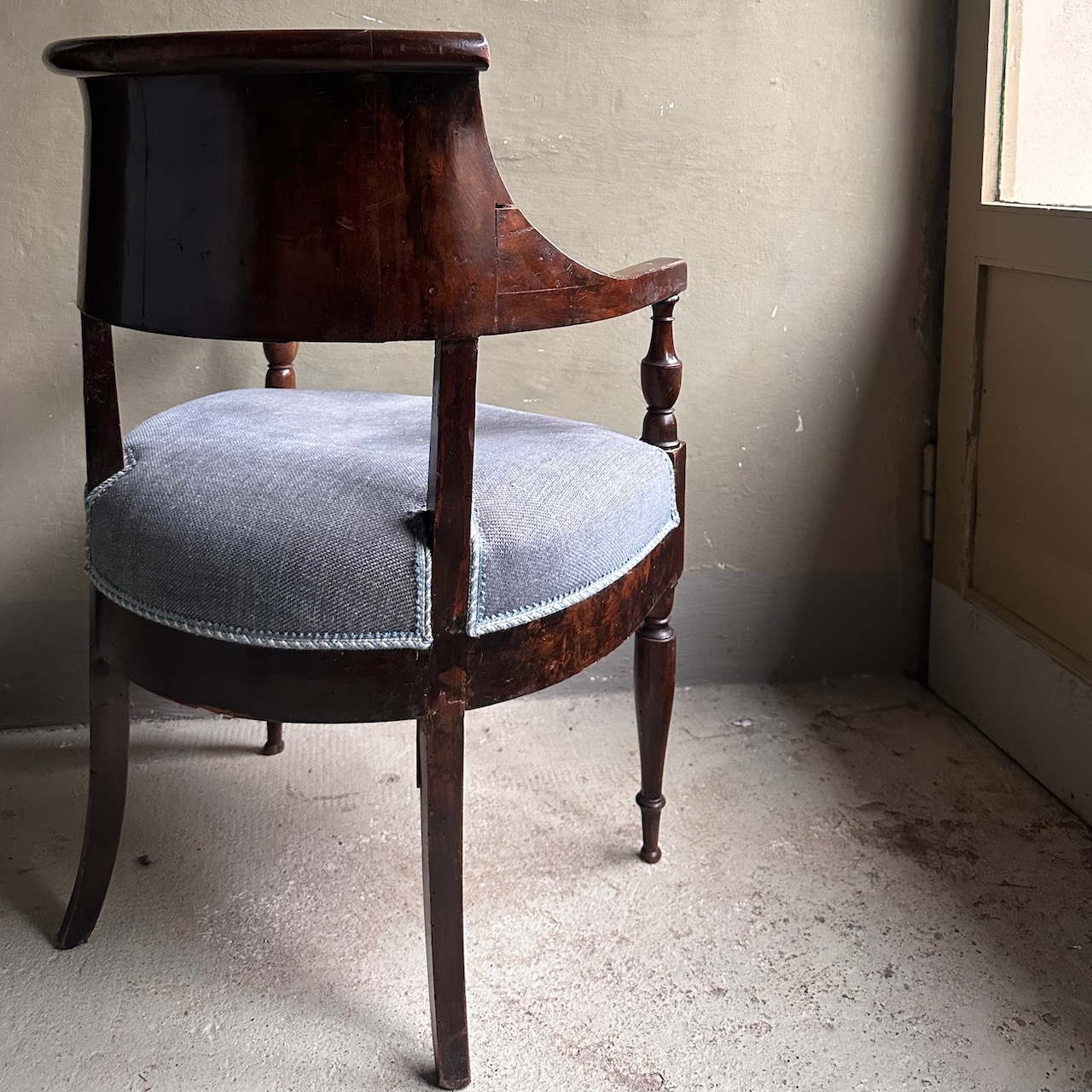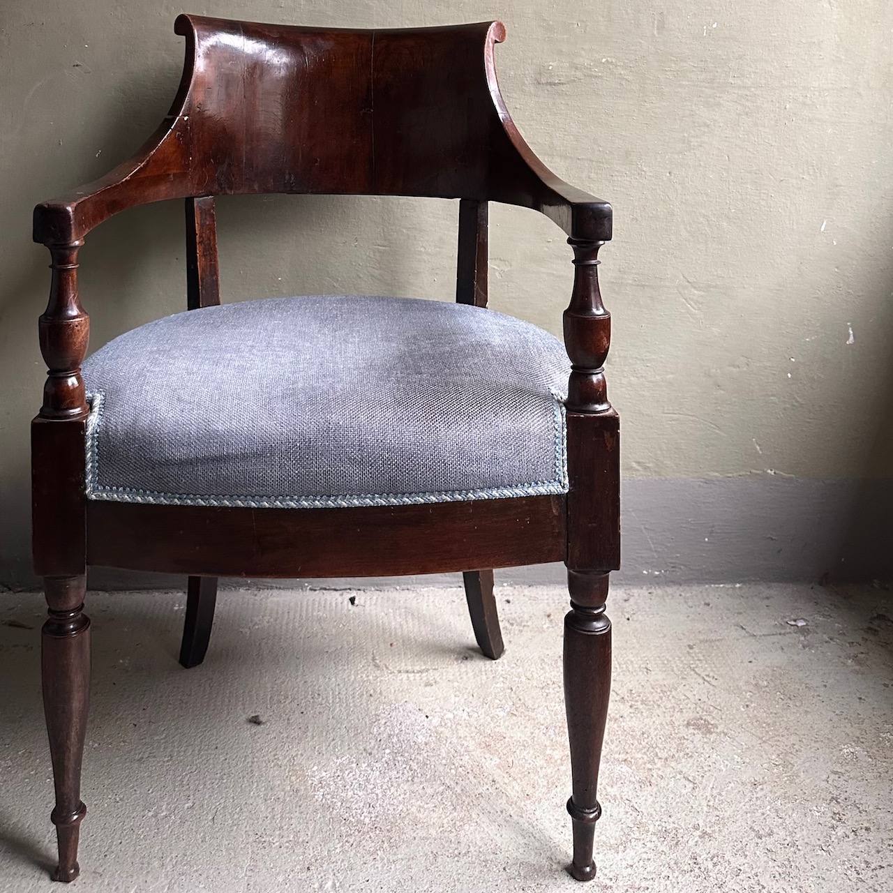 Poltrona Neoclassica Impero in noce a patina bruna, schienale reclinato a ricciolo, gambe anteriori a birillo, seduta rivestita in tela carta zucchero. Italia, inizio sec. XIX