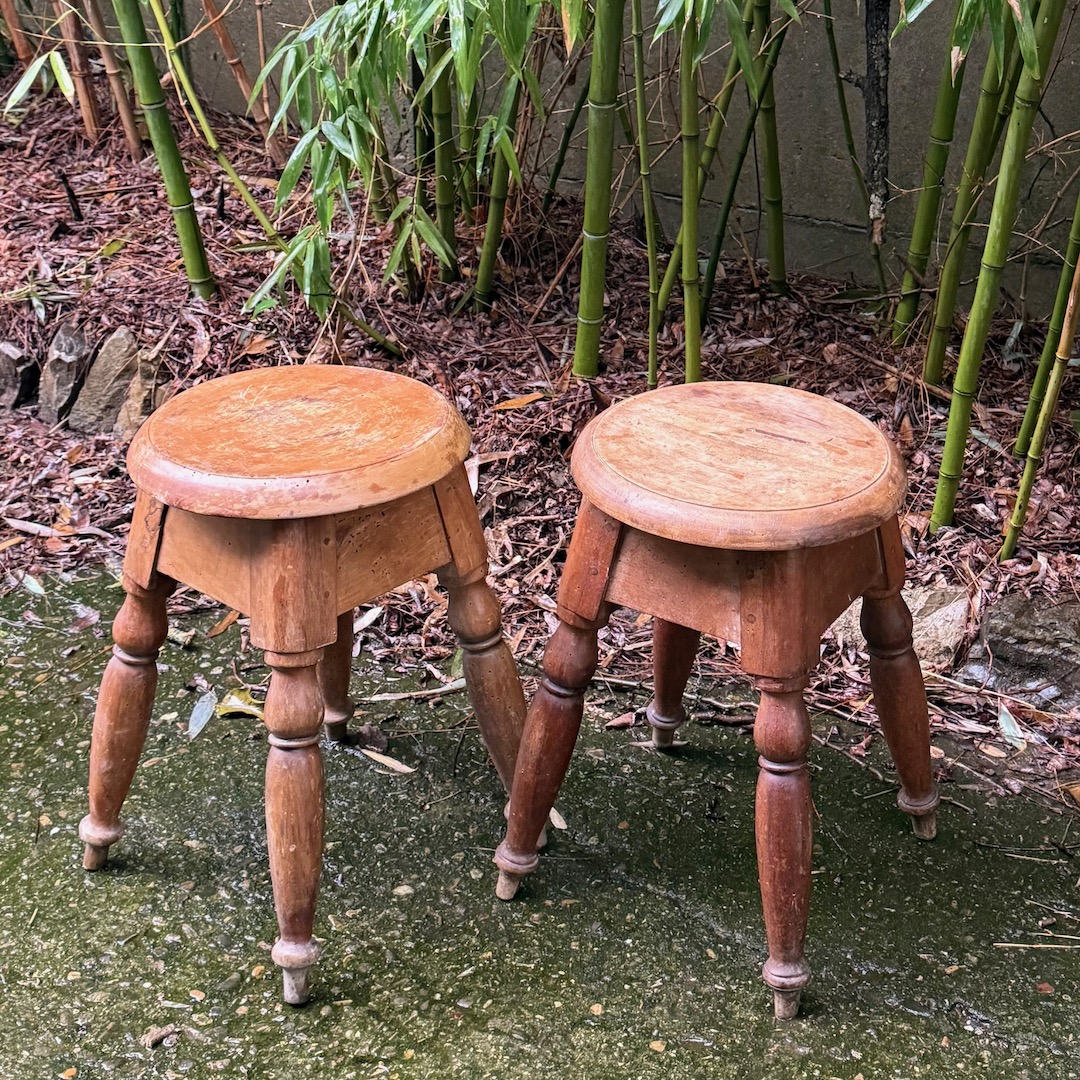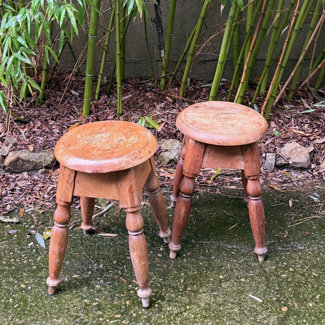 Coppia di sgabelli panchetti rotondi, gambe tornite a birillo. Toscana fine sec. XIX