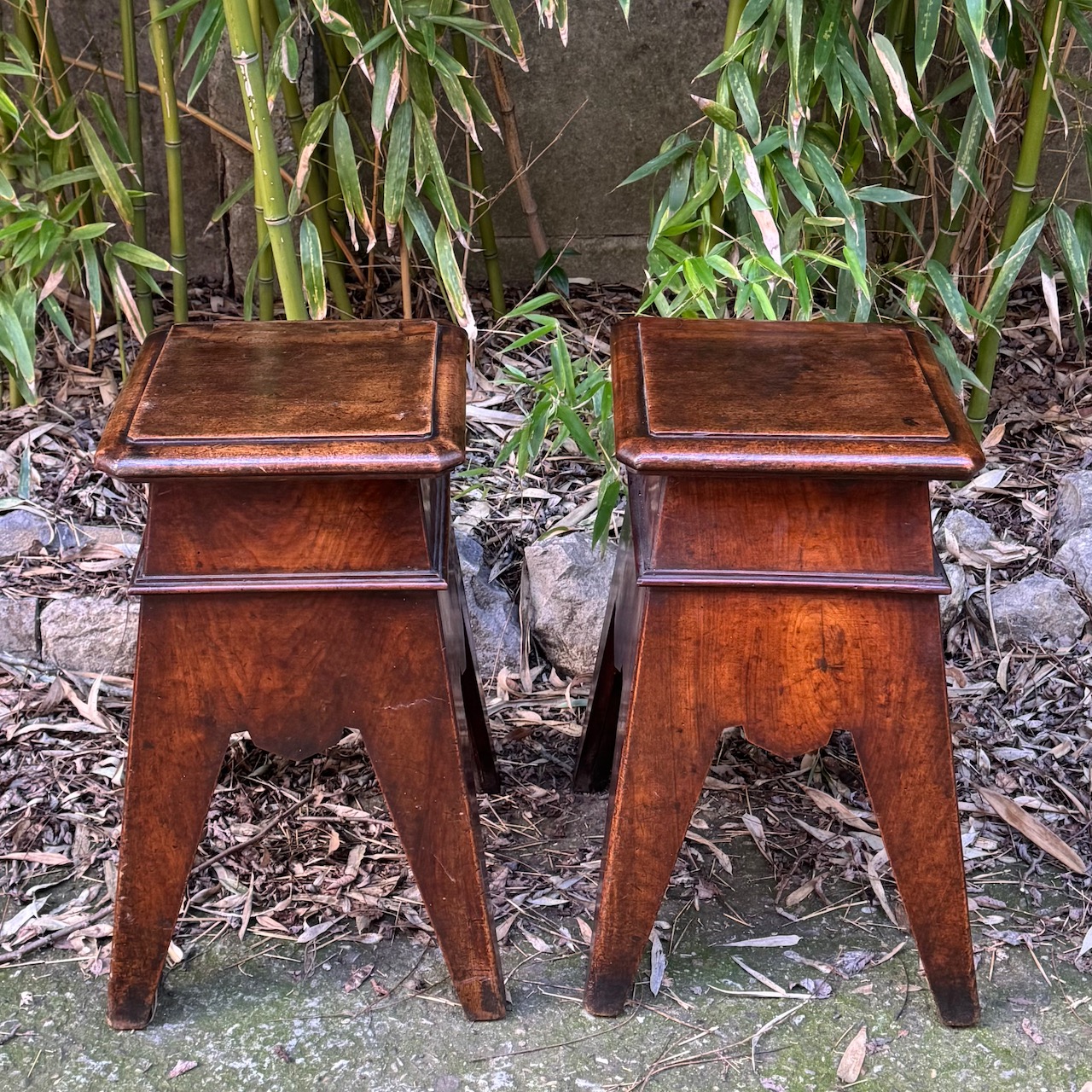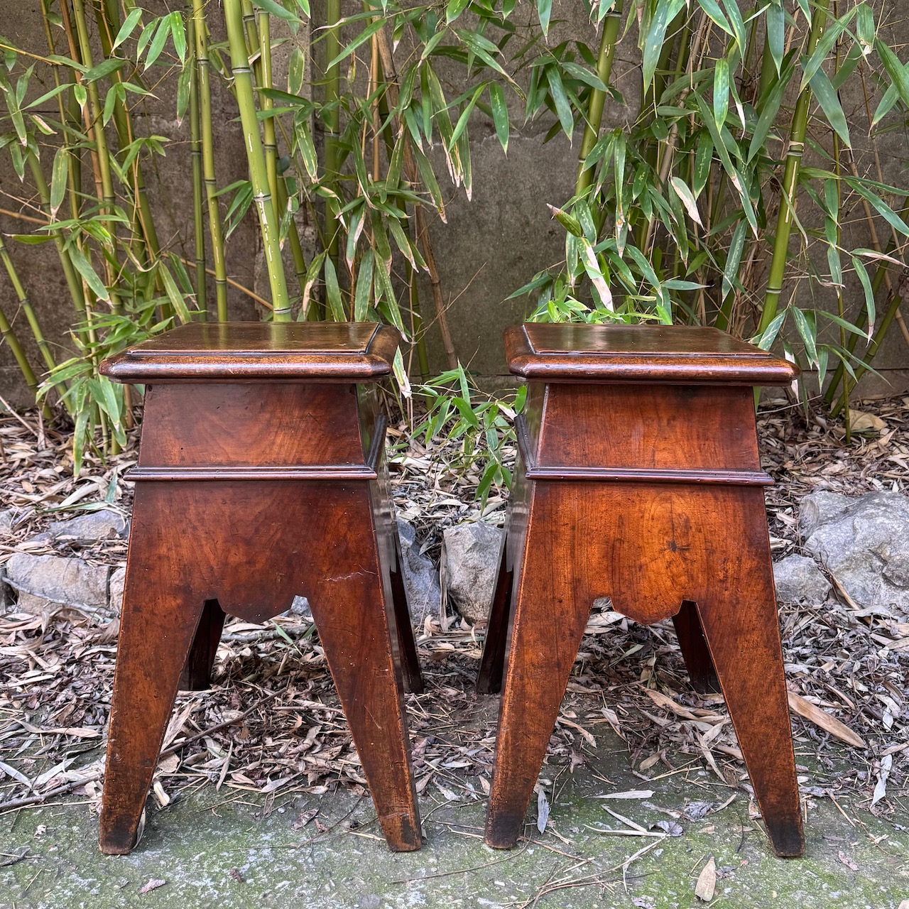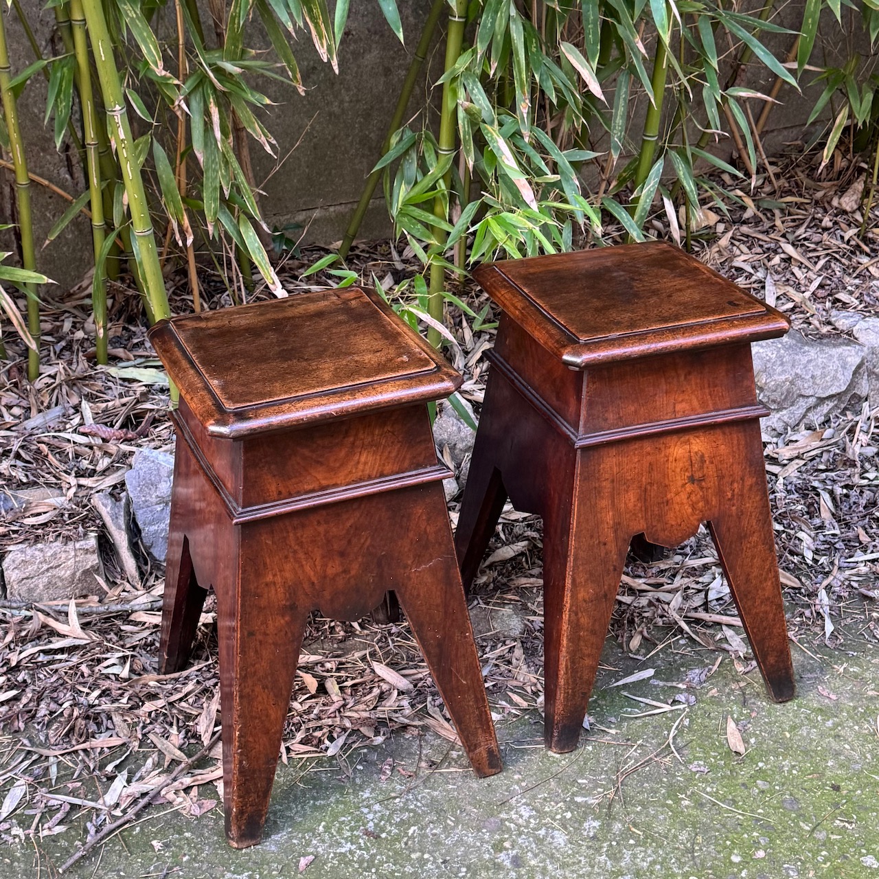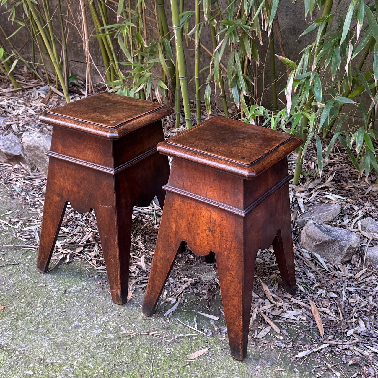 Coppia di tavolini sgabelli in legno di noce a patina bruna. Toscana, fine sec. XIX