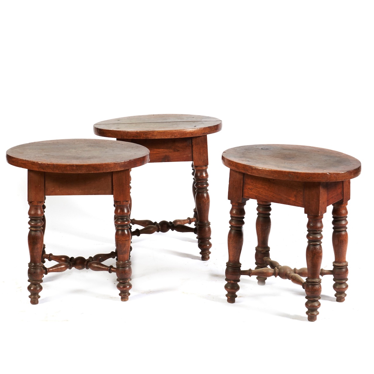 Tre panchetti in noce, seduta ovale, gambe tornite unite da traverse. Italia, sec. XX